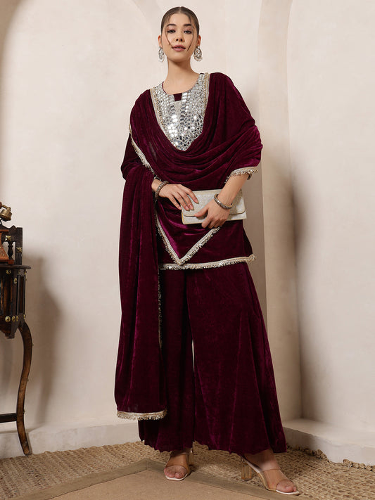Velvet Wine Kurti Embroidered Neck Patch Sharara With Dupatta Indo Western Women Co-Ord Set