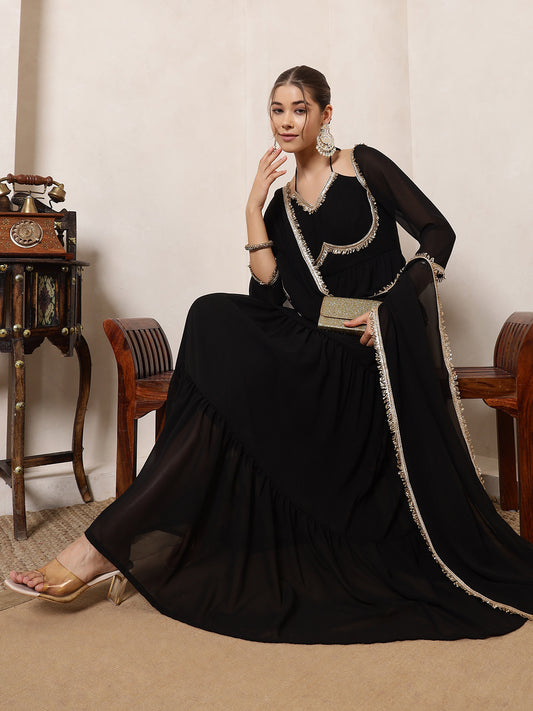 Material: Top & Sharara – Chiffon Lurex, Dupatta – Georgette Color: Black Multicolor Pattern: Paisley...