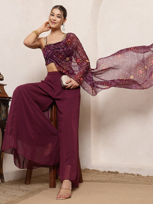 Wine Bandhani Printed Crop Top Attached Dupatta With Panel Sharara Indo Western Women Co-Ord Set