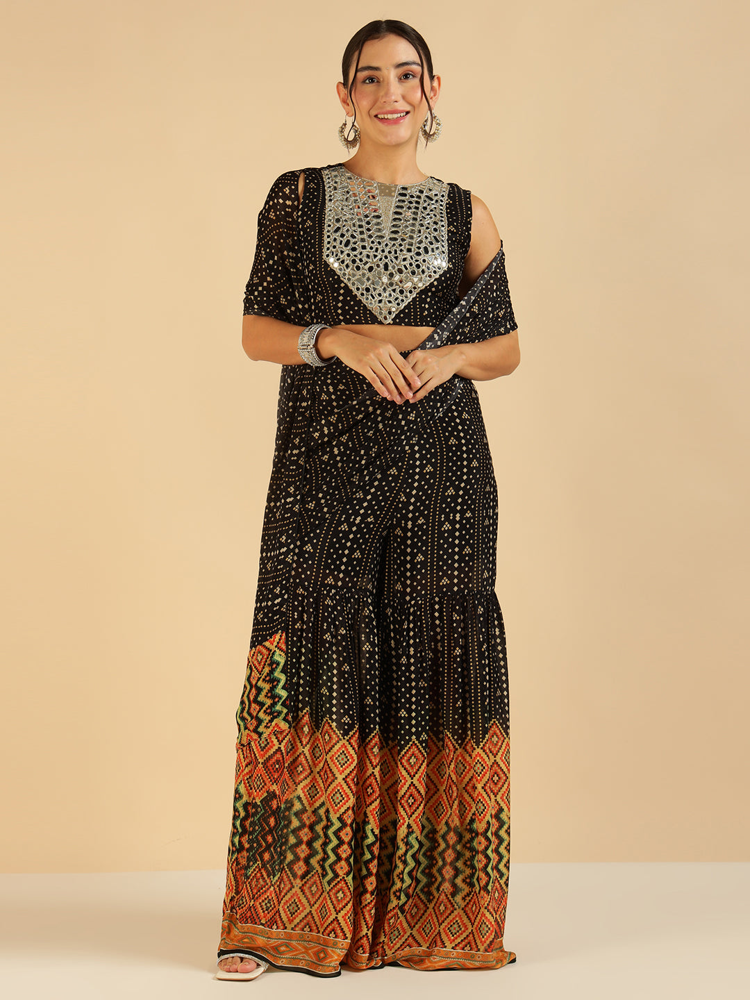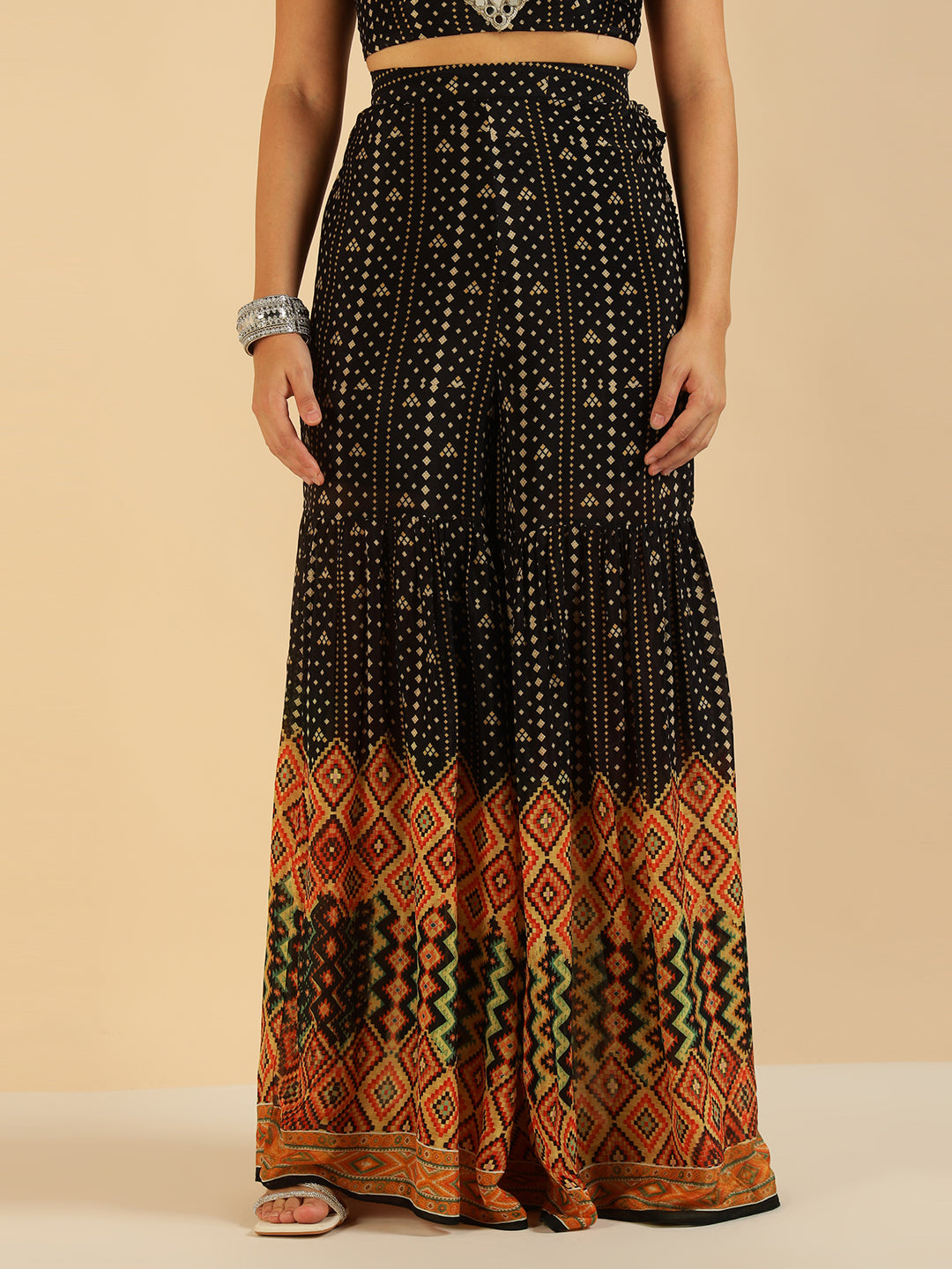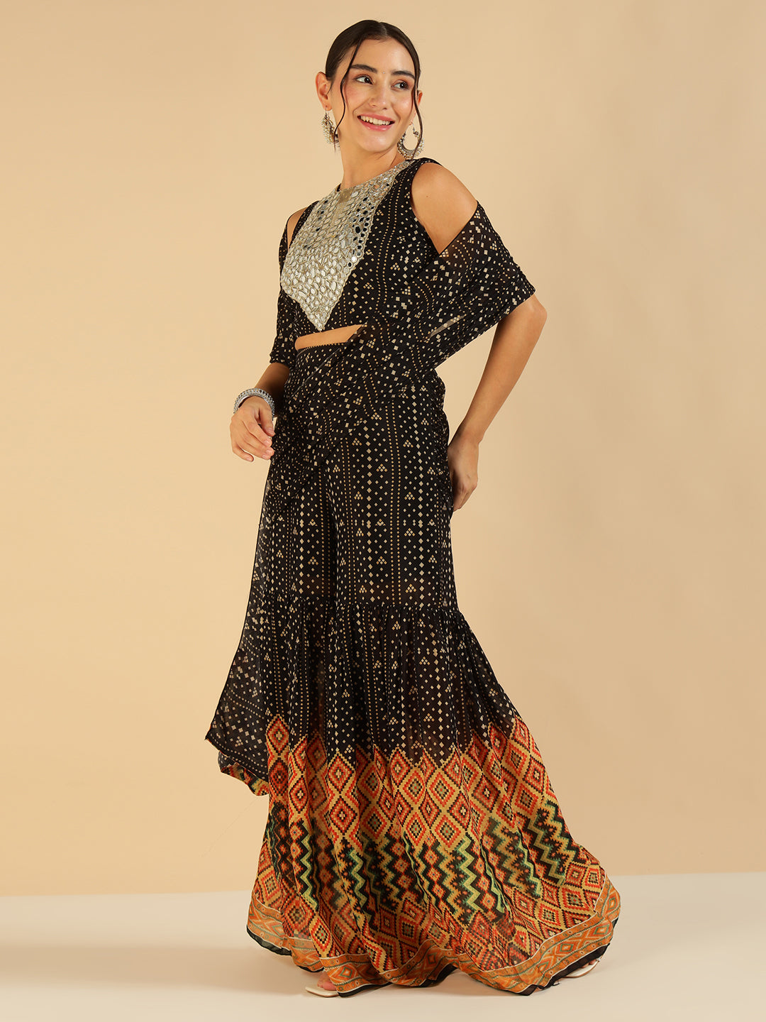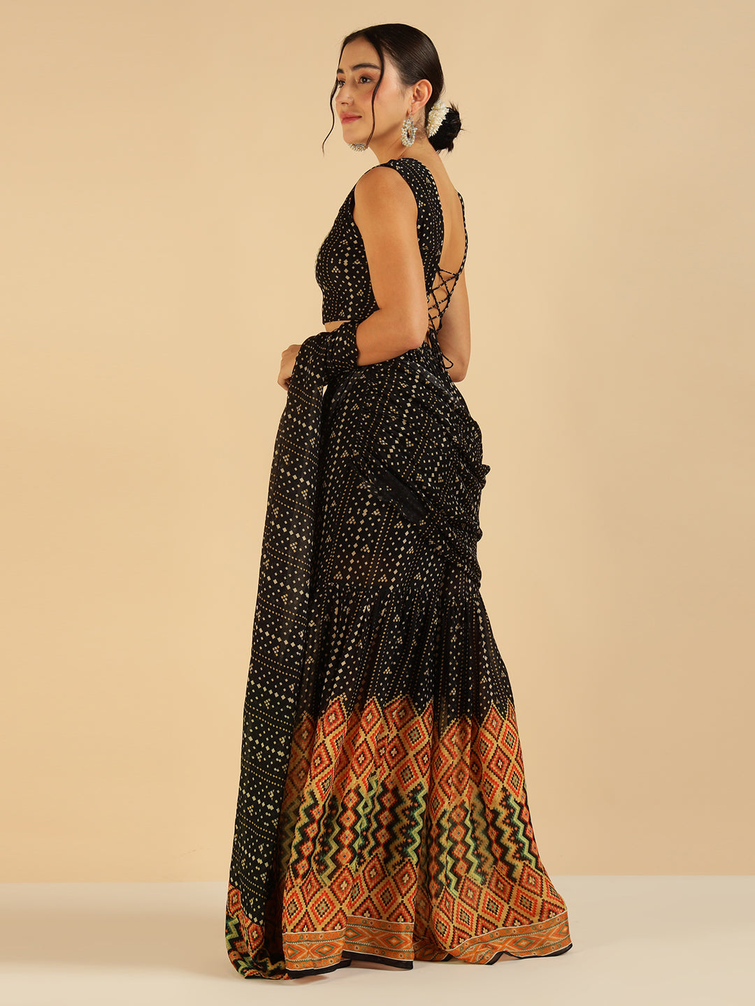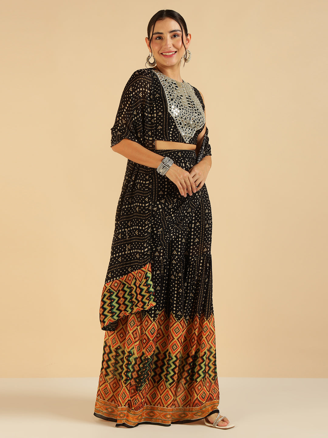 Black Bandhani Border Printed Crop Top With Palazzo Saree Fusion Co-Ord Set