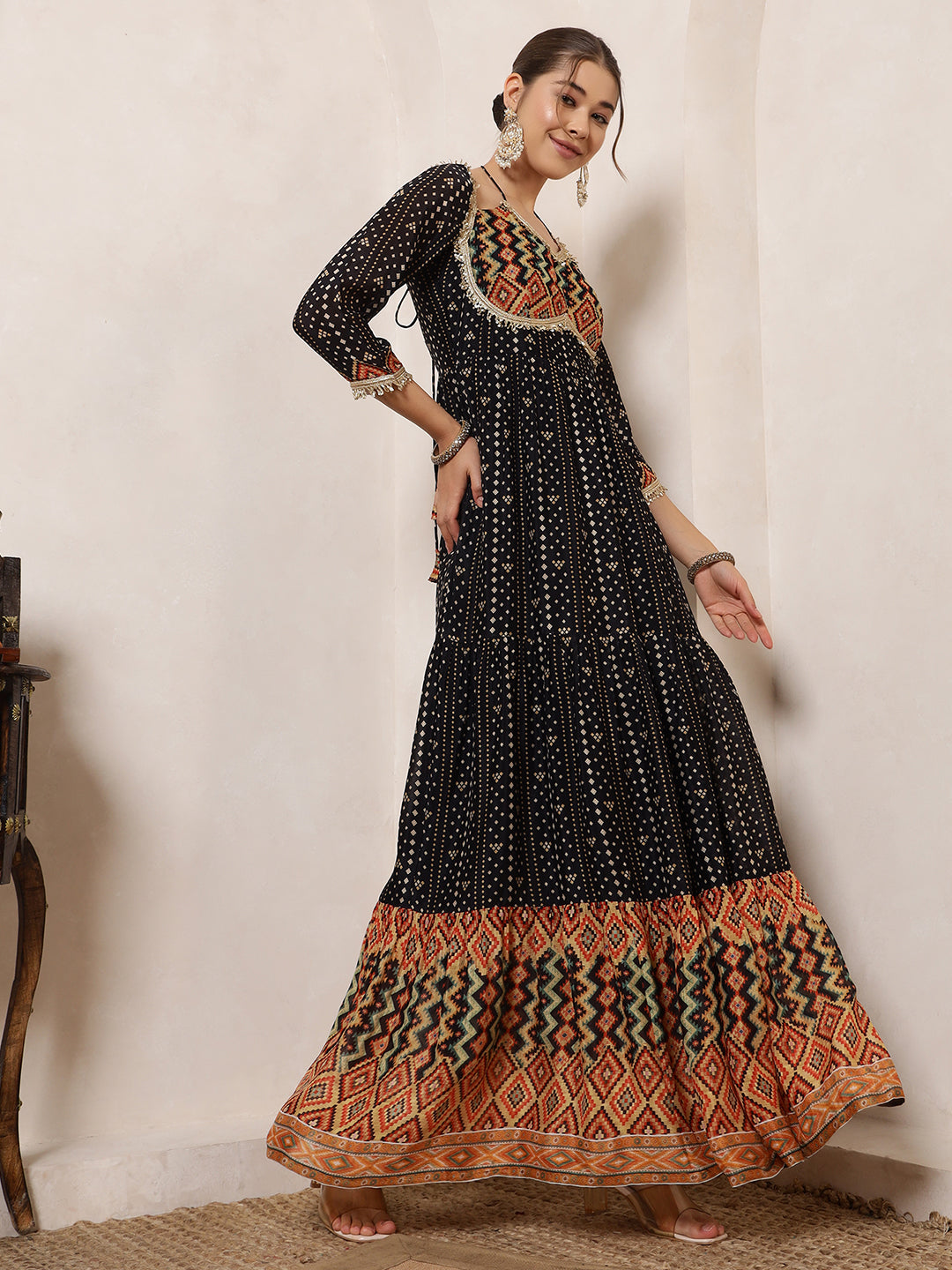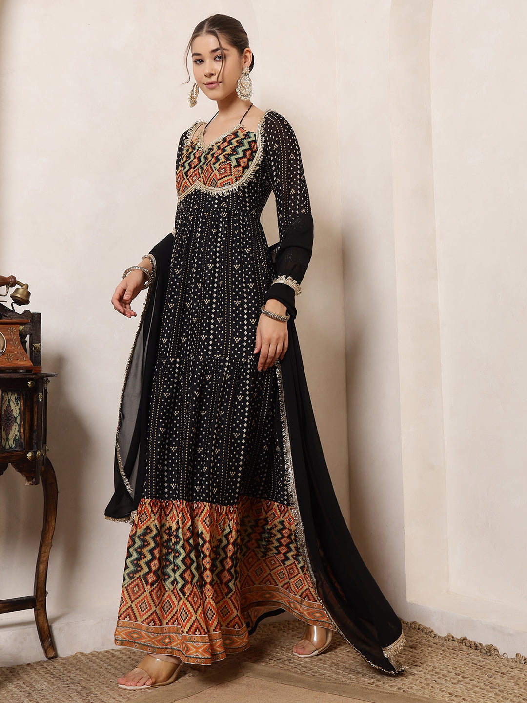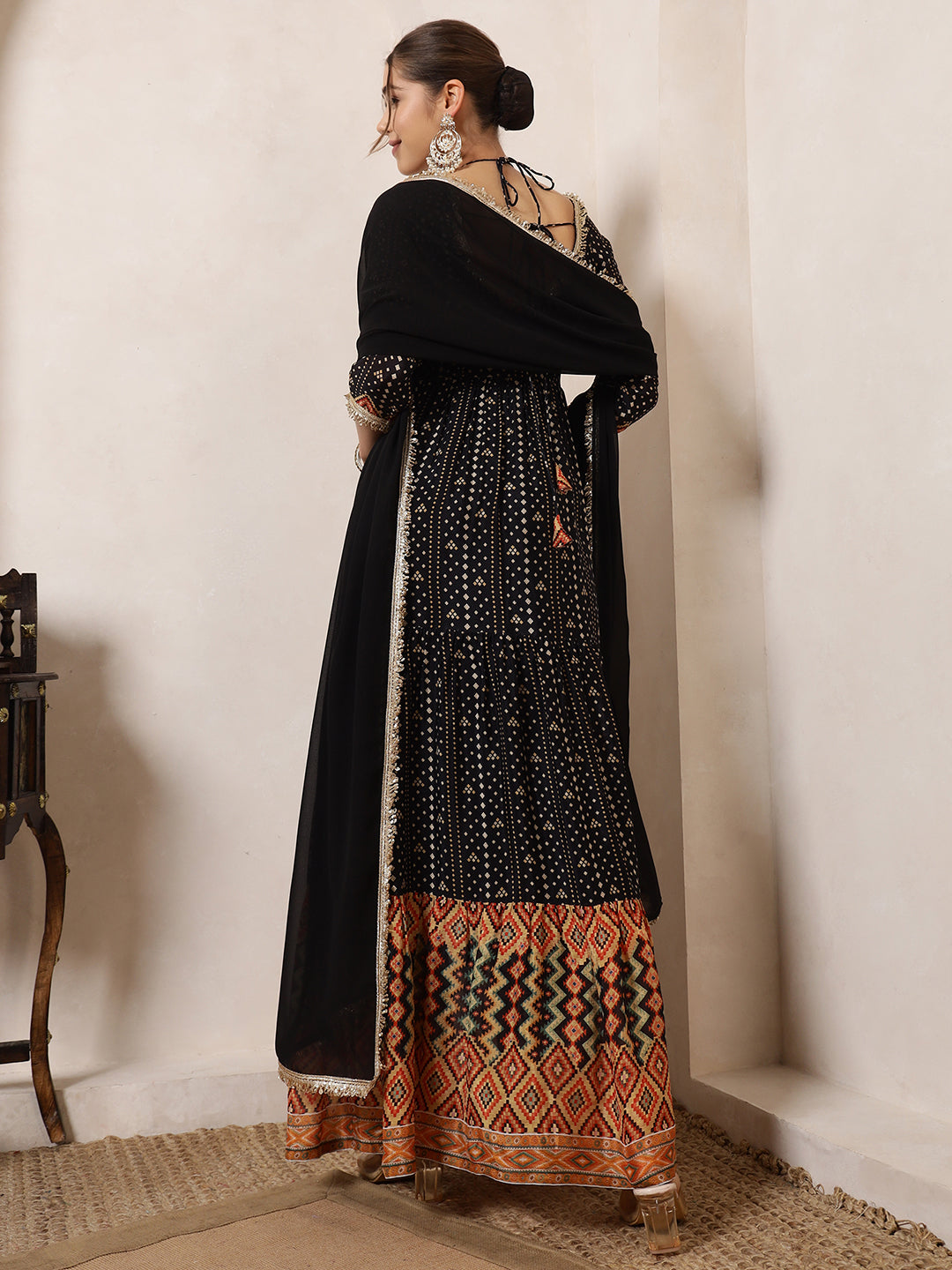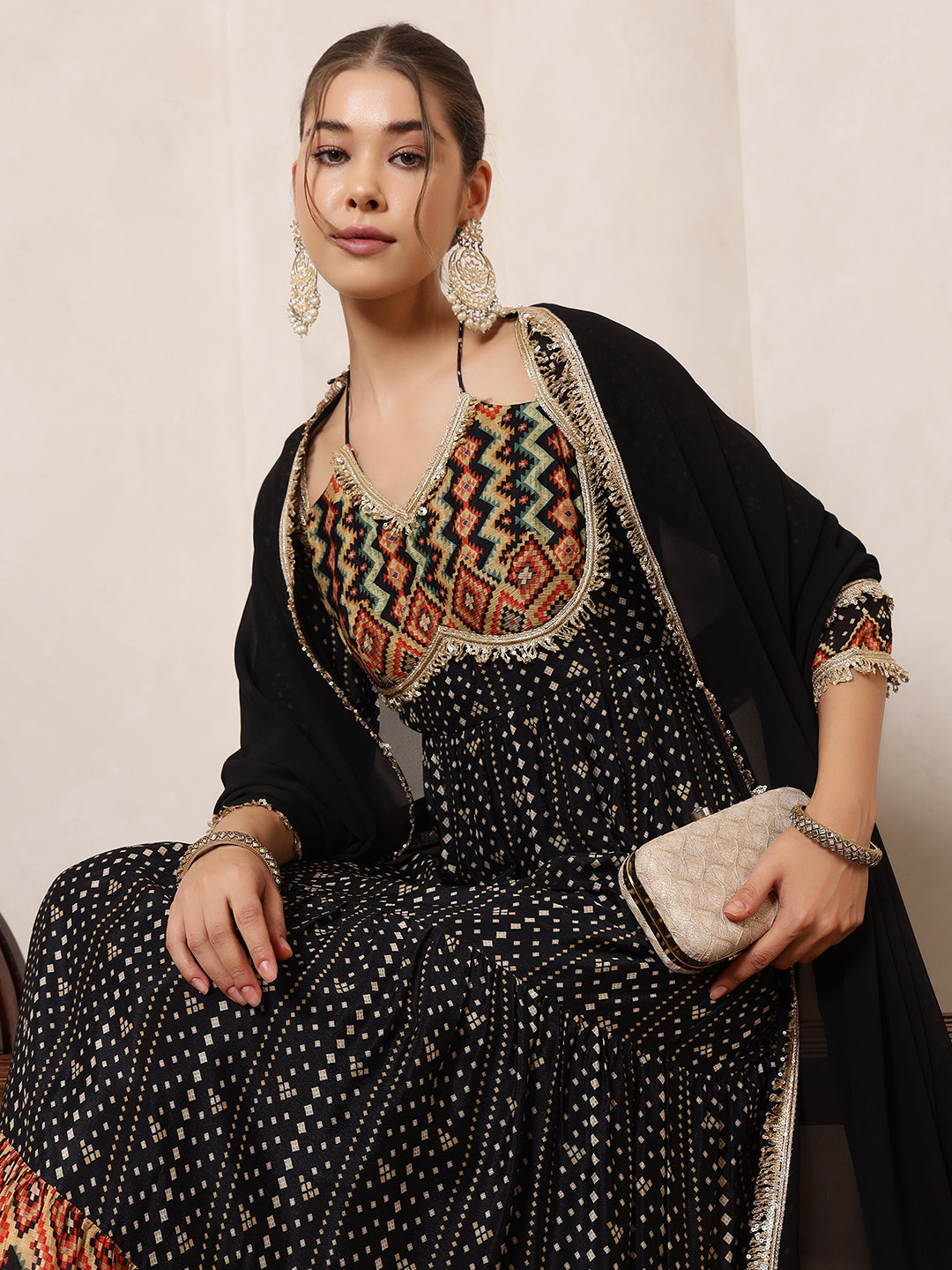 Black Bandhani Printed Halter Neck Kurta With Dupatta With Indo Western Women Set