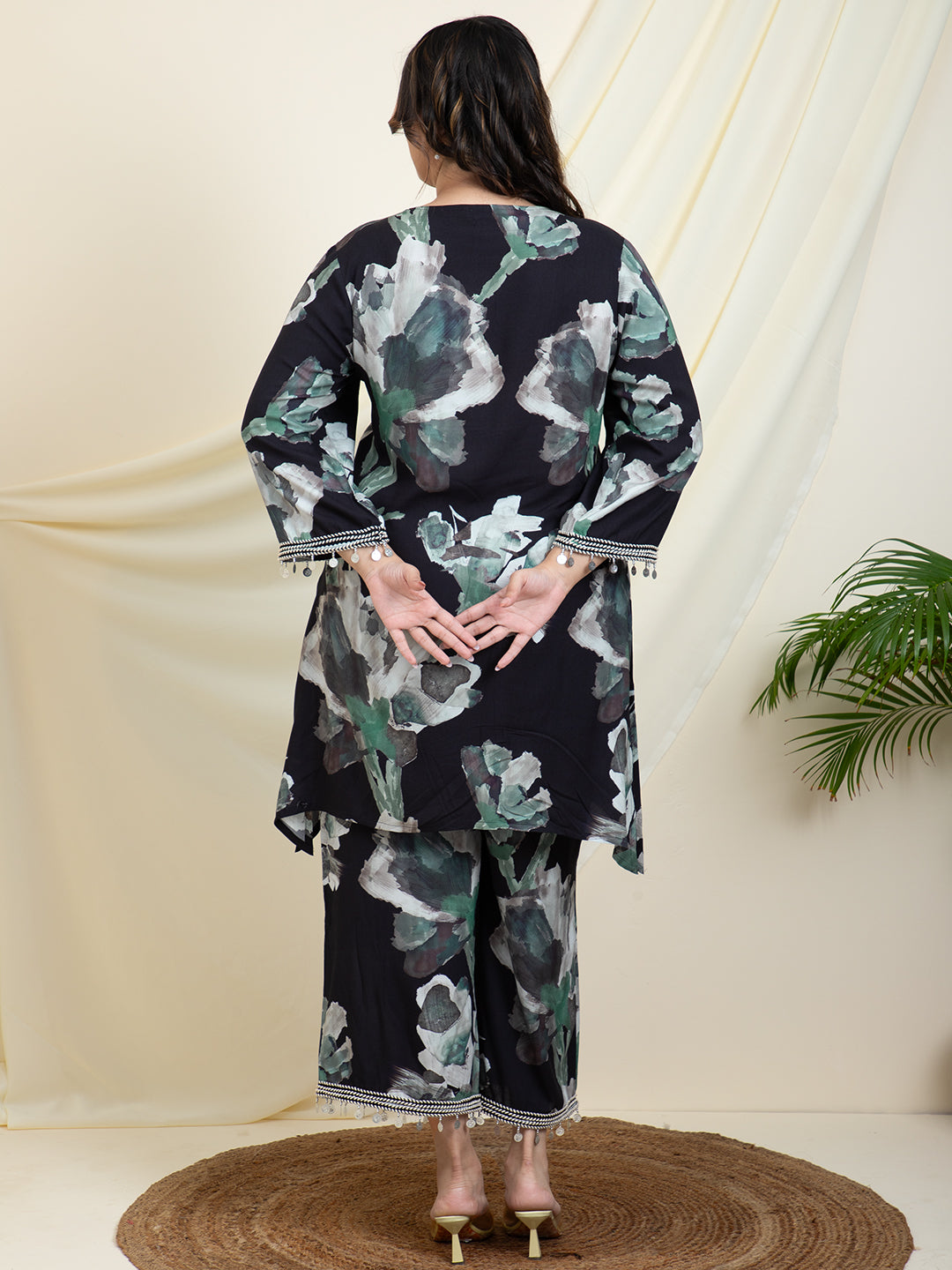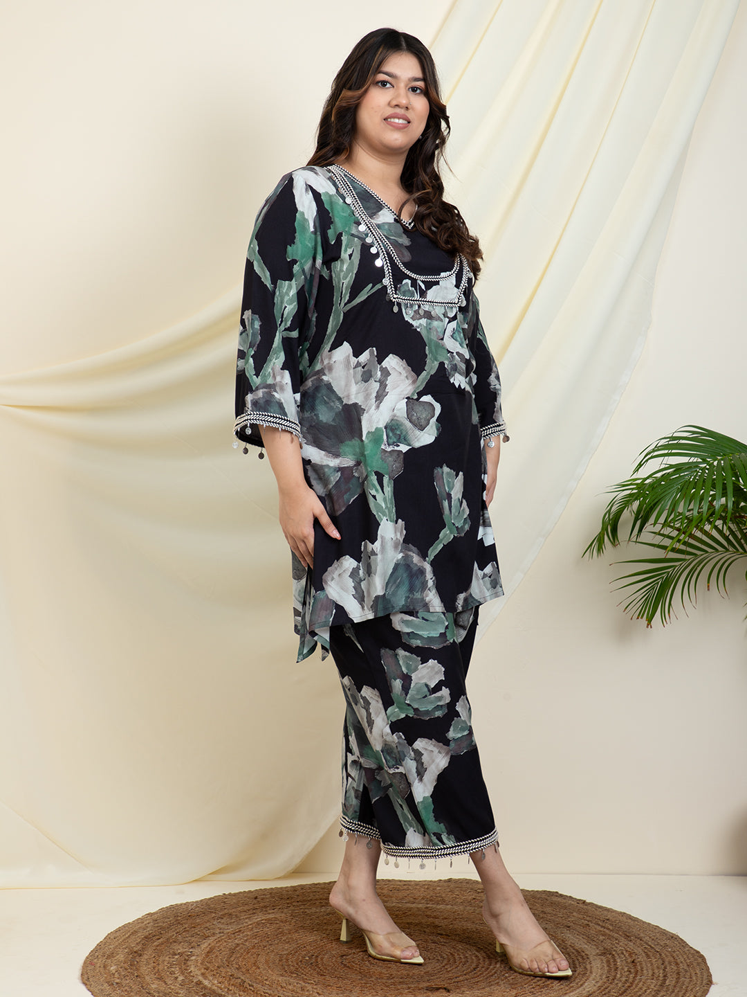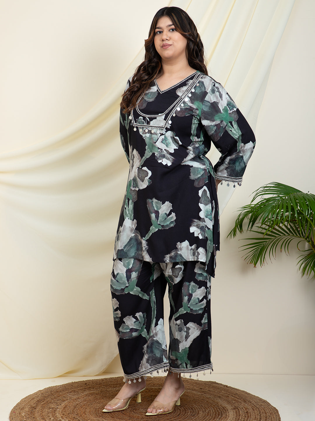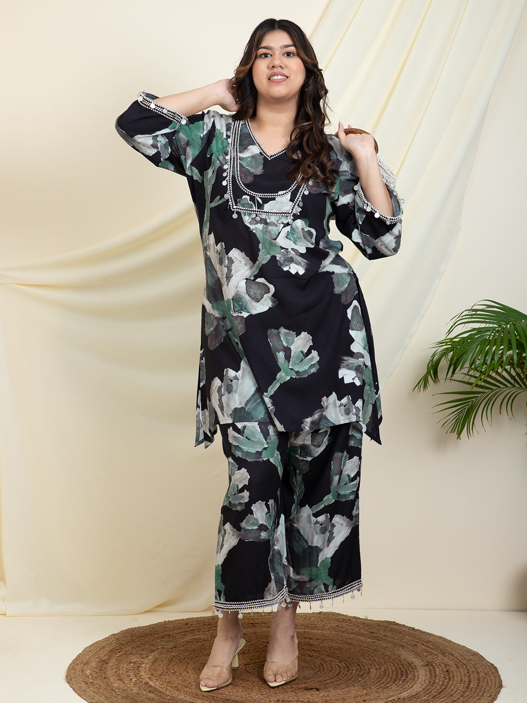 Black Floral Kurta With Palazzo Women Plus SIze Co-Ord Set