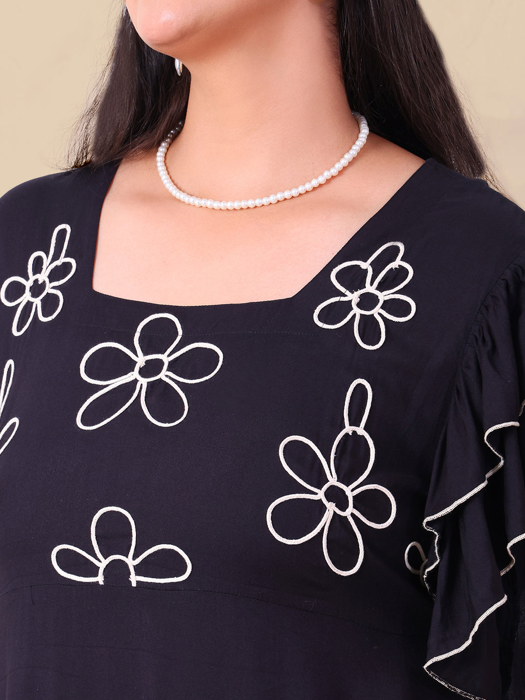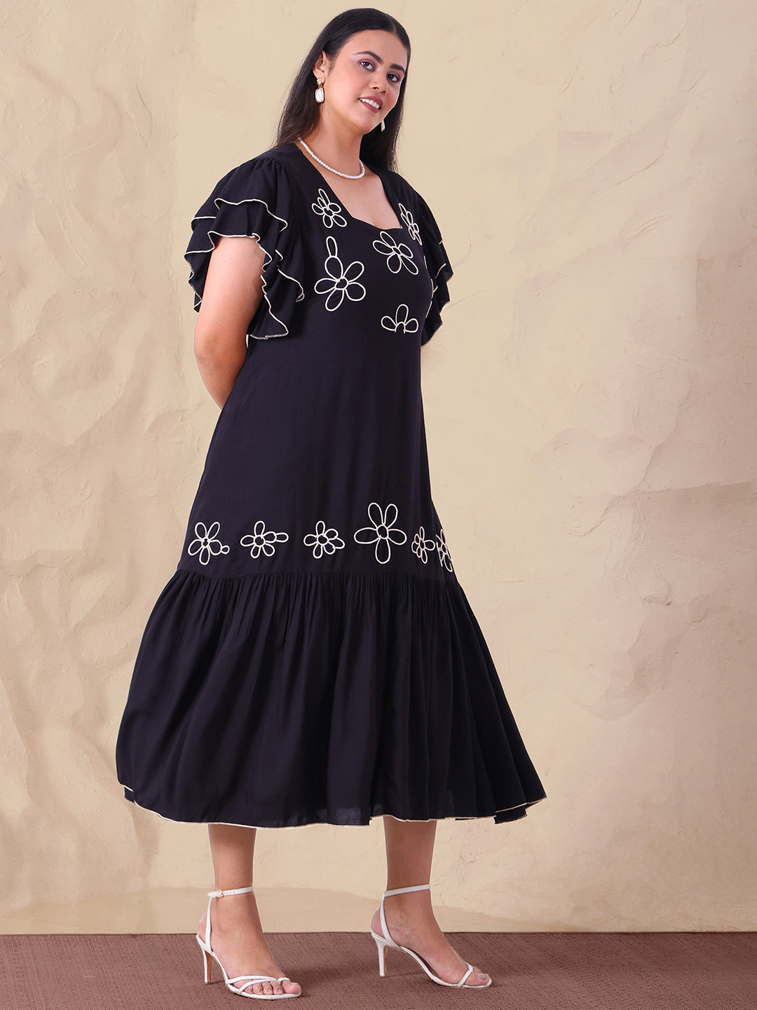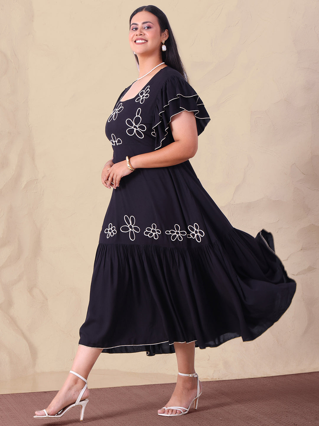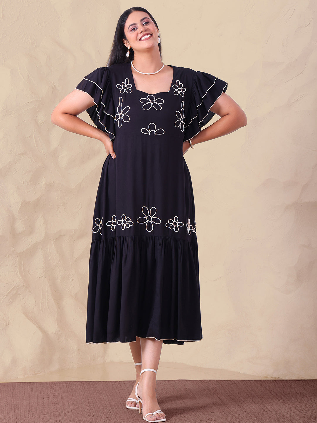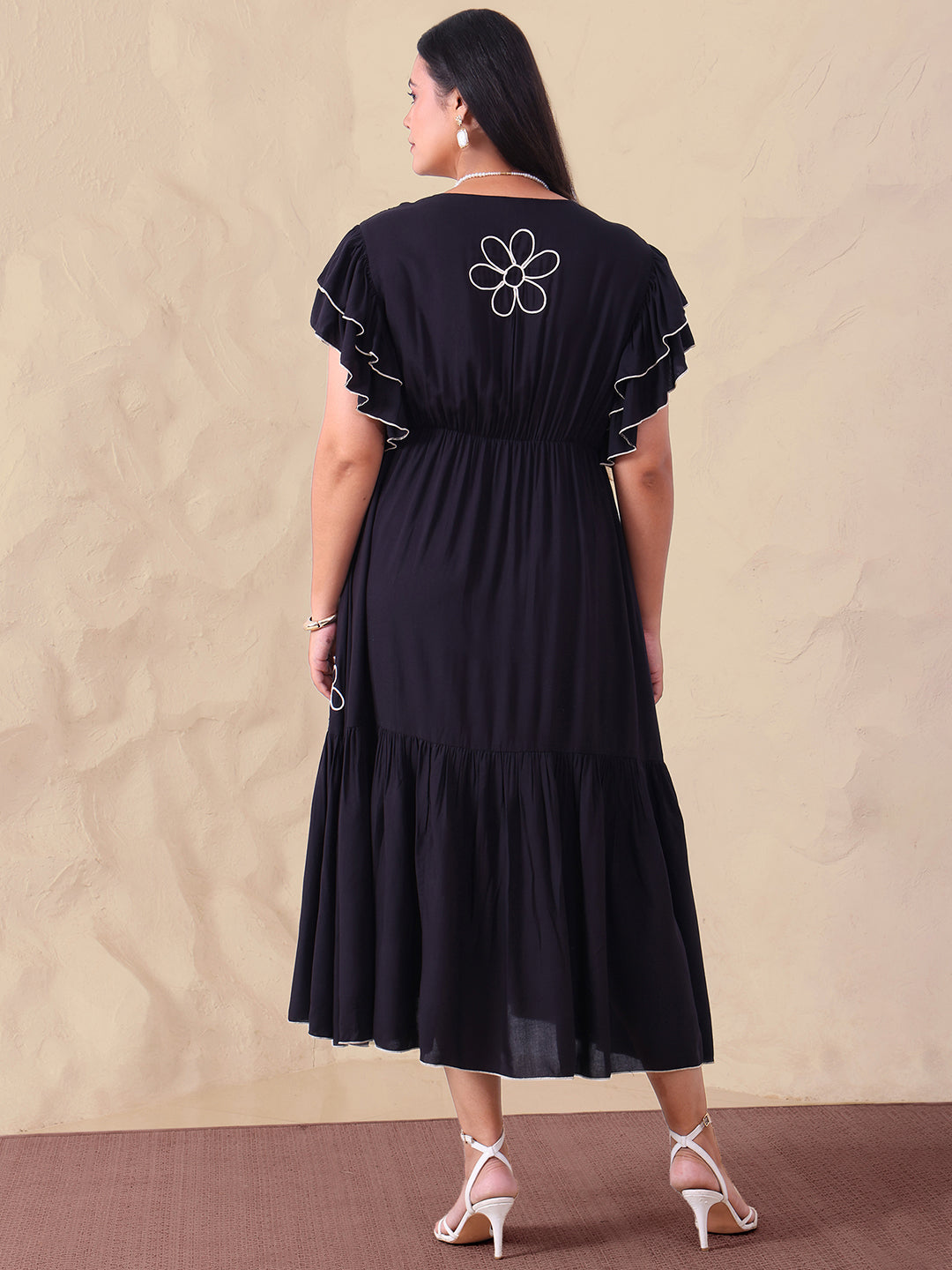 Black Pure Rayon Embroidered Women's Tiered Dress