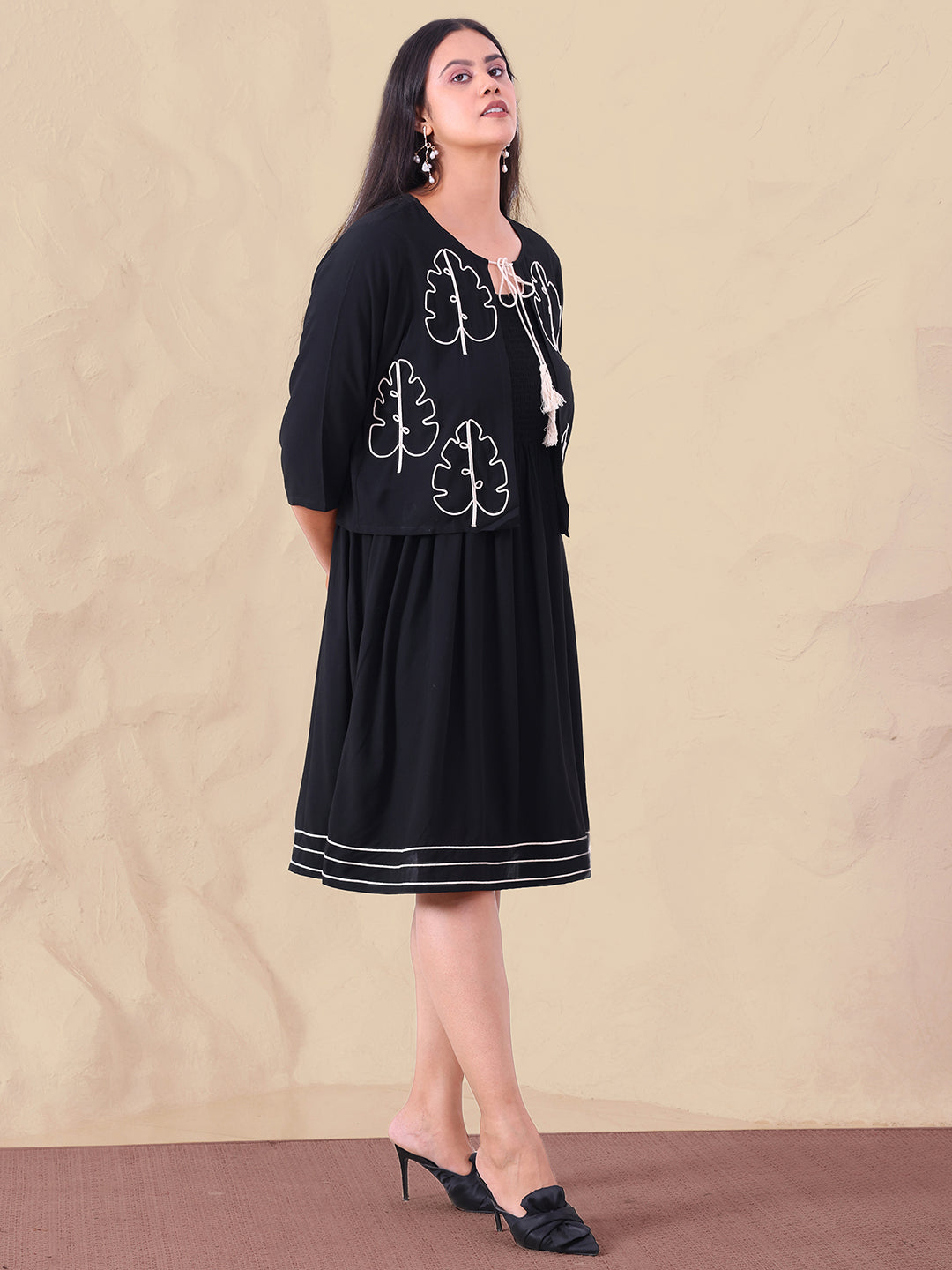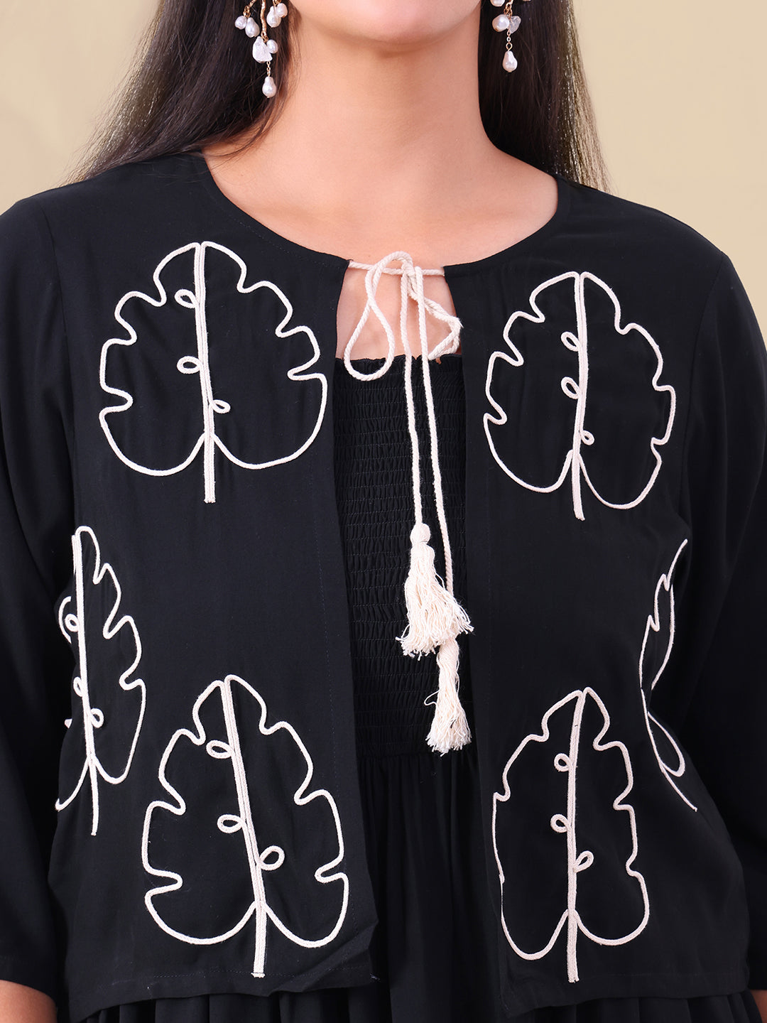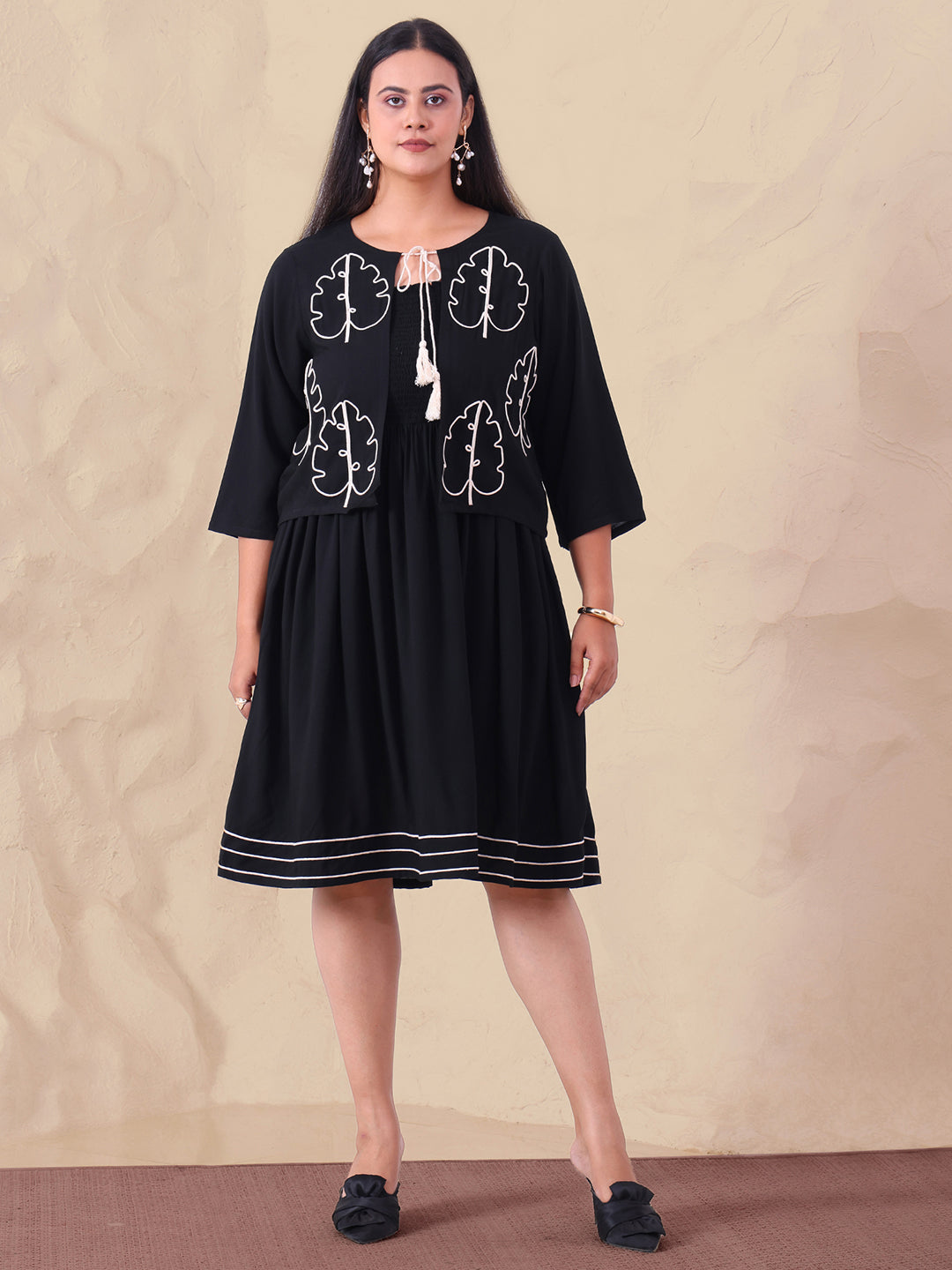 Black Pure Rayon Smocked Dress With Embroidered Shrug