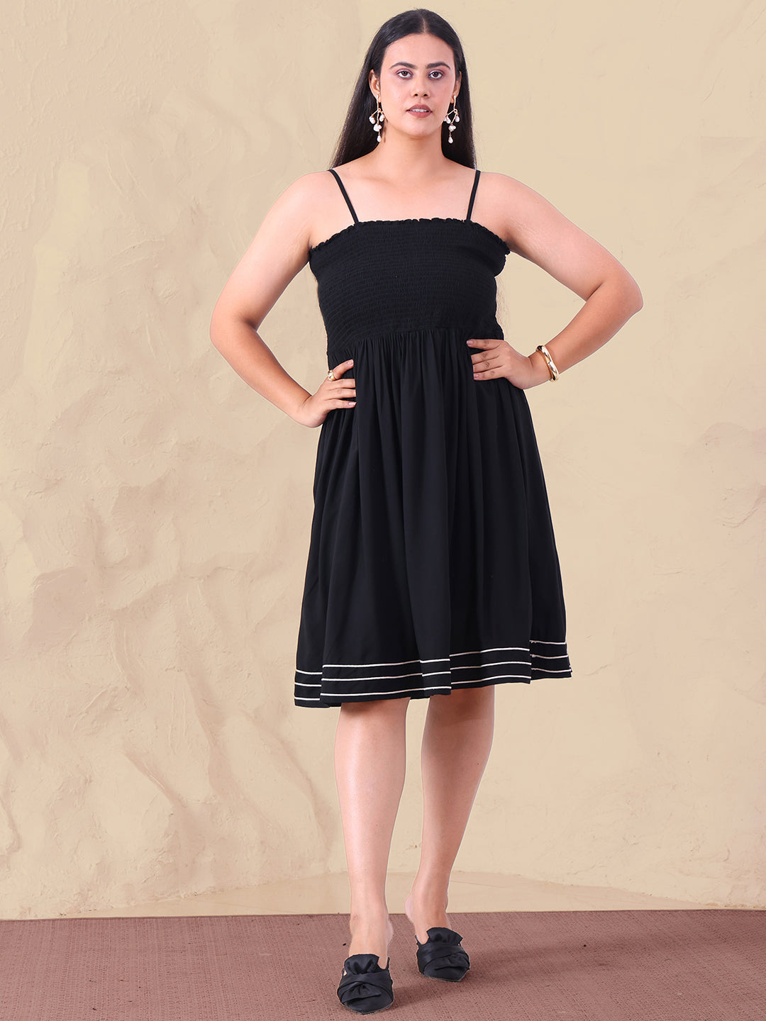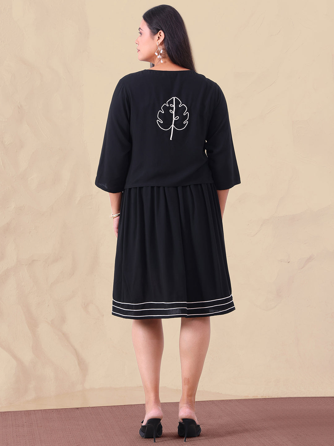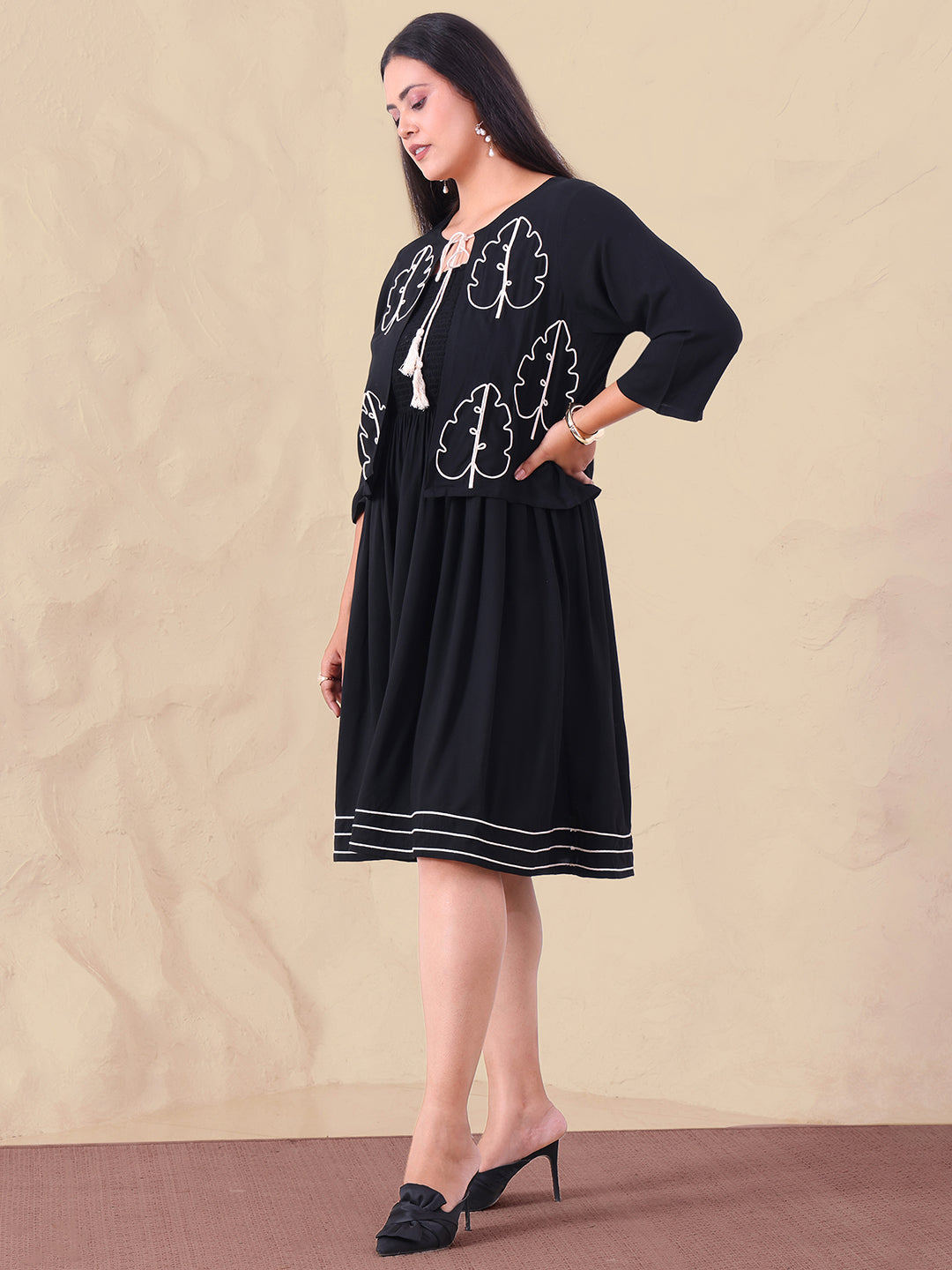 Black Pure Rayon Smocked Dress With Embroidered Shrug