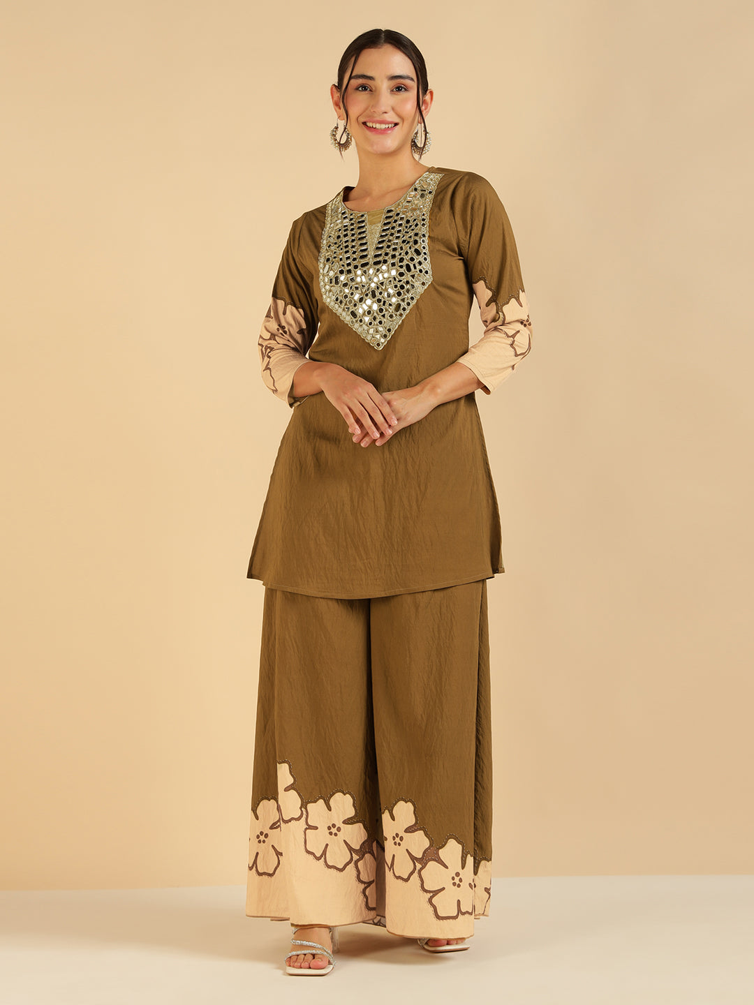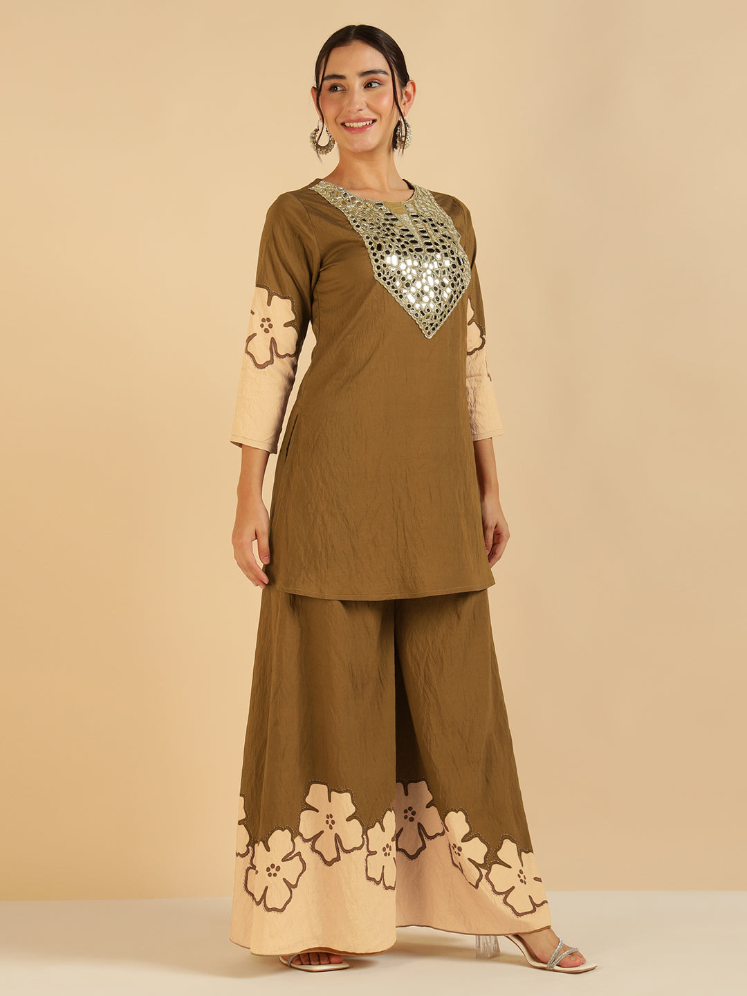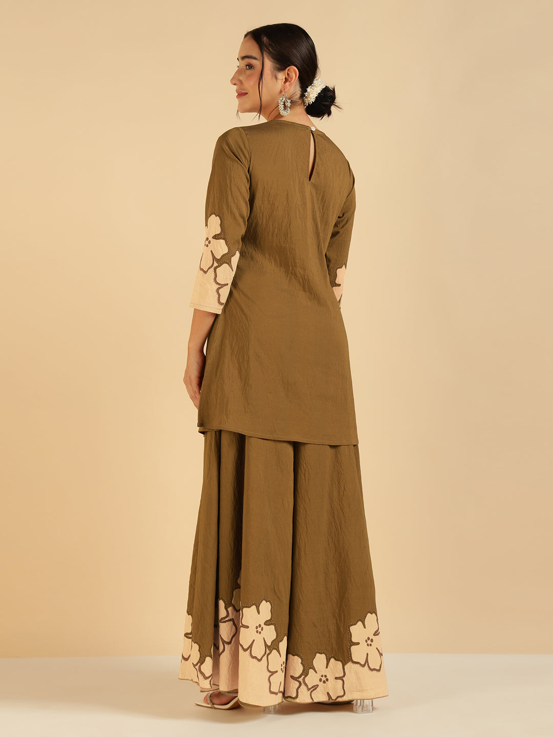 Brown Floral Border Printed Kurti & Sharara Fusion Co-Ord Set