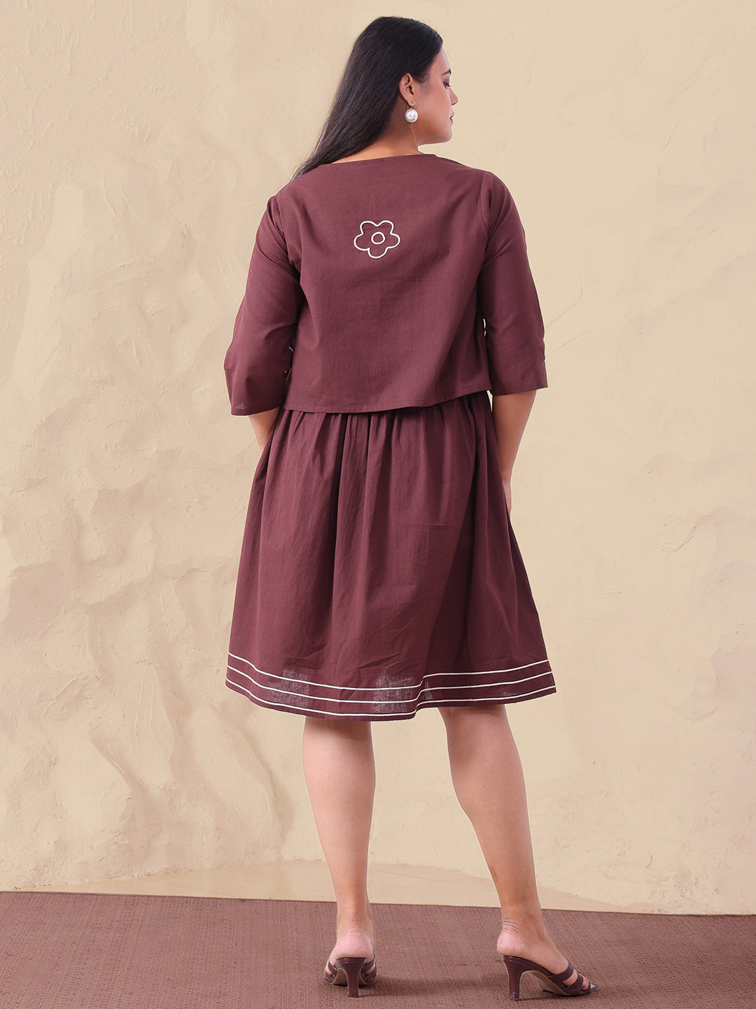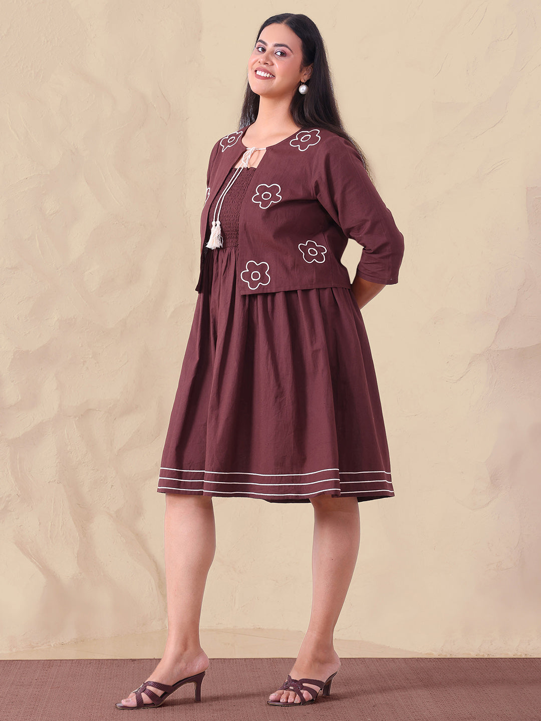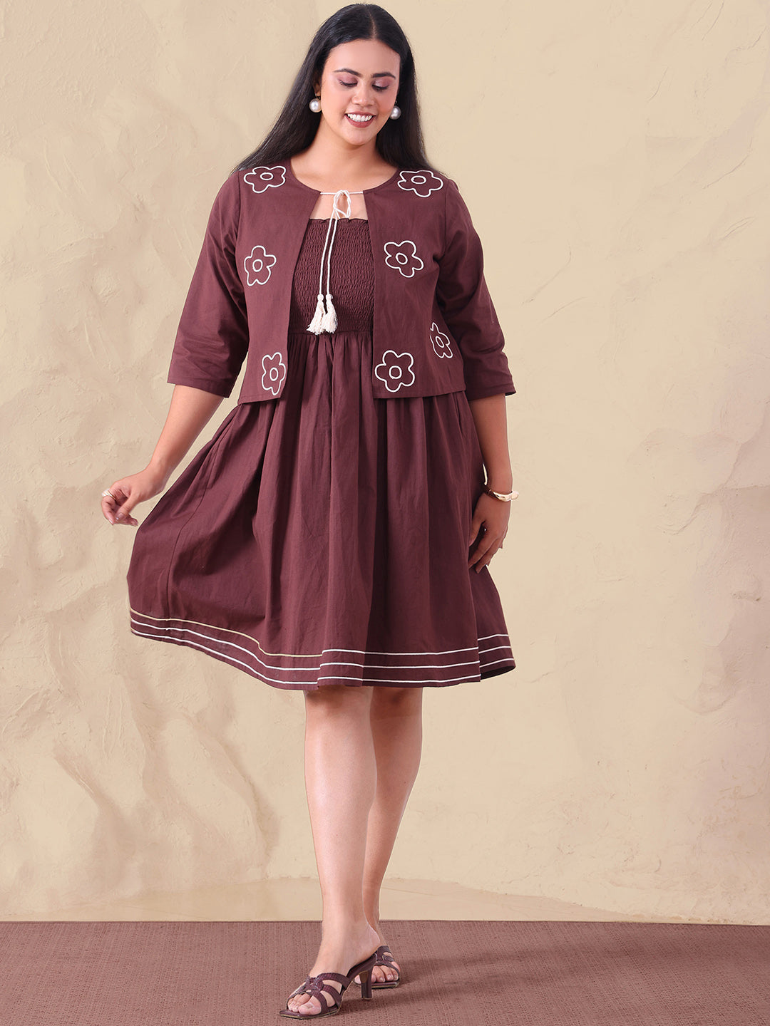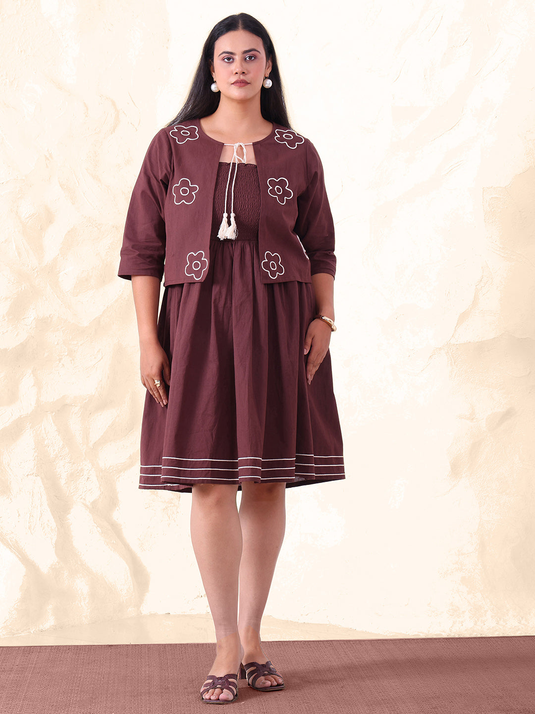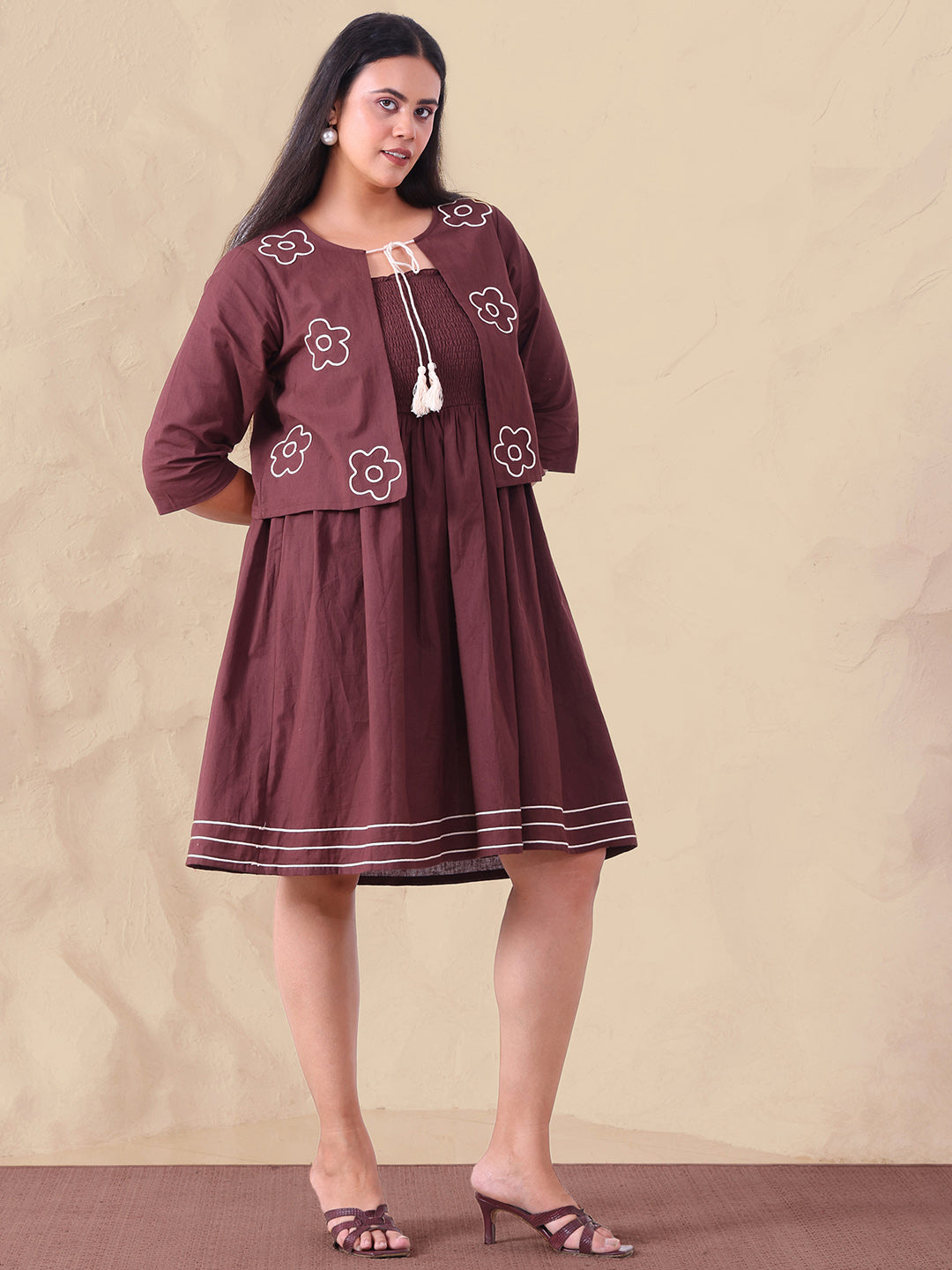 Brown Pure Cotton Smocked Dress With Embroidered Shrug