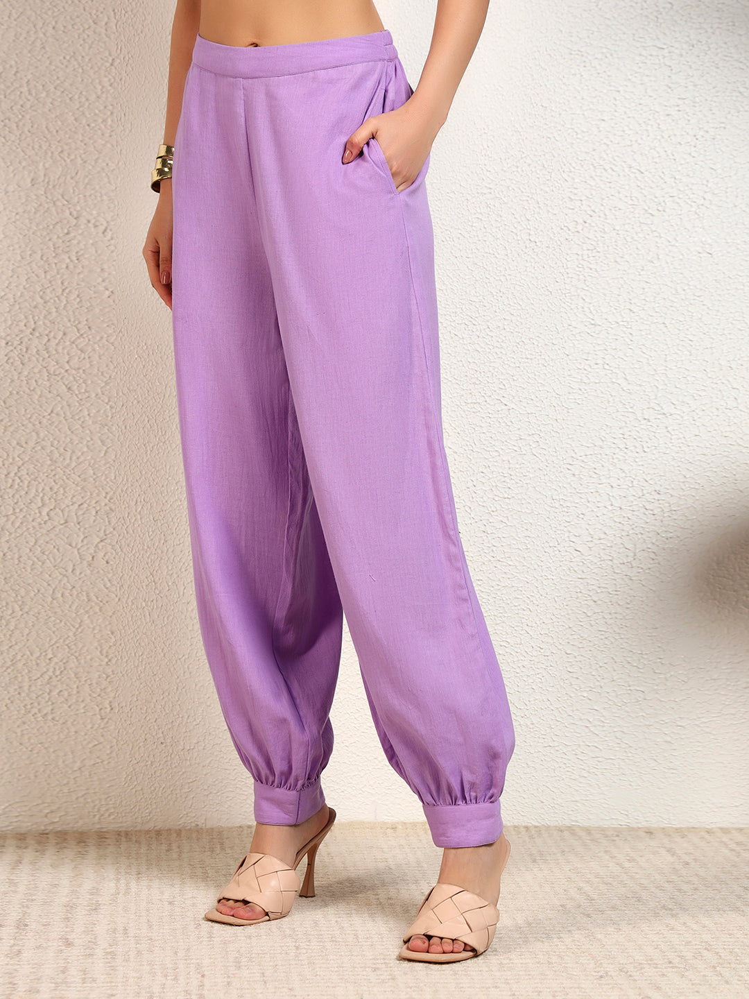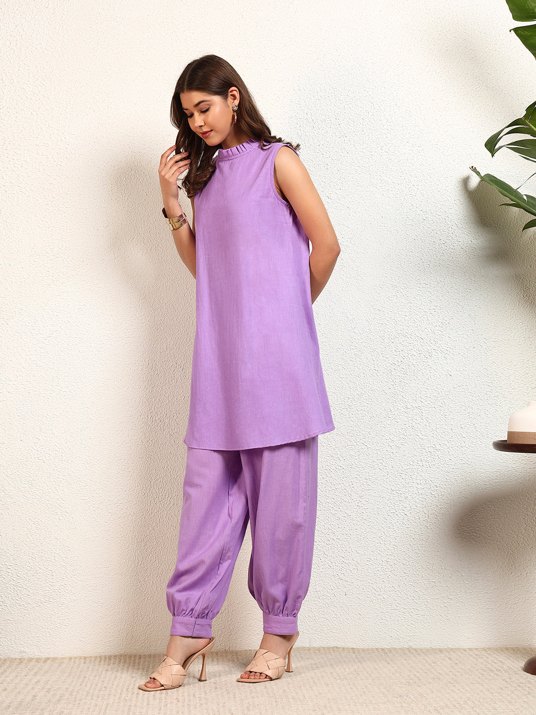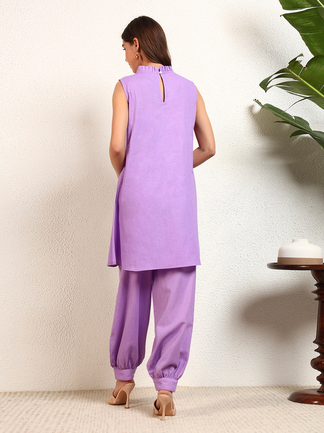 Lavender Cotton Flex Solid Halter Neck Frill Gathered Kurta Pant Women Co-Ord Set