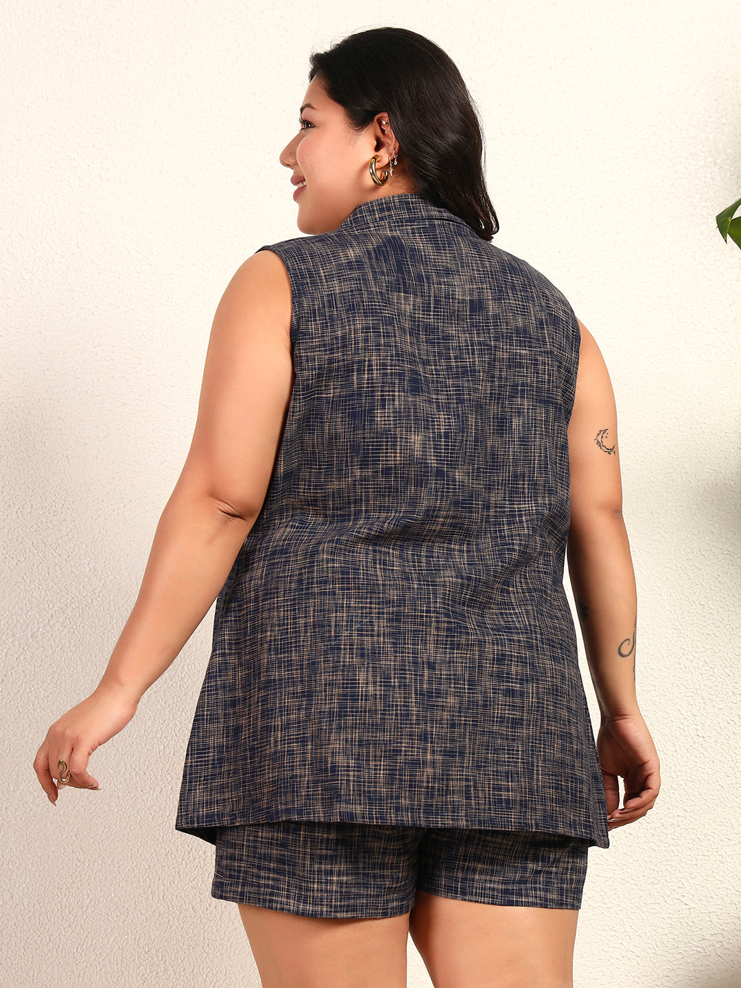 Navy Blue Pure Cotton Textured Blazer With Shorts Women Plus Size Co-Ord Set