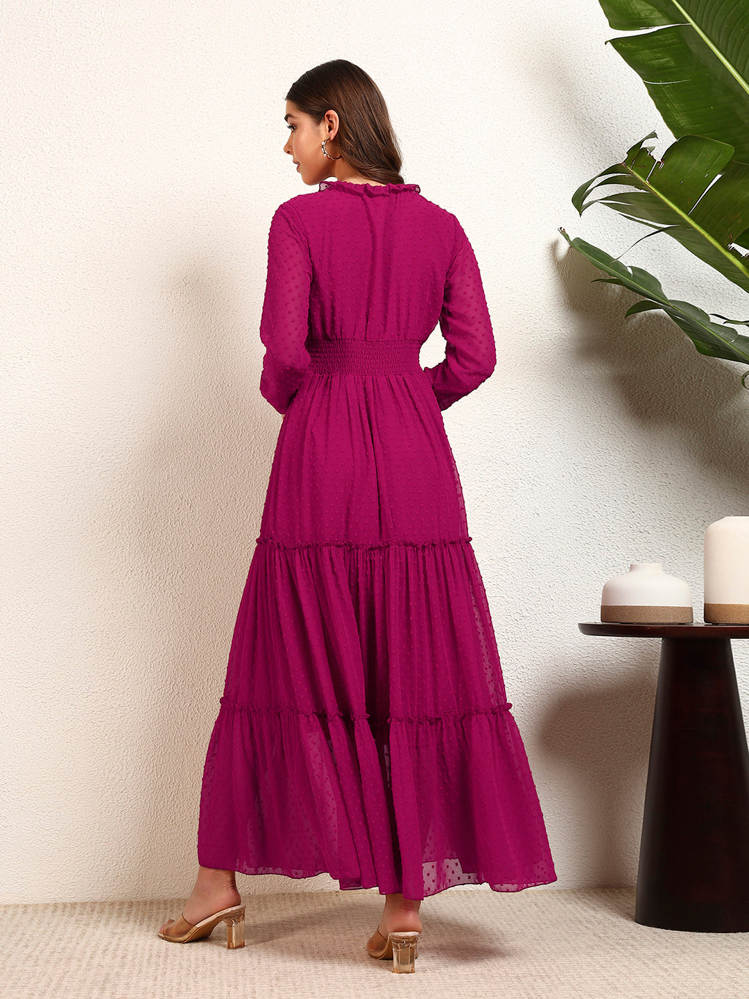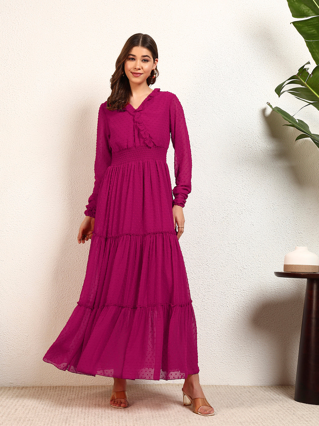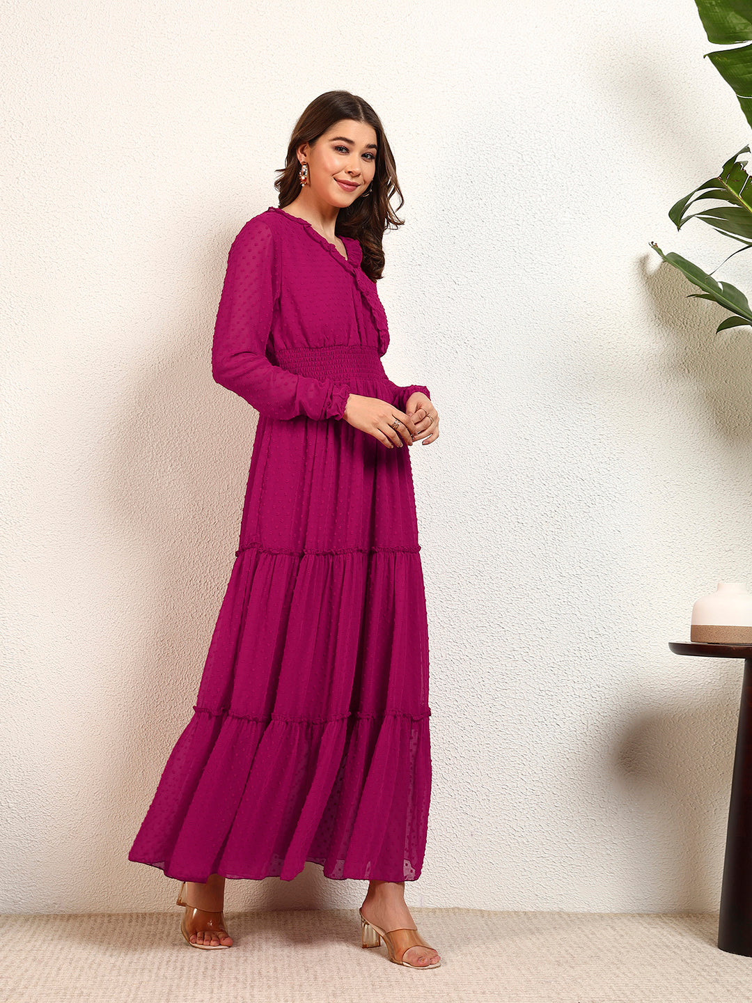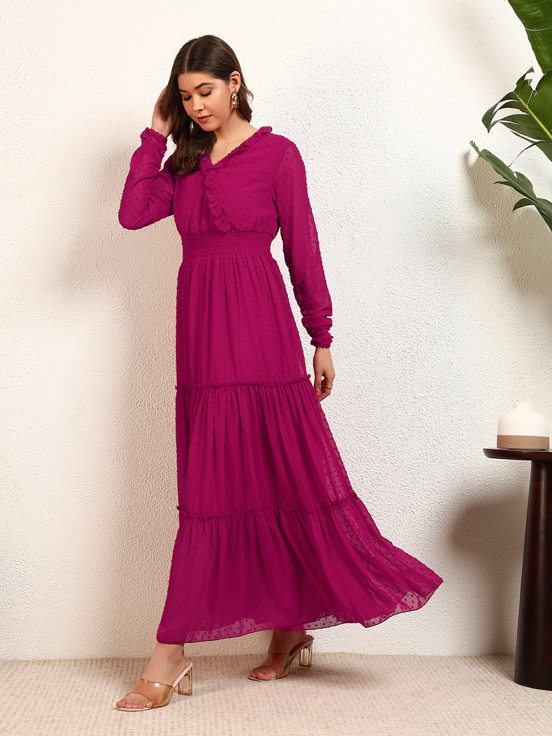 Magenta Georgette Dobby Smocking Tiered Maxi Womens Dress
