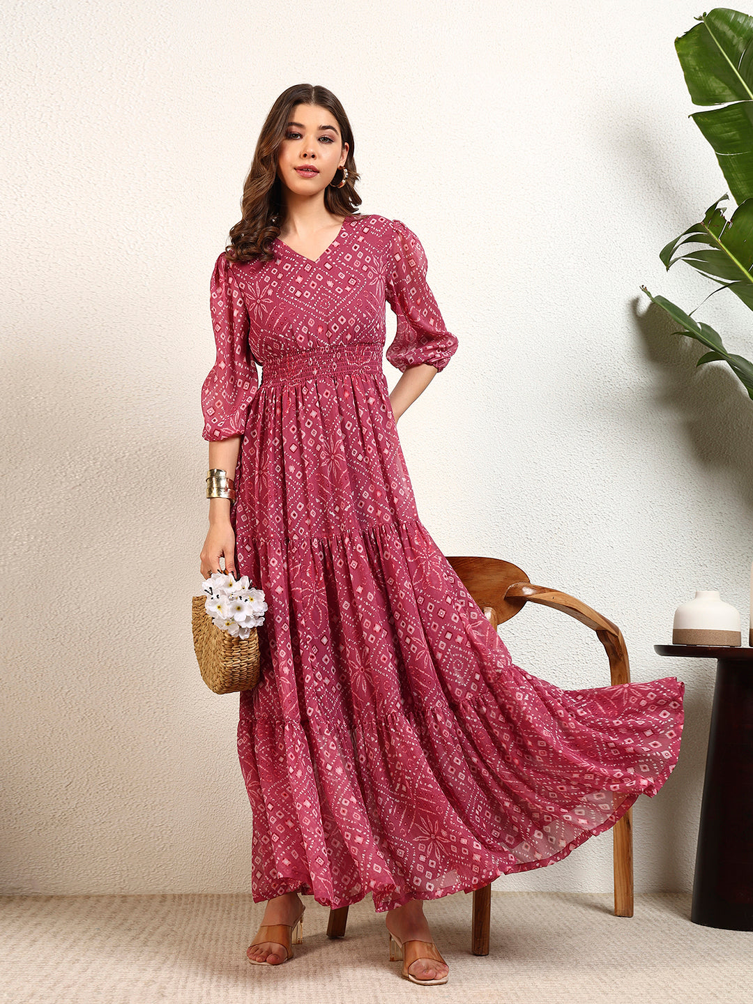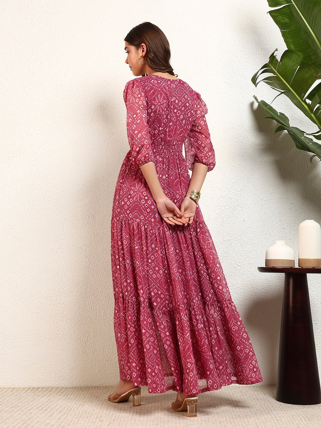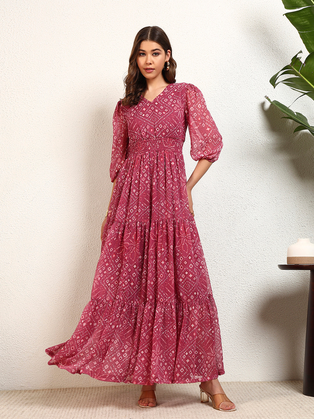 Pink Chiffon Bandhani Smocking Tiered Maxi Womens Dress