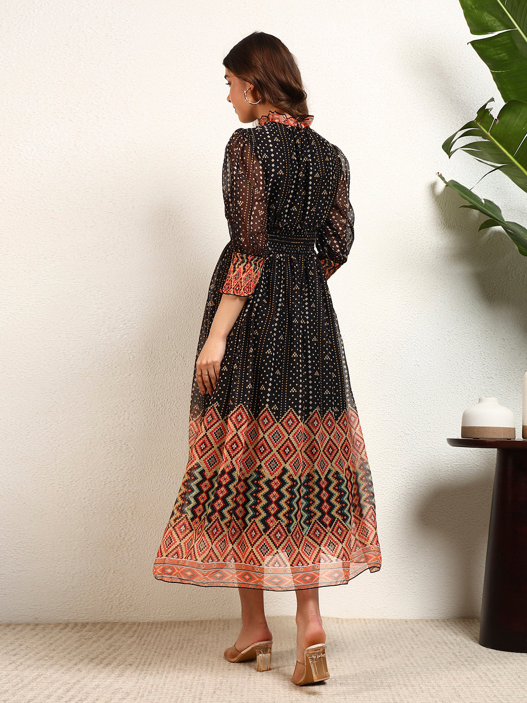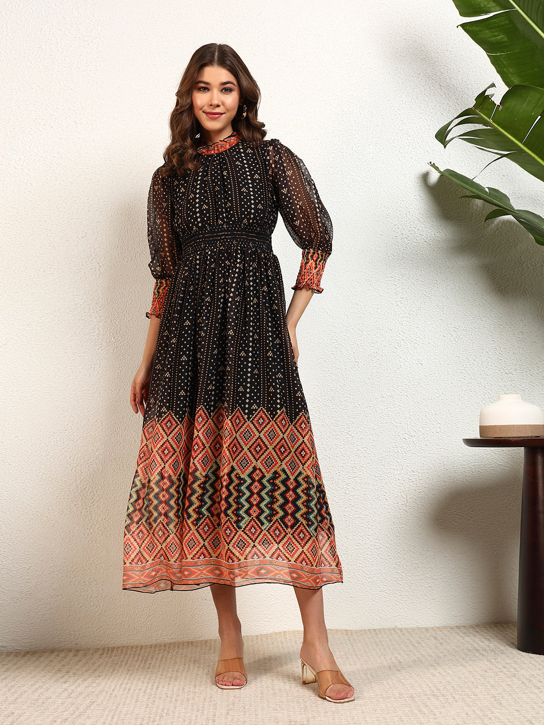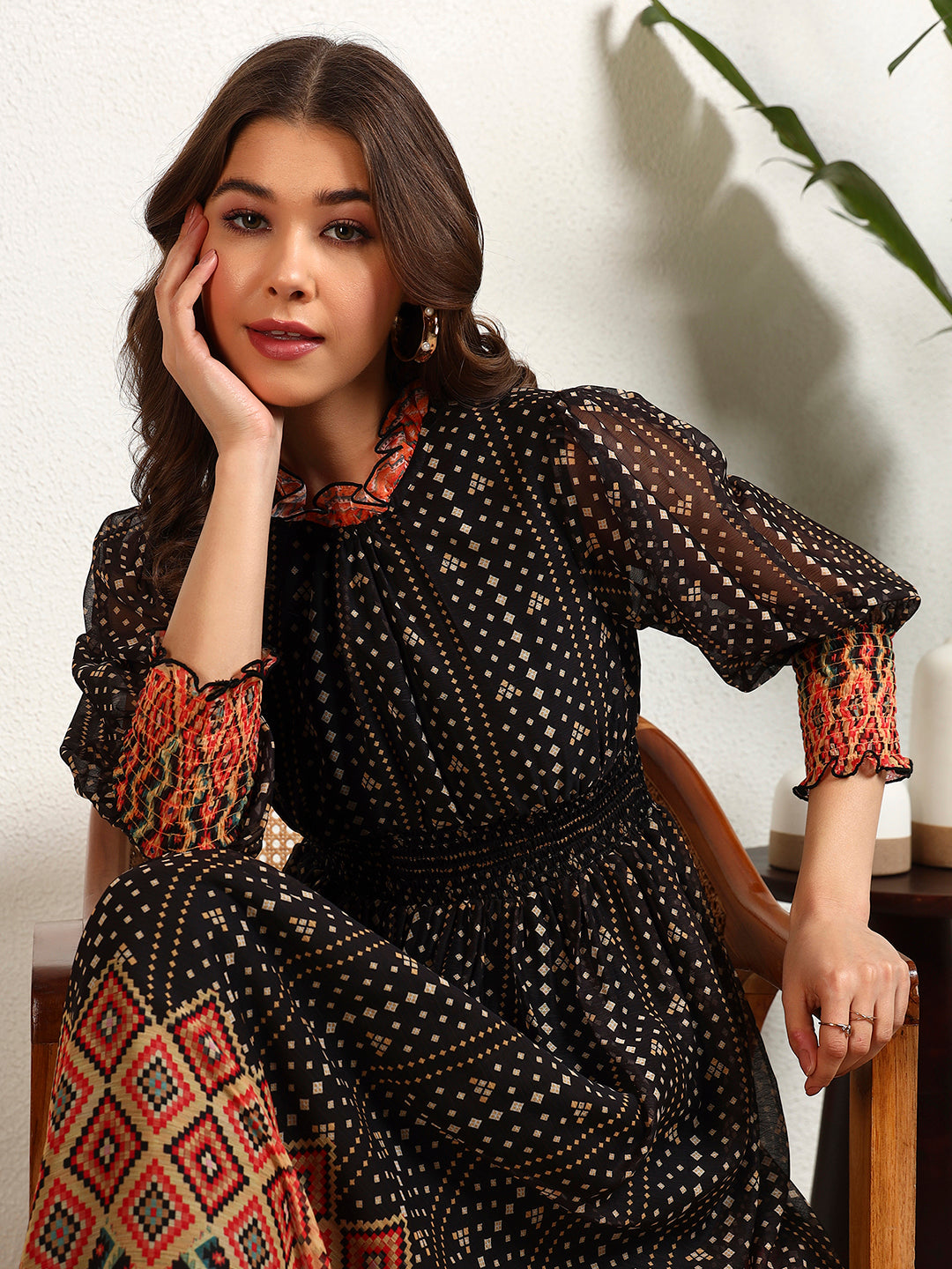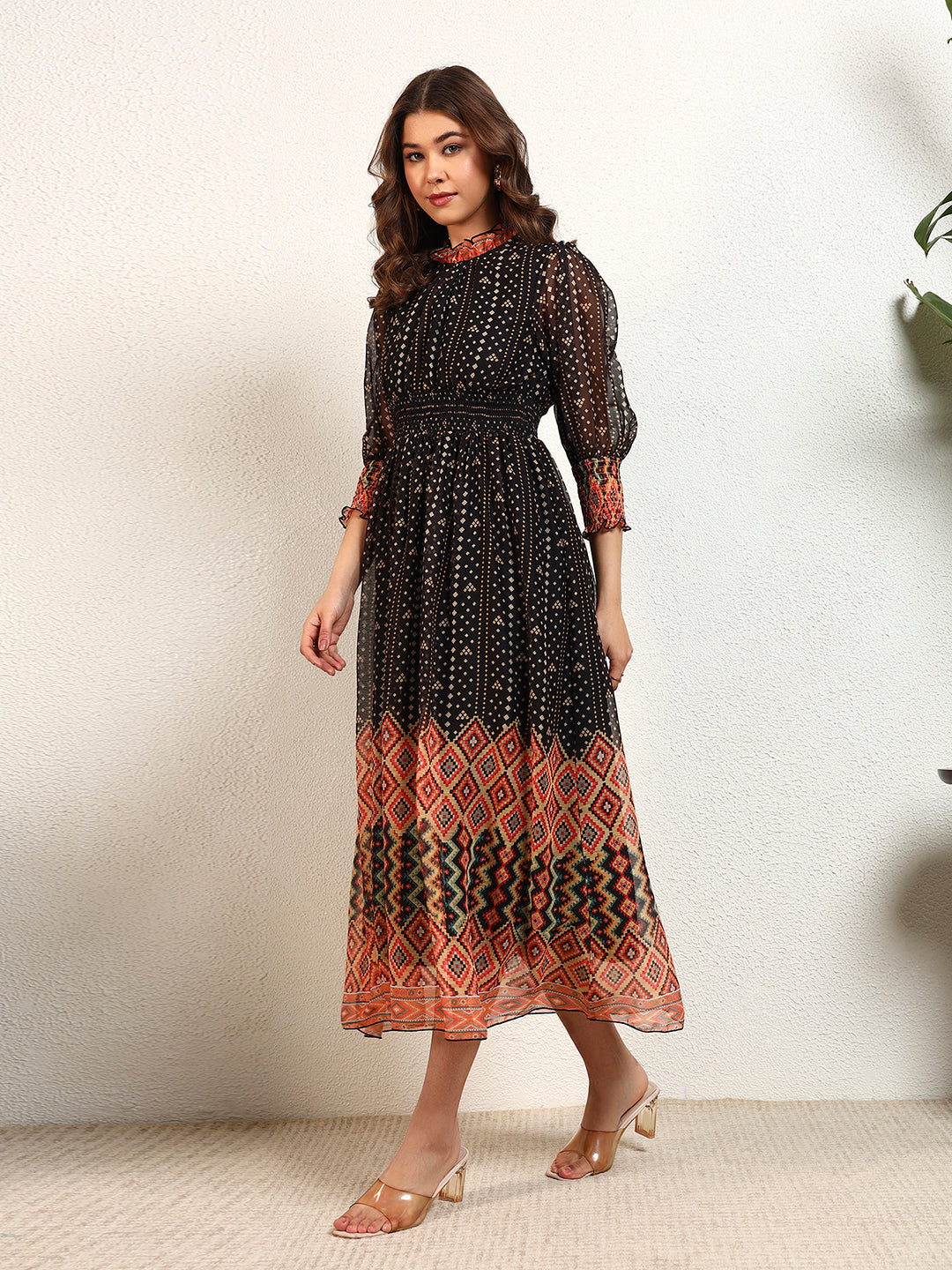 Black Chiffon Bandhani A-Line Womens Dress