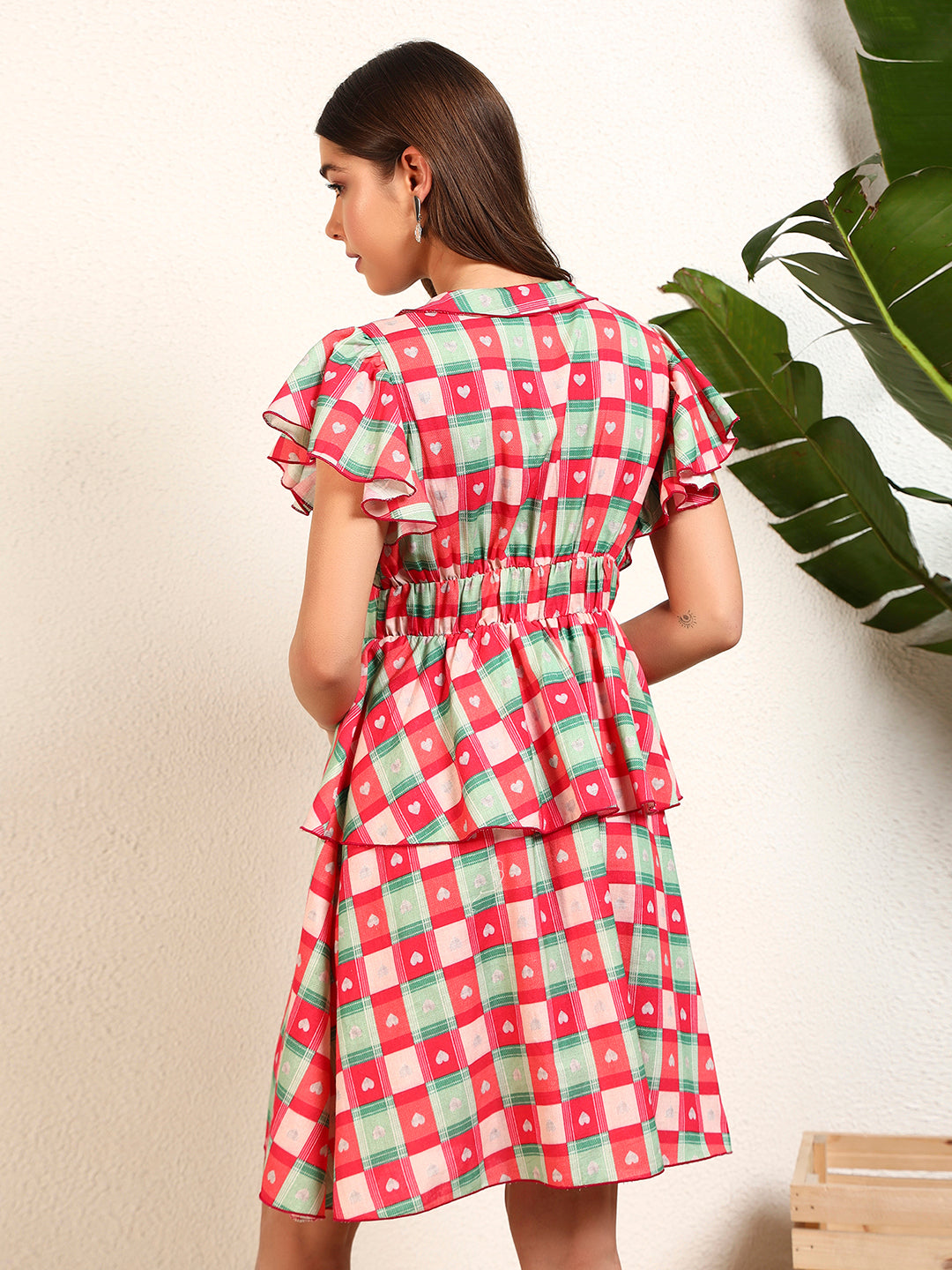 Multicolour Viscose Rayon Check Heart Printed V-Neck Frill Tiered Layered Womens Dress