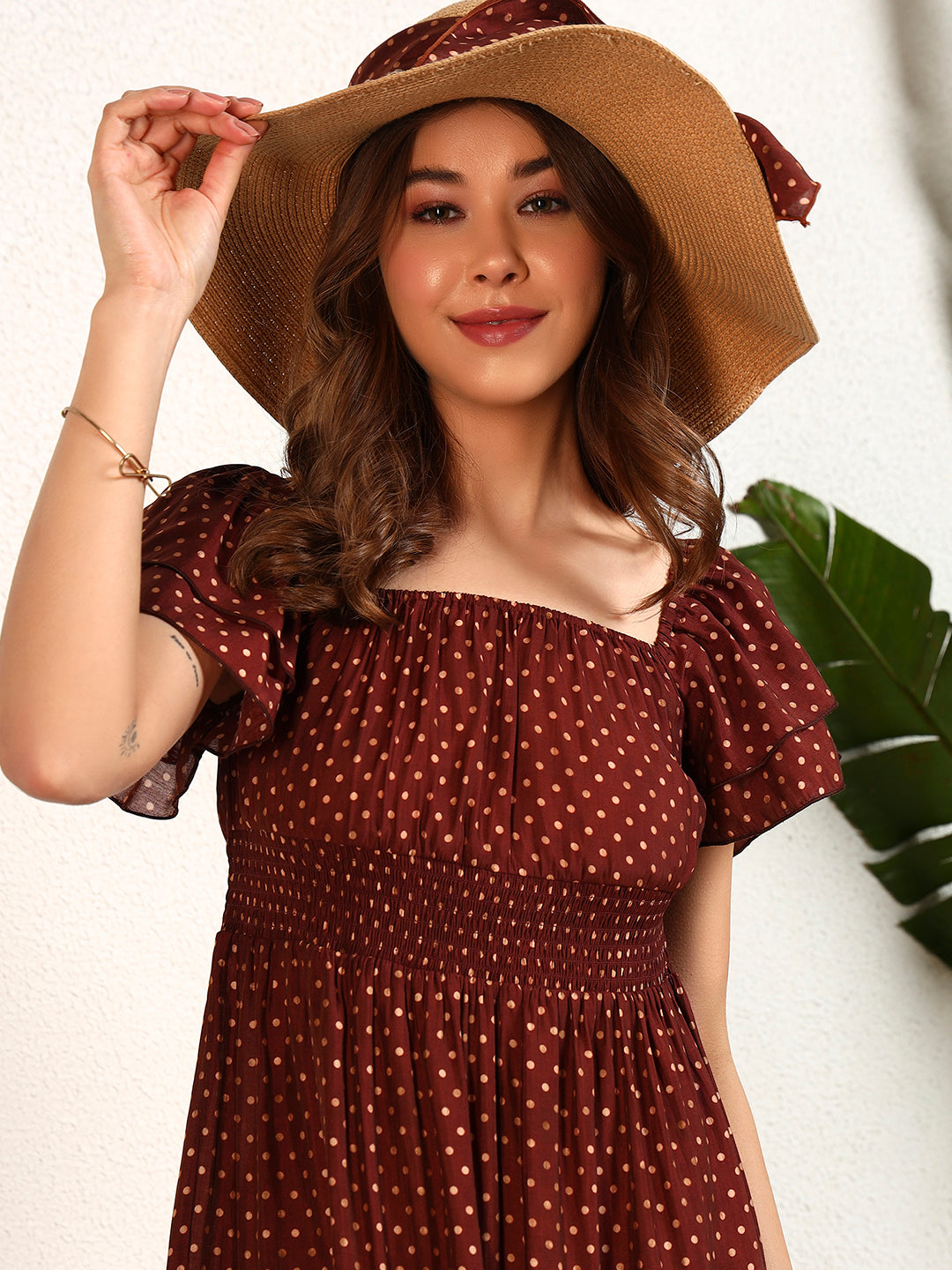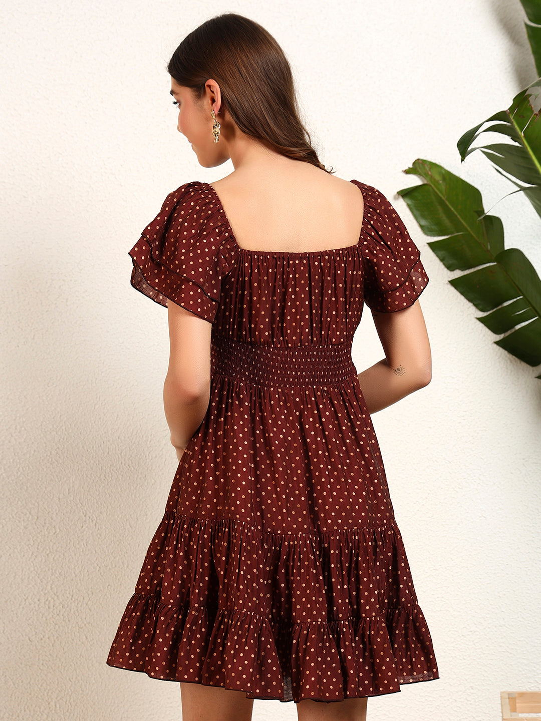 Brown Modal Chanderi Polka Dots Smocked Tiered Short Womens Dress