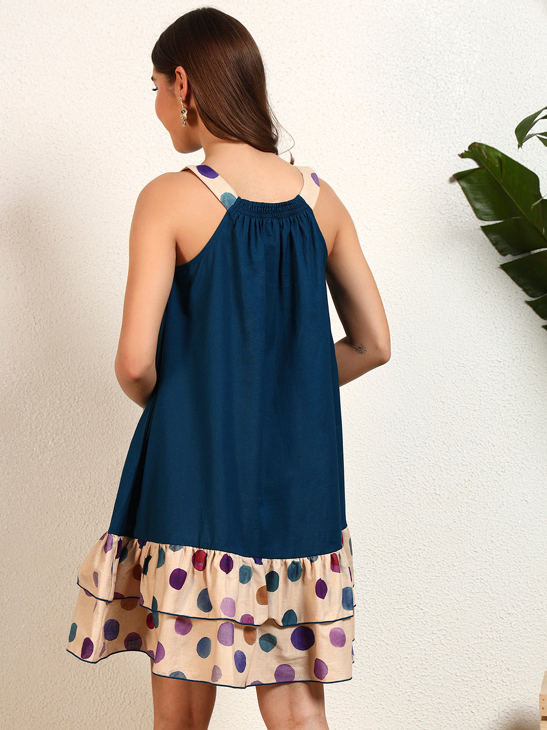 Teal Blue Cotton Flex Solid With Polka Tiered Short Womens Dress