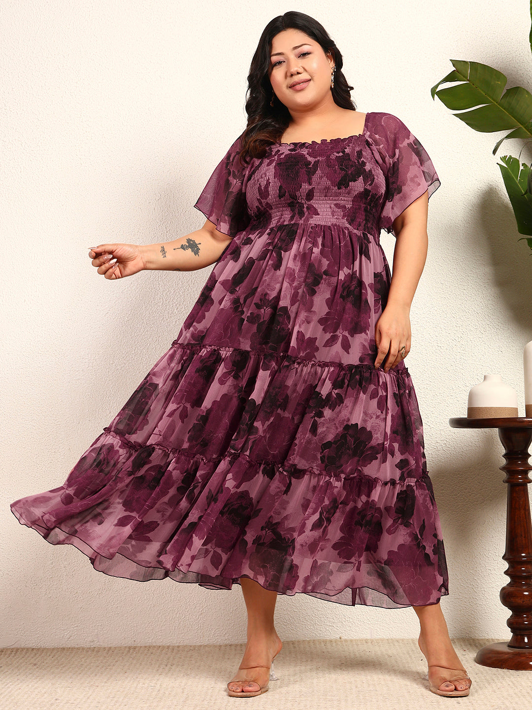 Wine Chiffon Floral Smocked Tiered Womens Plus Size Dress