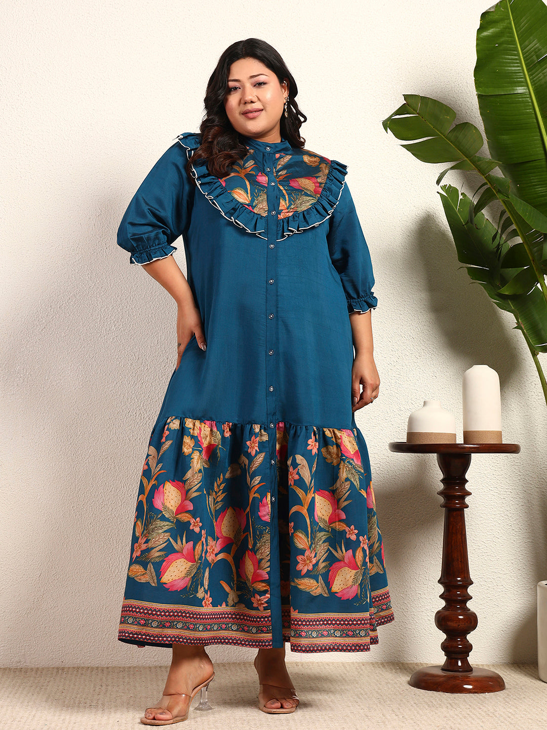 Teal Blue Modal Chanderi Placement Floral Tiered Frill Shirt Womens Plus Size Dress