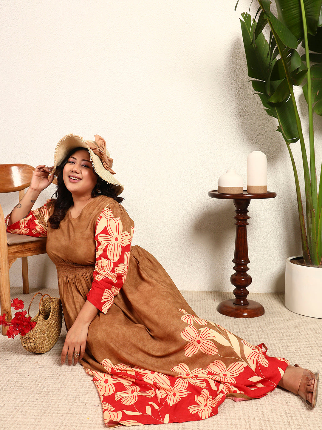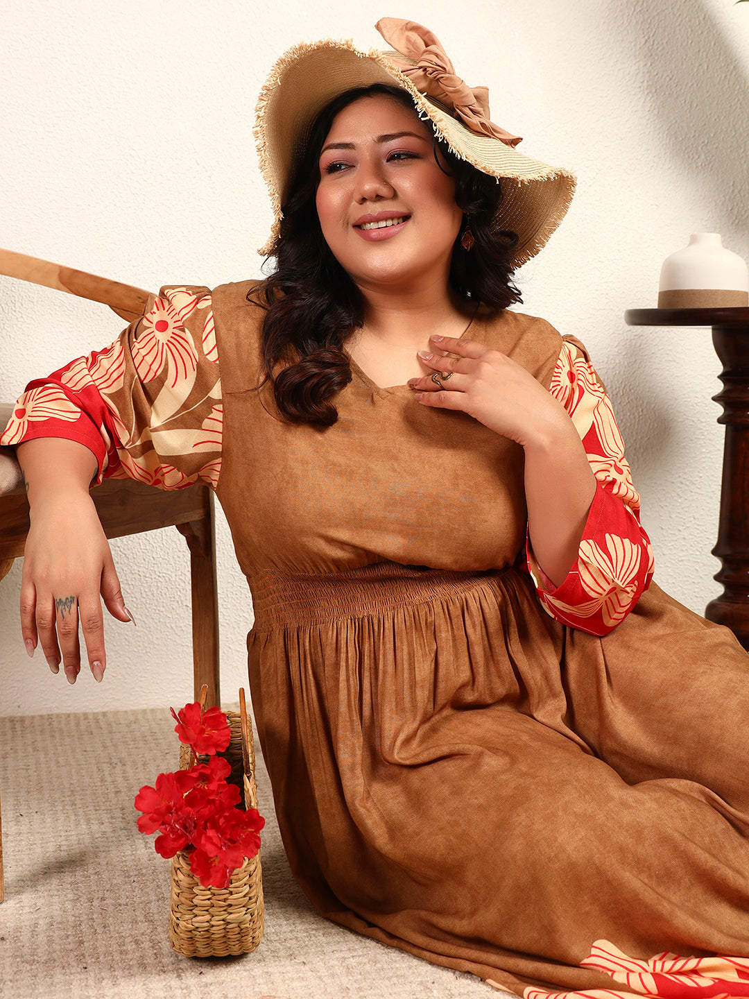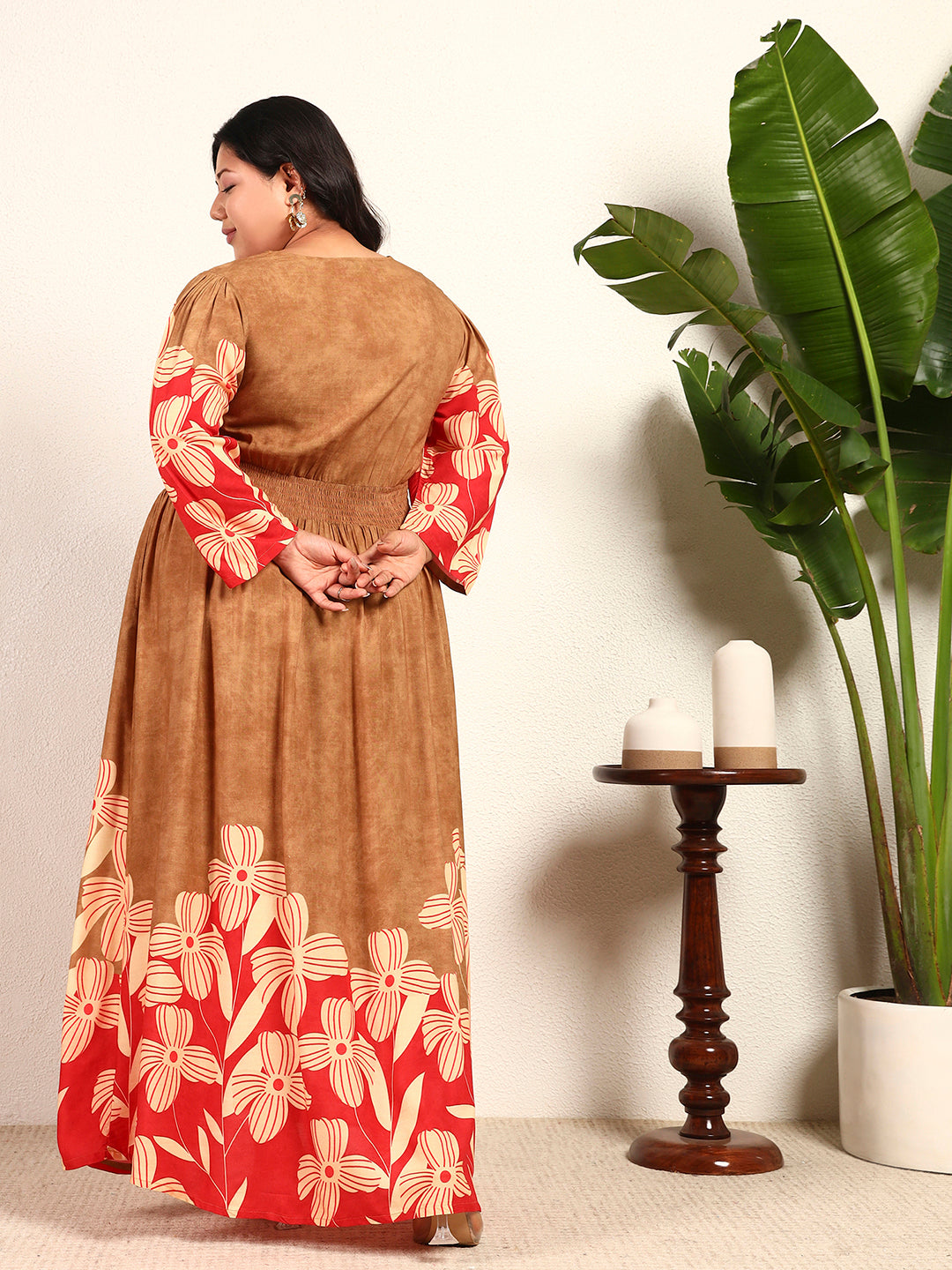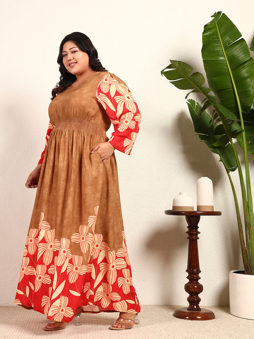 Multi Colour Viscose Rayon Floral Placement Print Smocked A-Line Womens Plus Size Dress