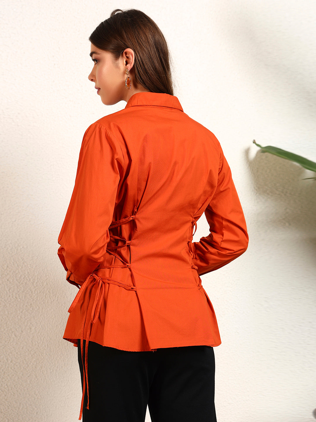 Tan Brown Cotton Poplin Solid Side String Loop Womens Shirt