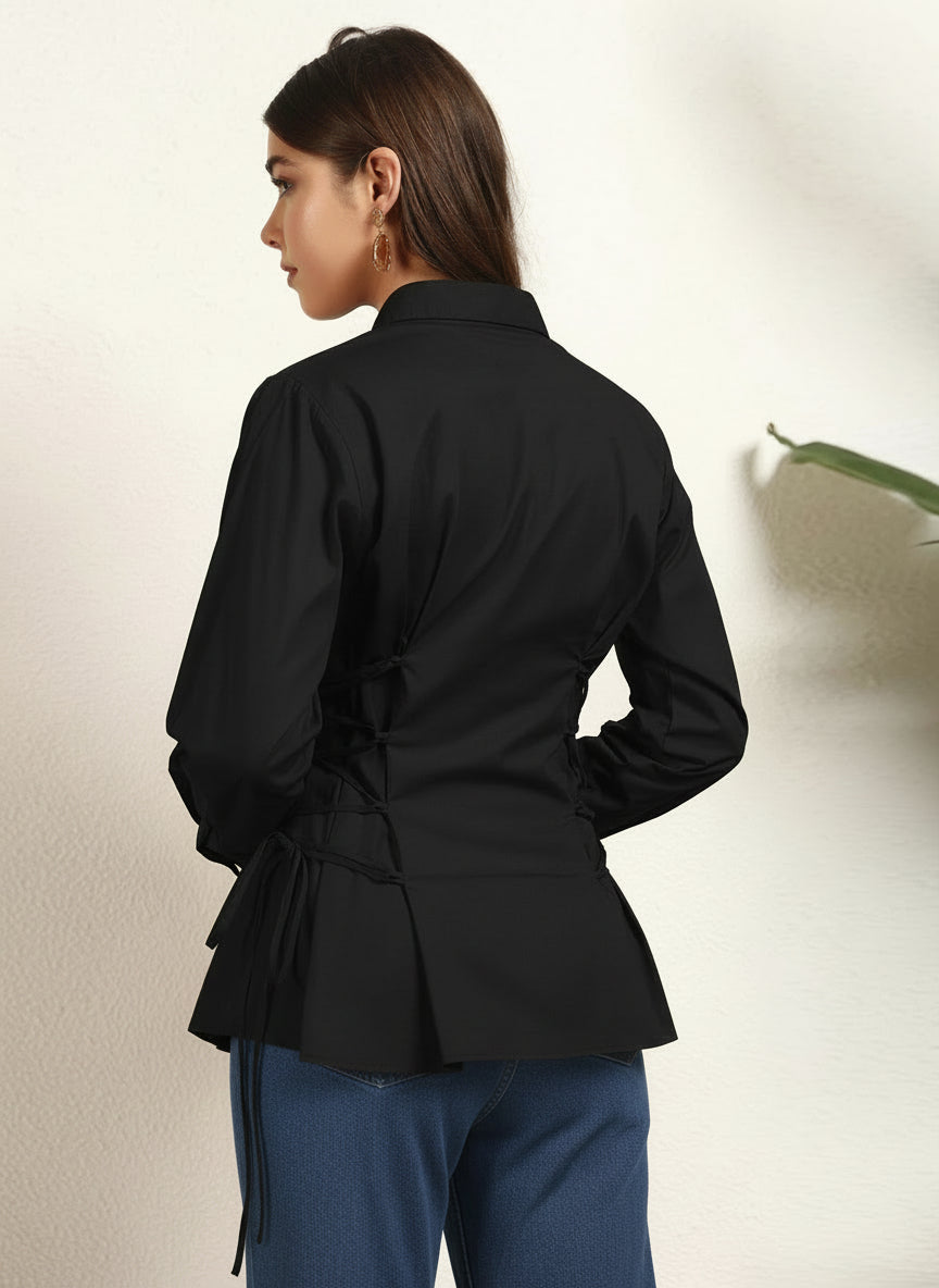 Black Cotton Poplin Solid Side String Loop Womens Shirt