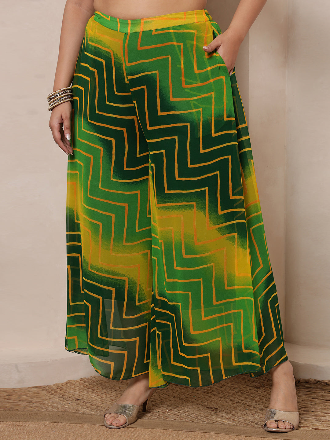 Green Multi Colour Omre Zig-Zag Printed Kurti With Crop Top With Sharara Indo Western Women 3 Piece Set