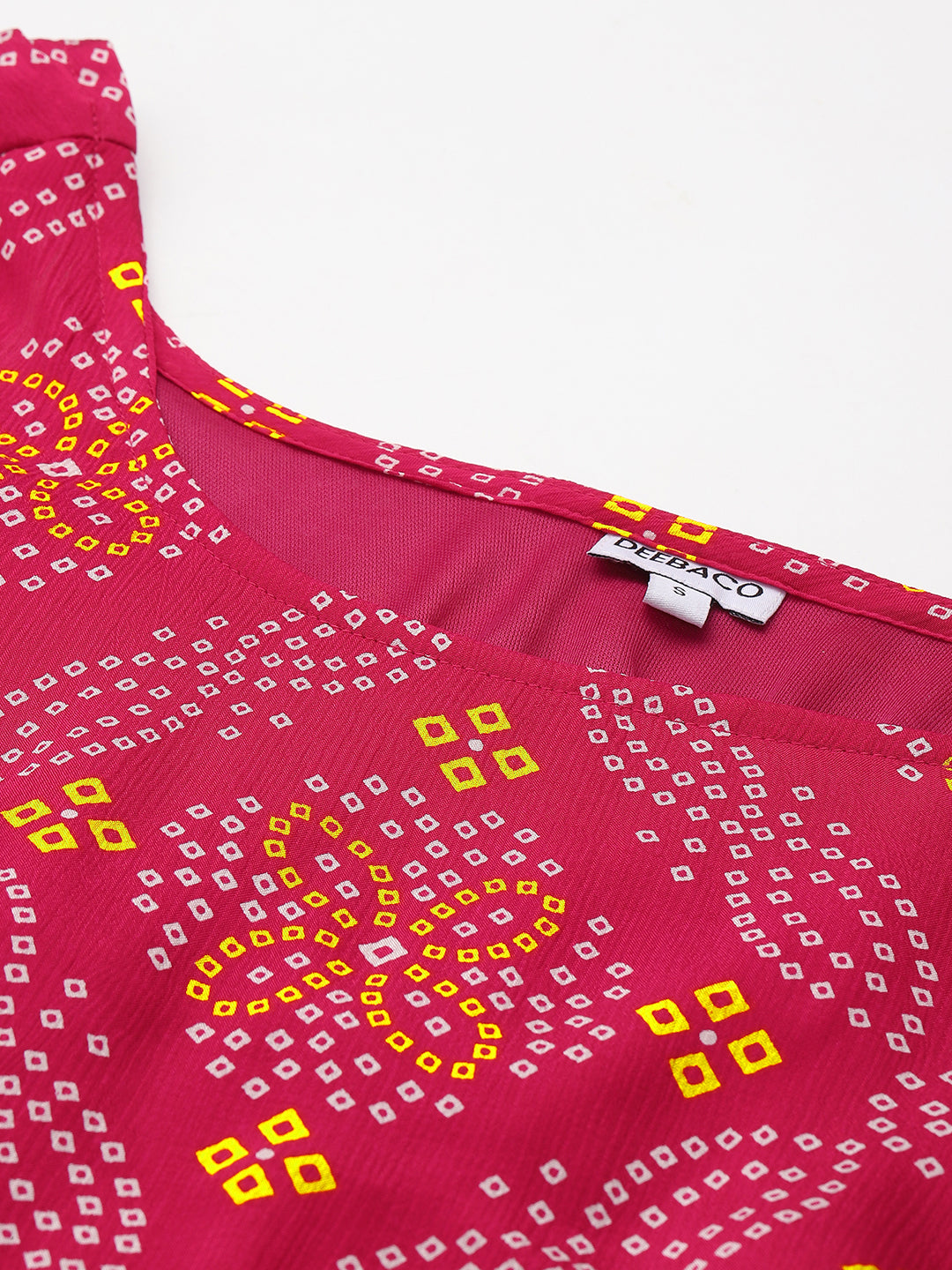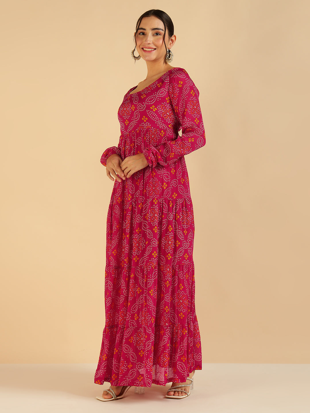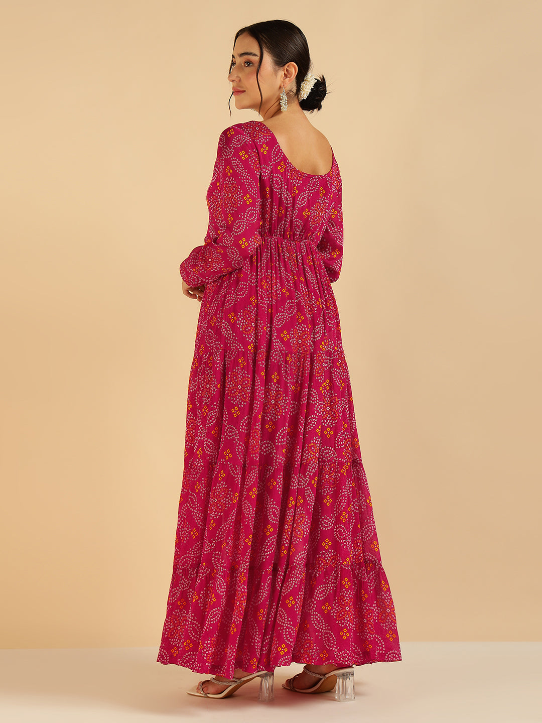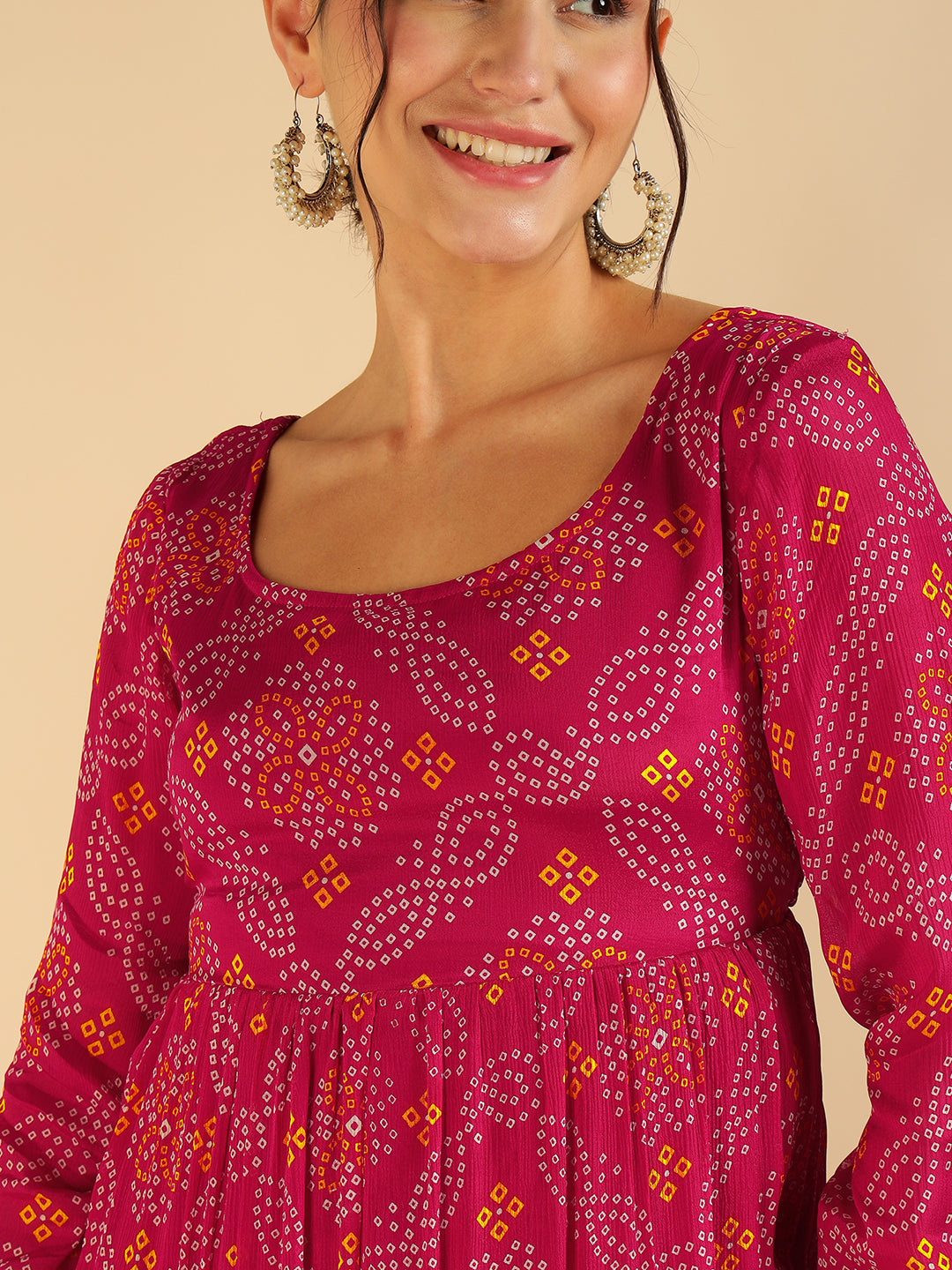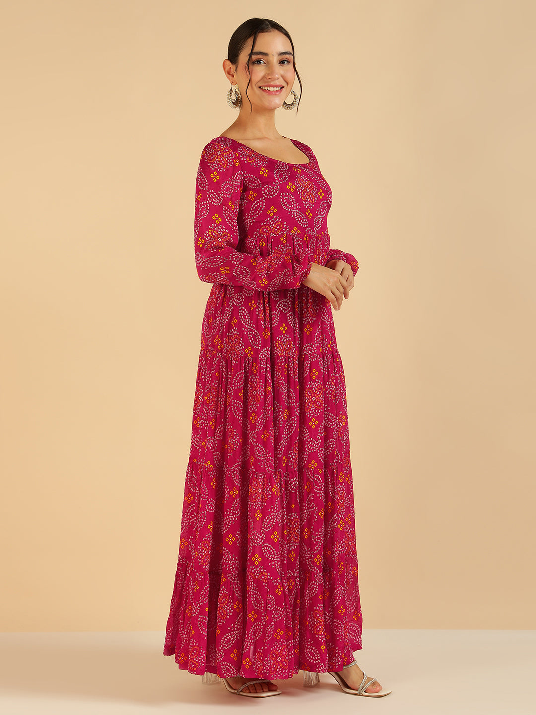 Magenta Bandhani Printed Women Ethnic Tiered Maxi Kurta For Women