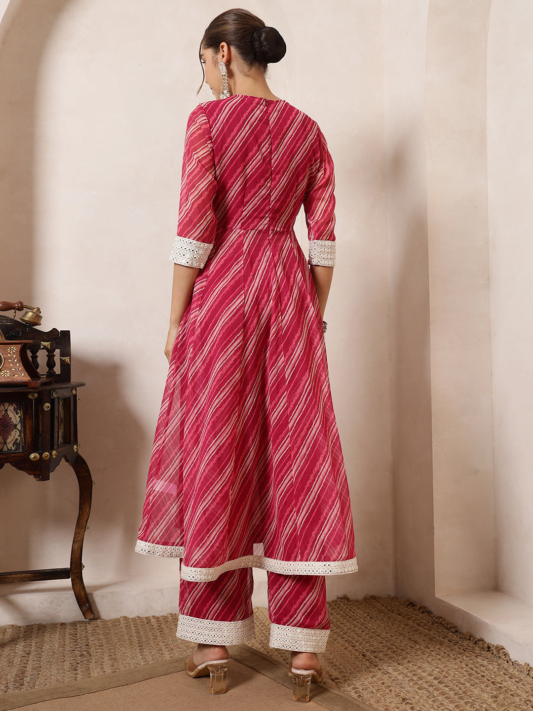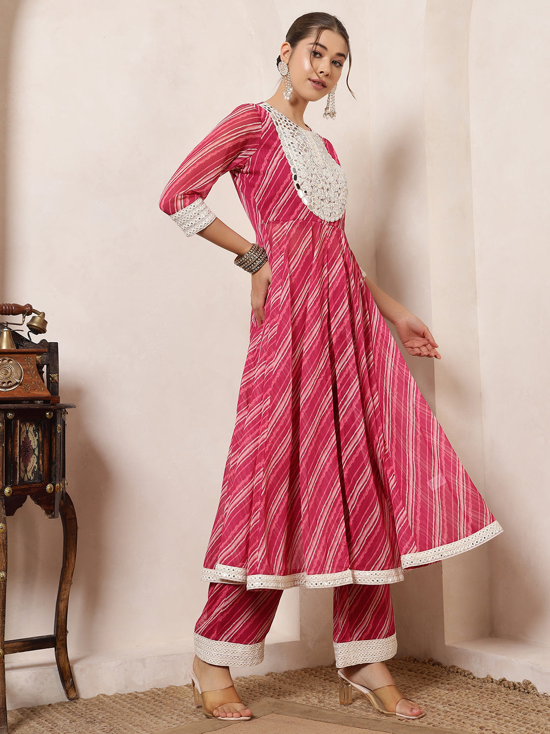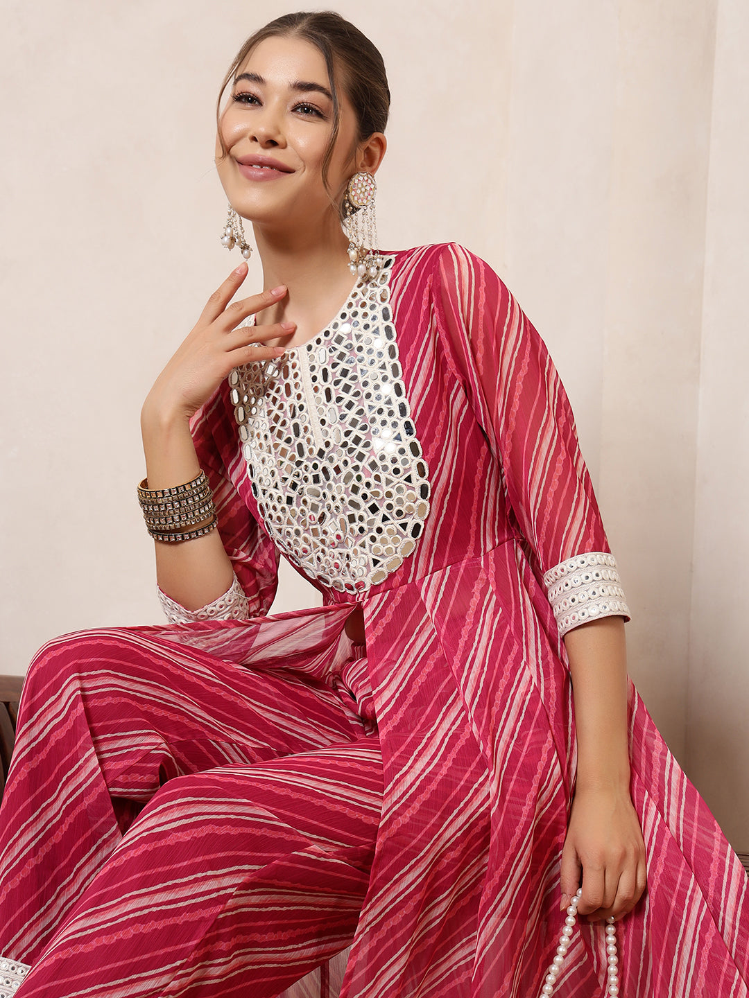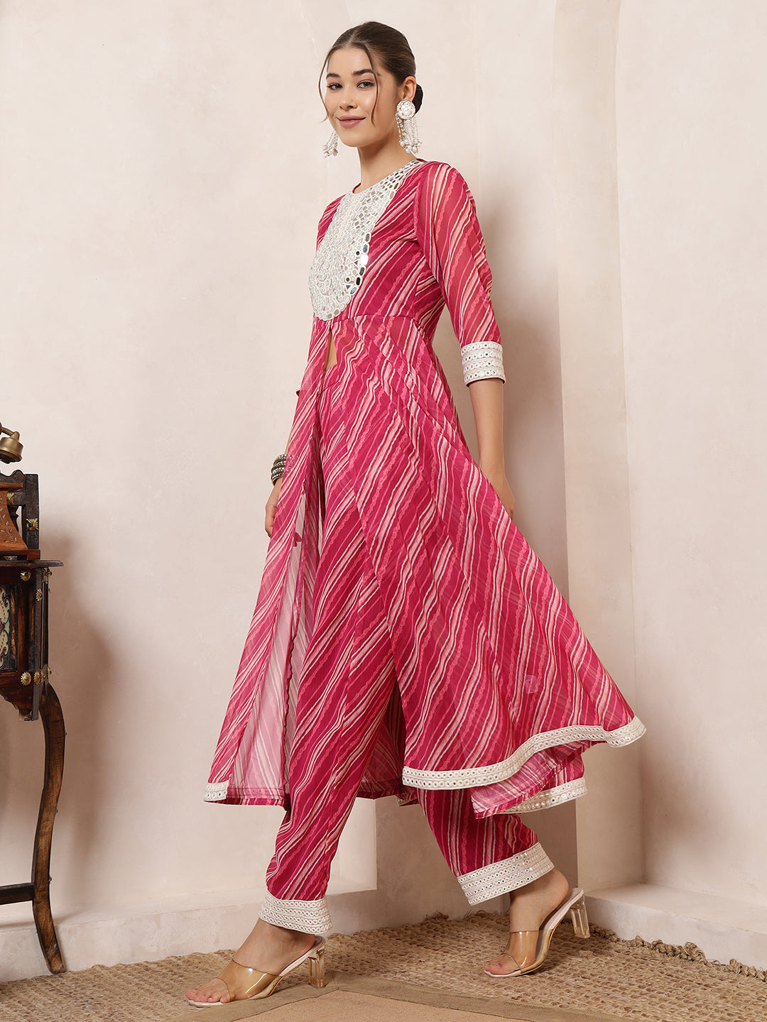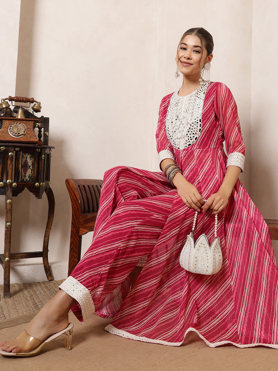 Magenta Pink Laheriya Anarkali Tunic With Embroidered Neck Patch With Palazzo Pant Indo Western Women Co-Ord Set