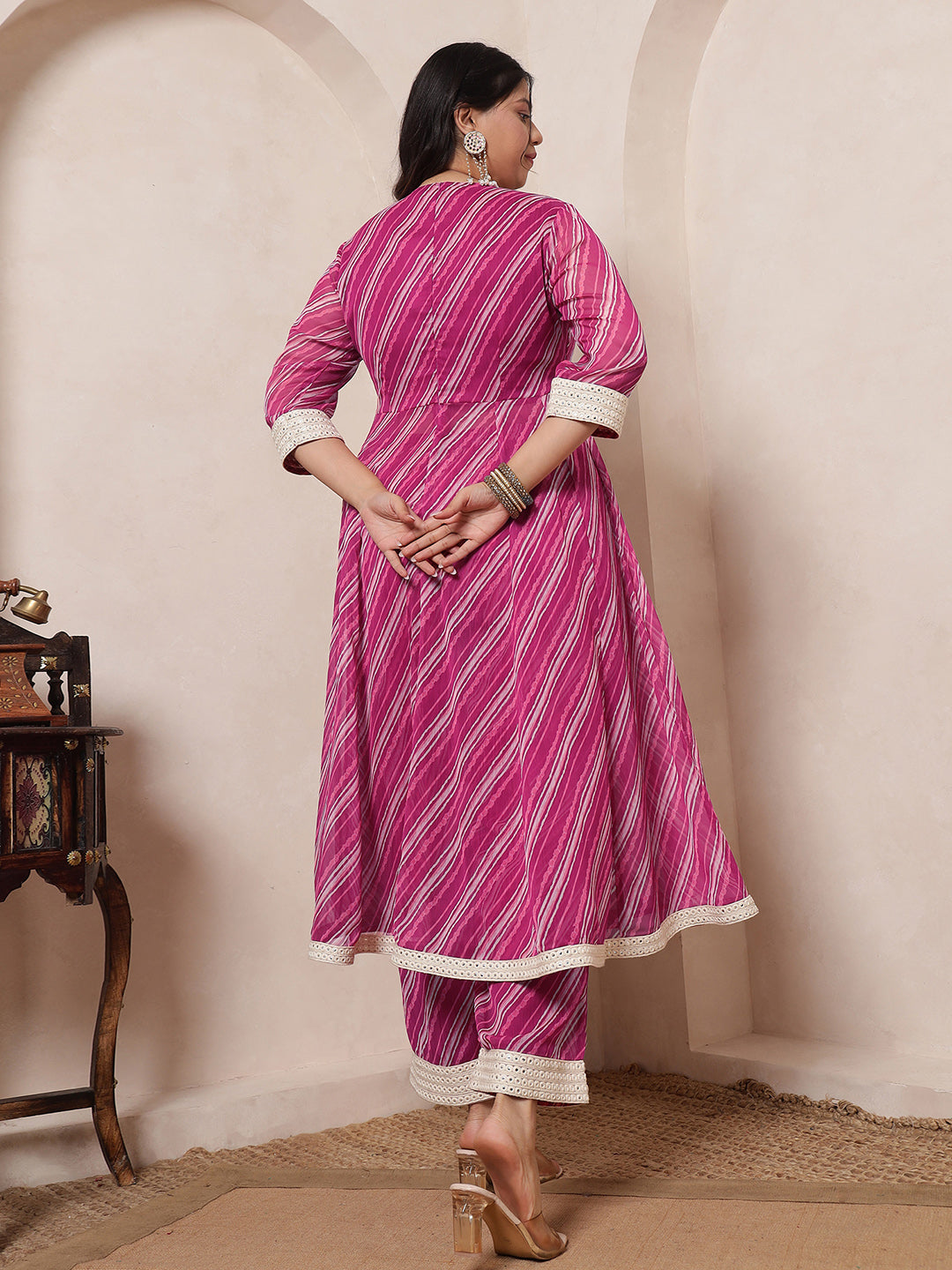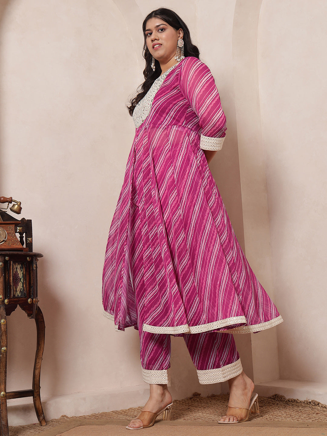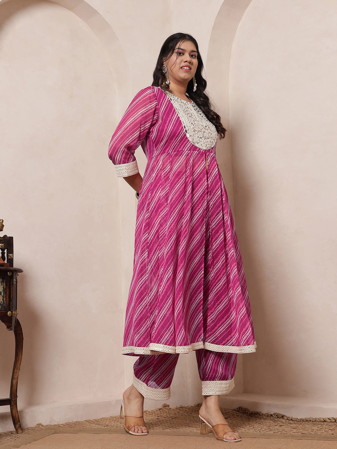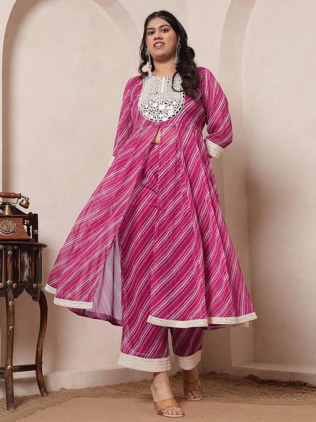 Magenta Pink Laheriya Anarkali Tunic With Embroidered Neck Patch With Palazzo Pant Women Indo Western Women Co-Ord Set