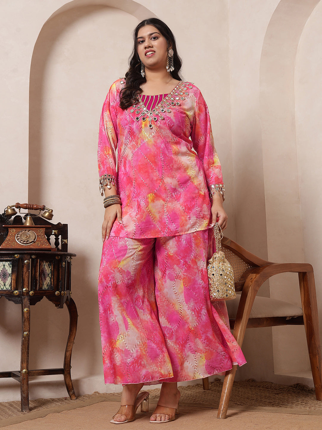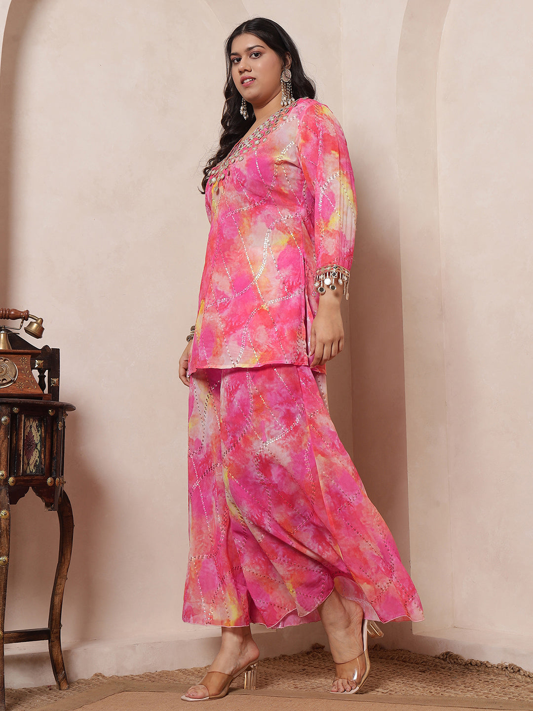Magenta Tie Dye Embroidered Deep Neck Kurta Inner Crop Top With Sharara Women's Plus Size 3 Piece Set