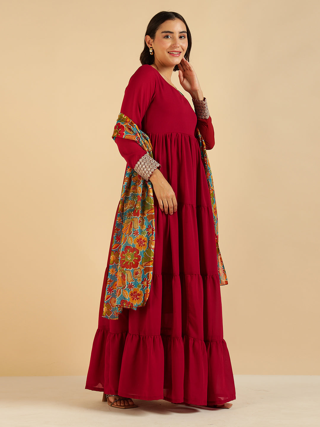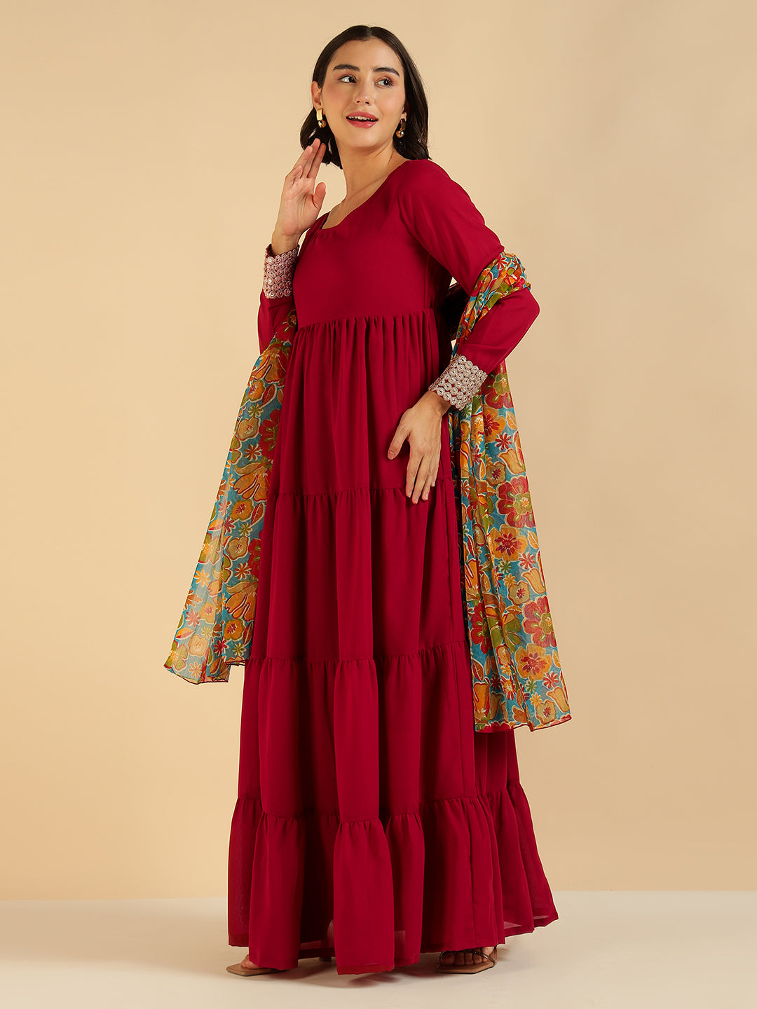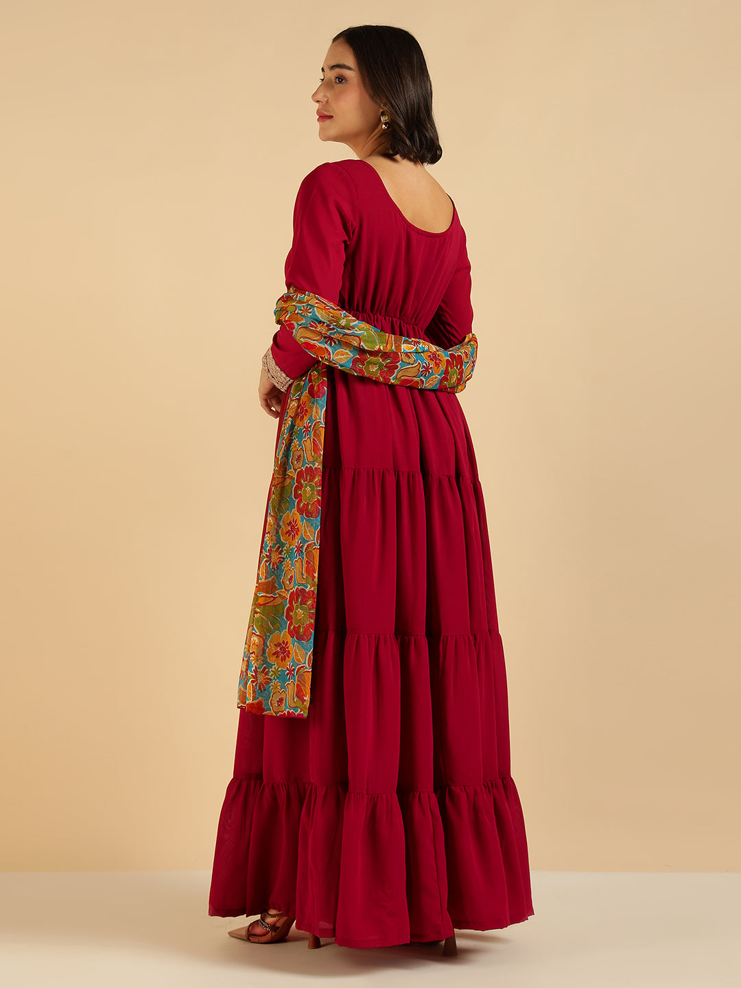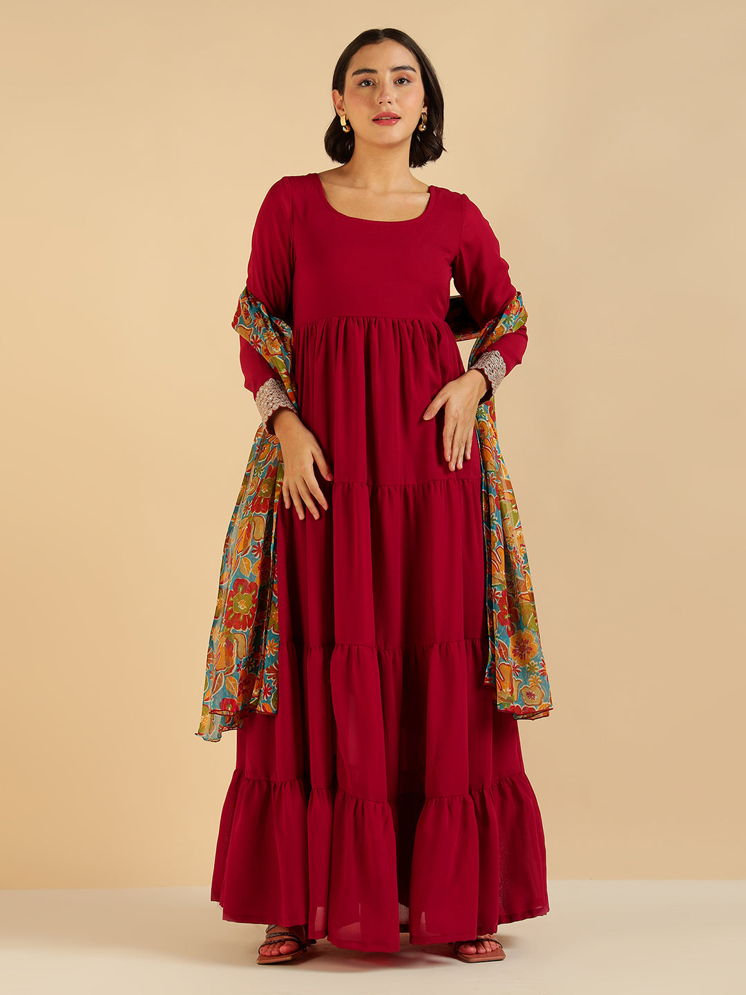 Maroon Tiered Mai Ethnic Kurta With Floral Printed Dupatta Set For Women