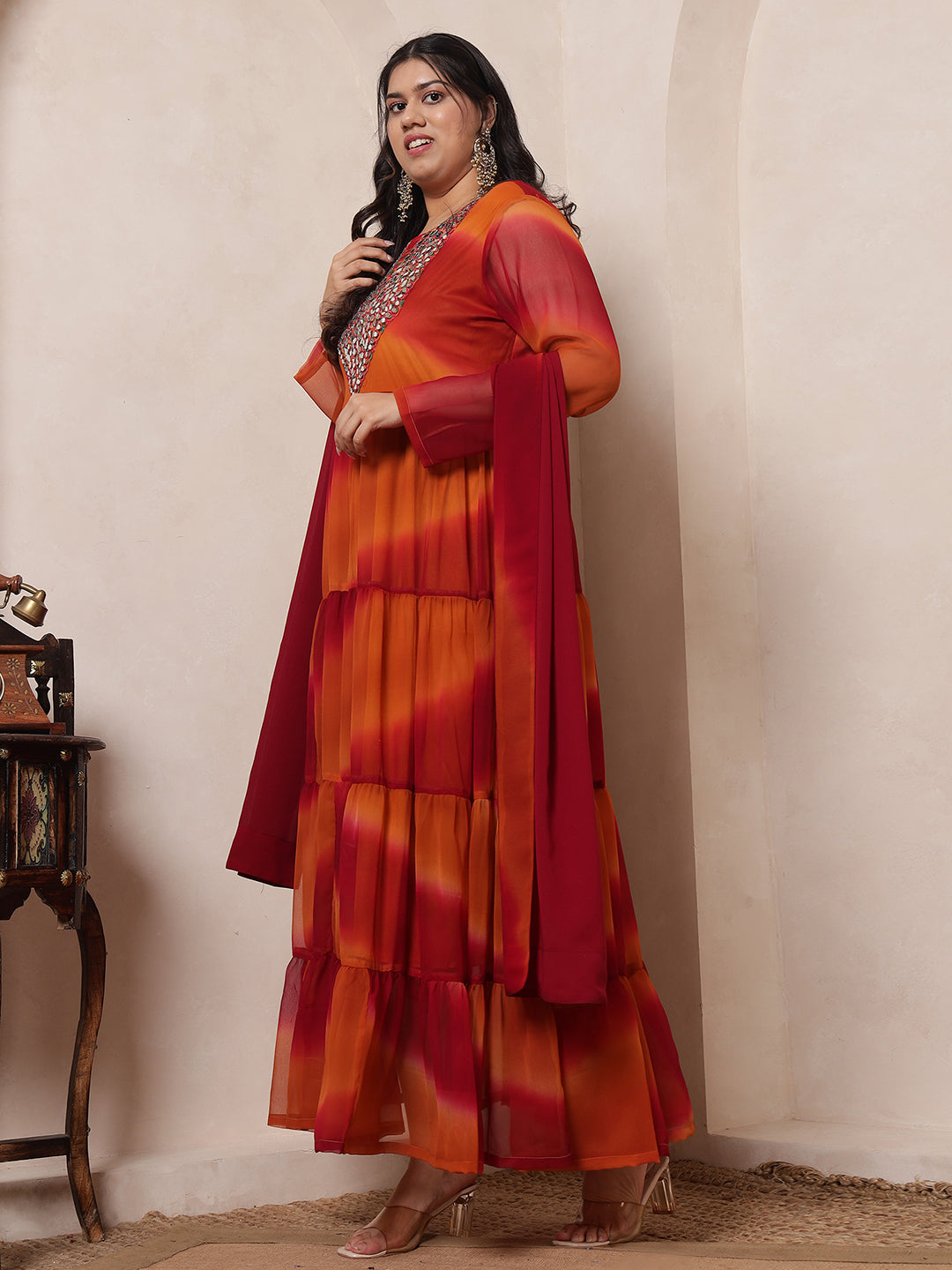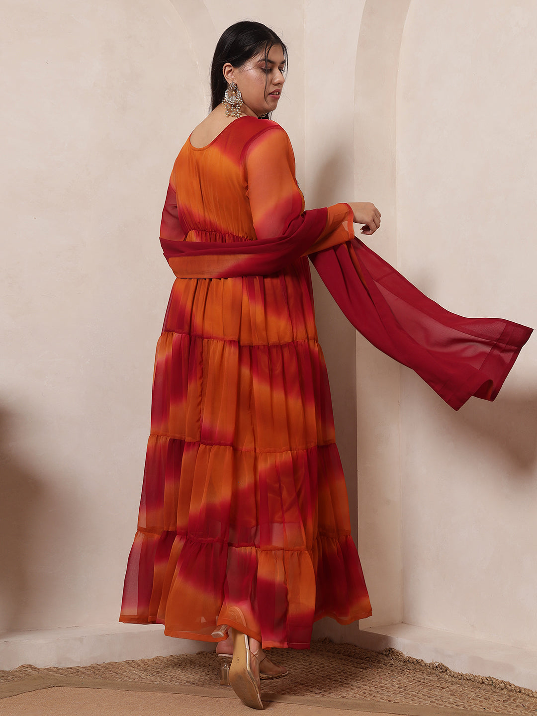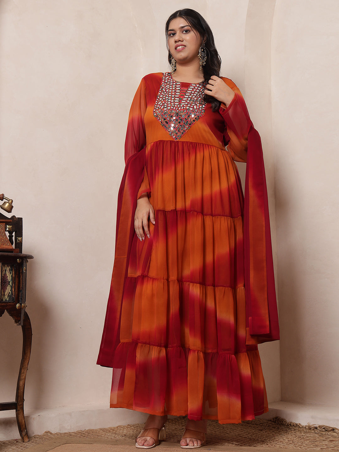 Maroon With Mustard Ombre Printed Tiered Maxi Ethnic Kurta With Embroidered Neck Patch With Dupatta For Women