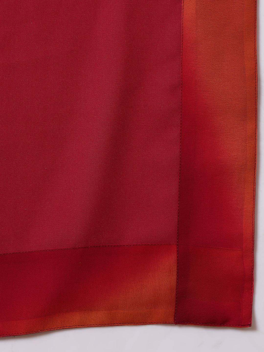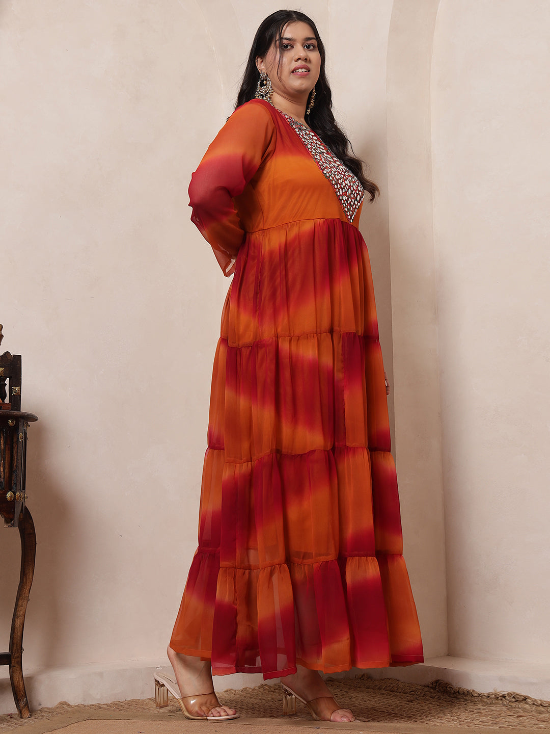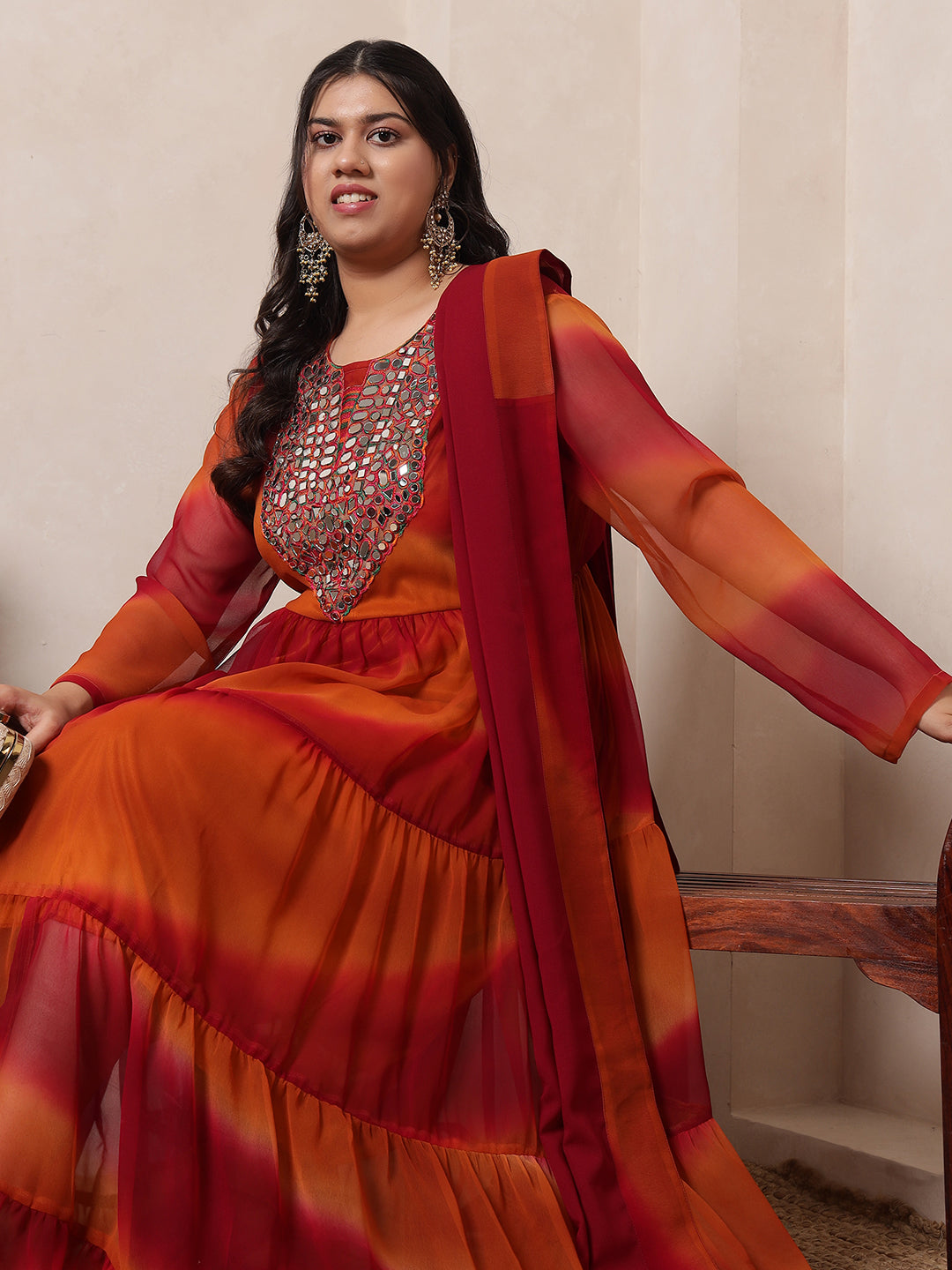 Maroon With Mustard Ombre Printed Tiered Maxi Ethnic Kurta With Embroidered Neck Patch With Dupatta For Women