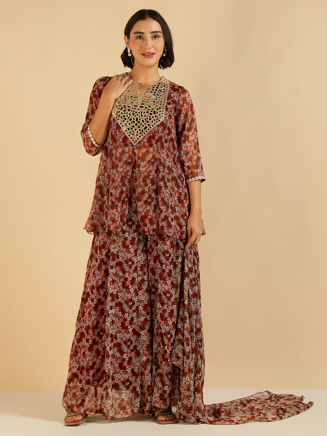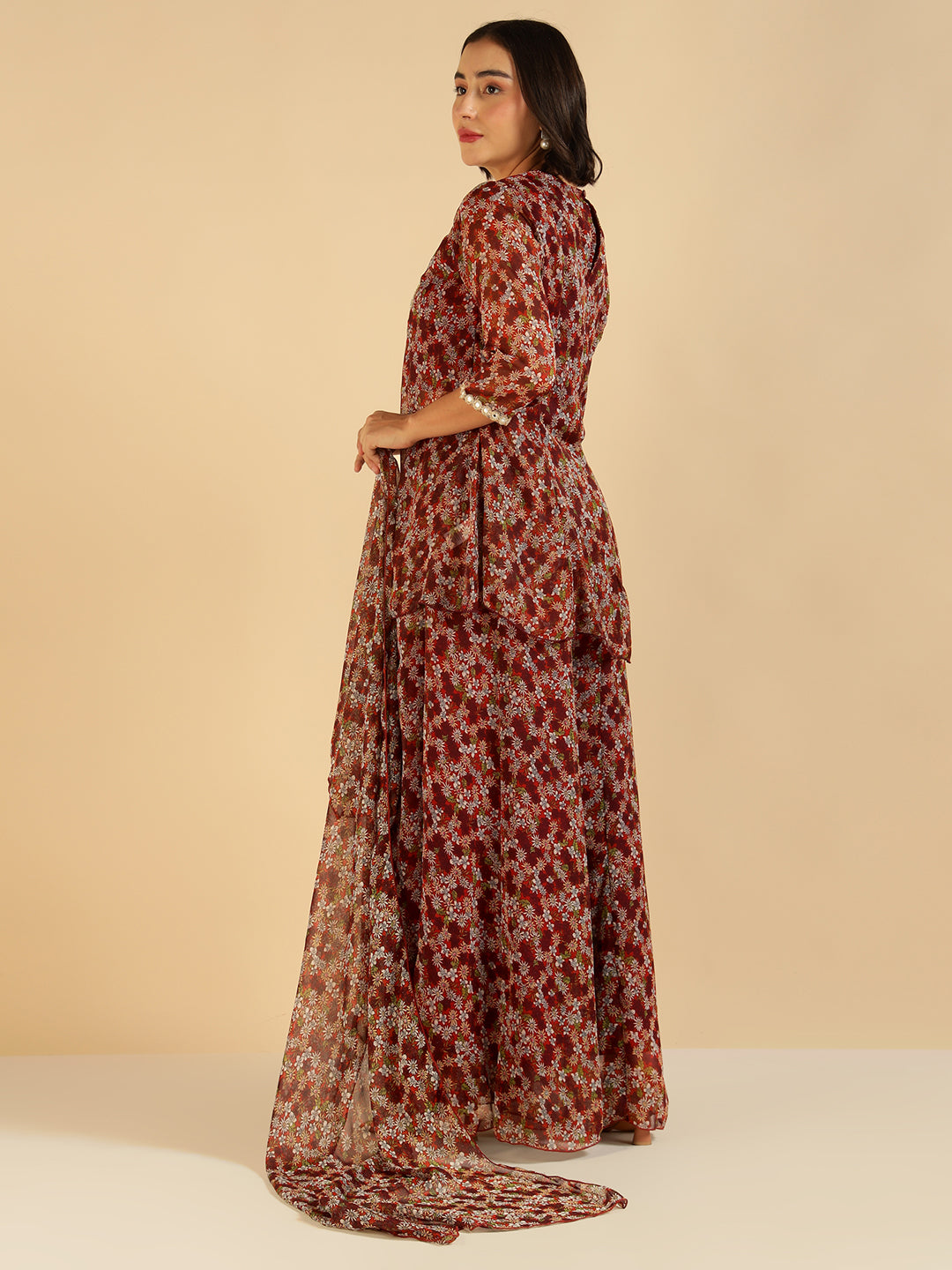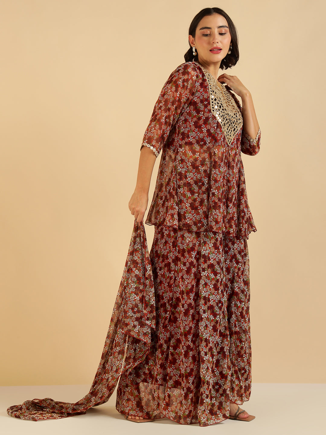 Multi Floral Peplum Top & Sharara With Dupatta Fusion Women Co-Ord Set