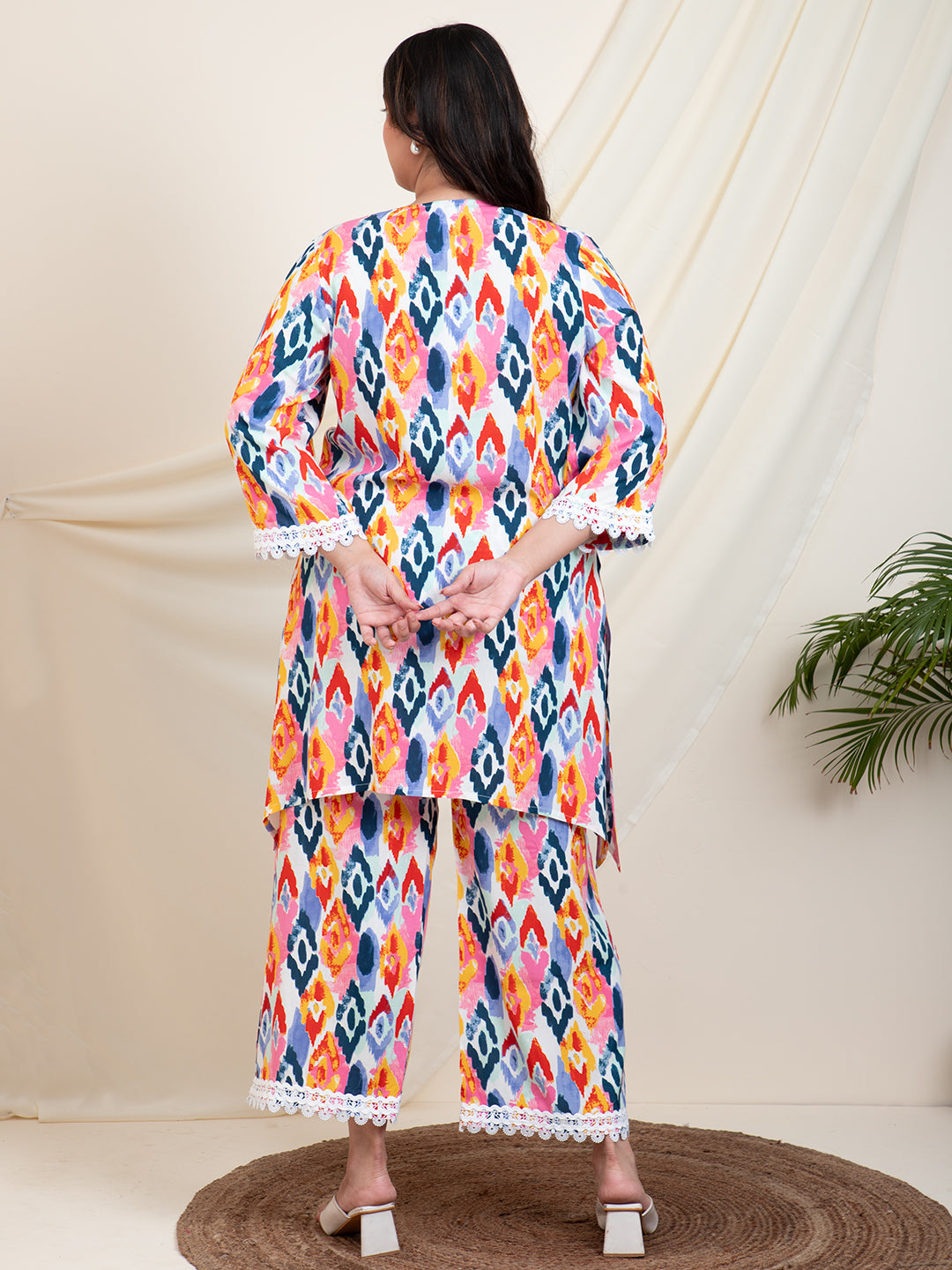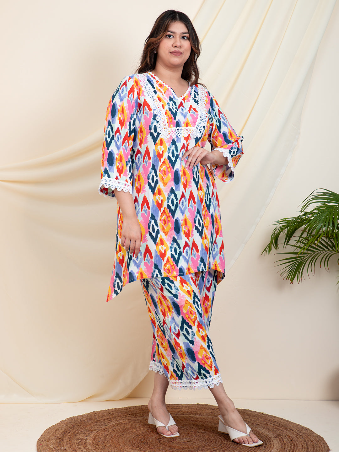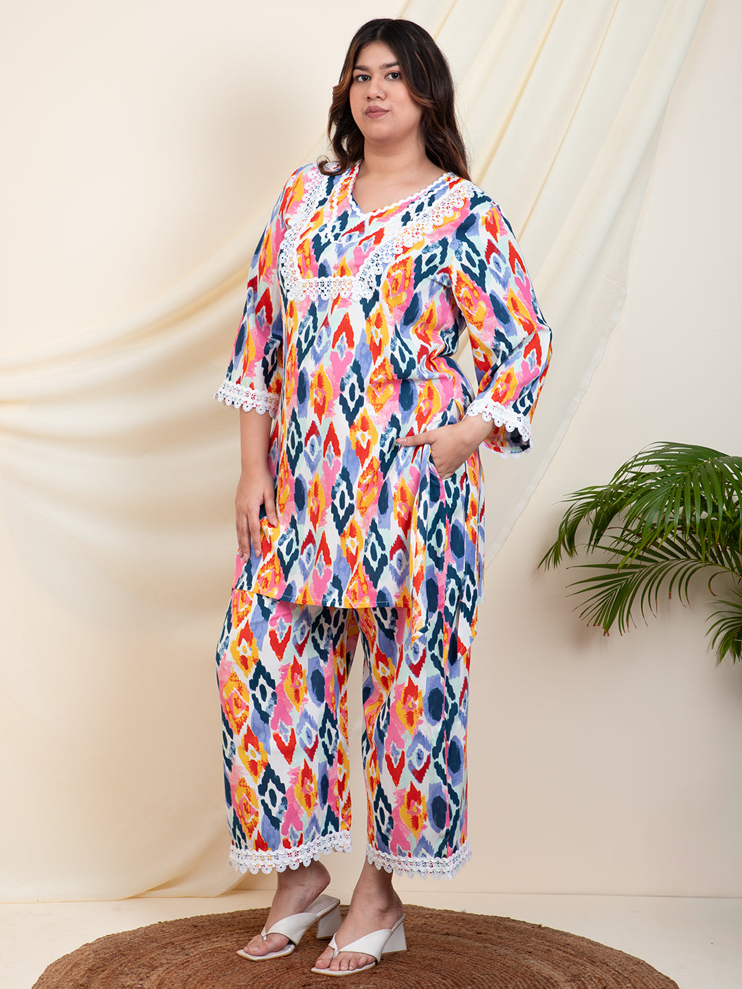 Multi Plus SIze Colour Ikkat Printed Kurta With Palazzo Women Plus SIze Co-Ord Set