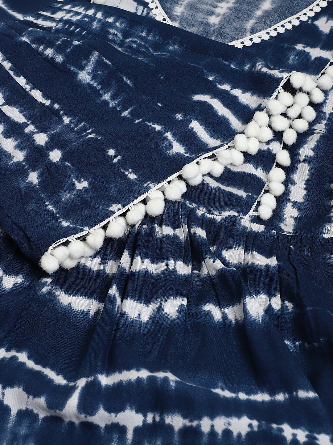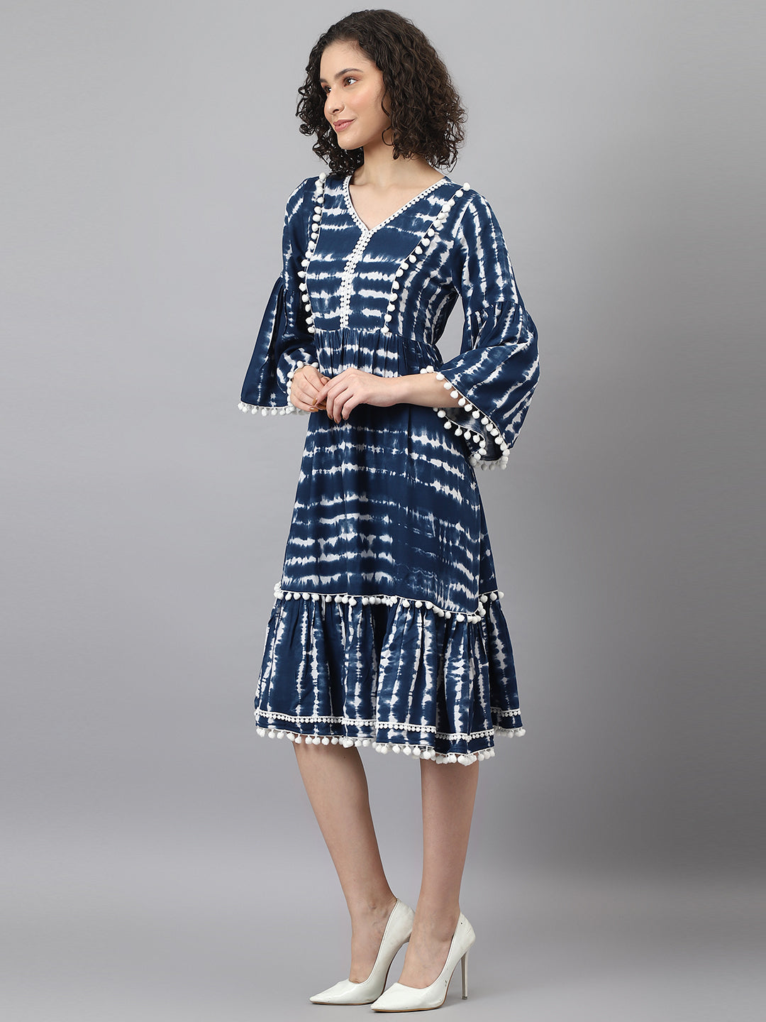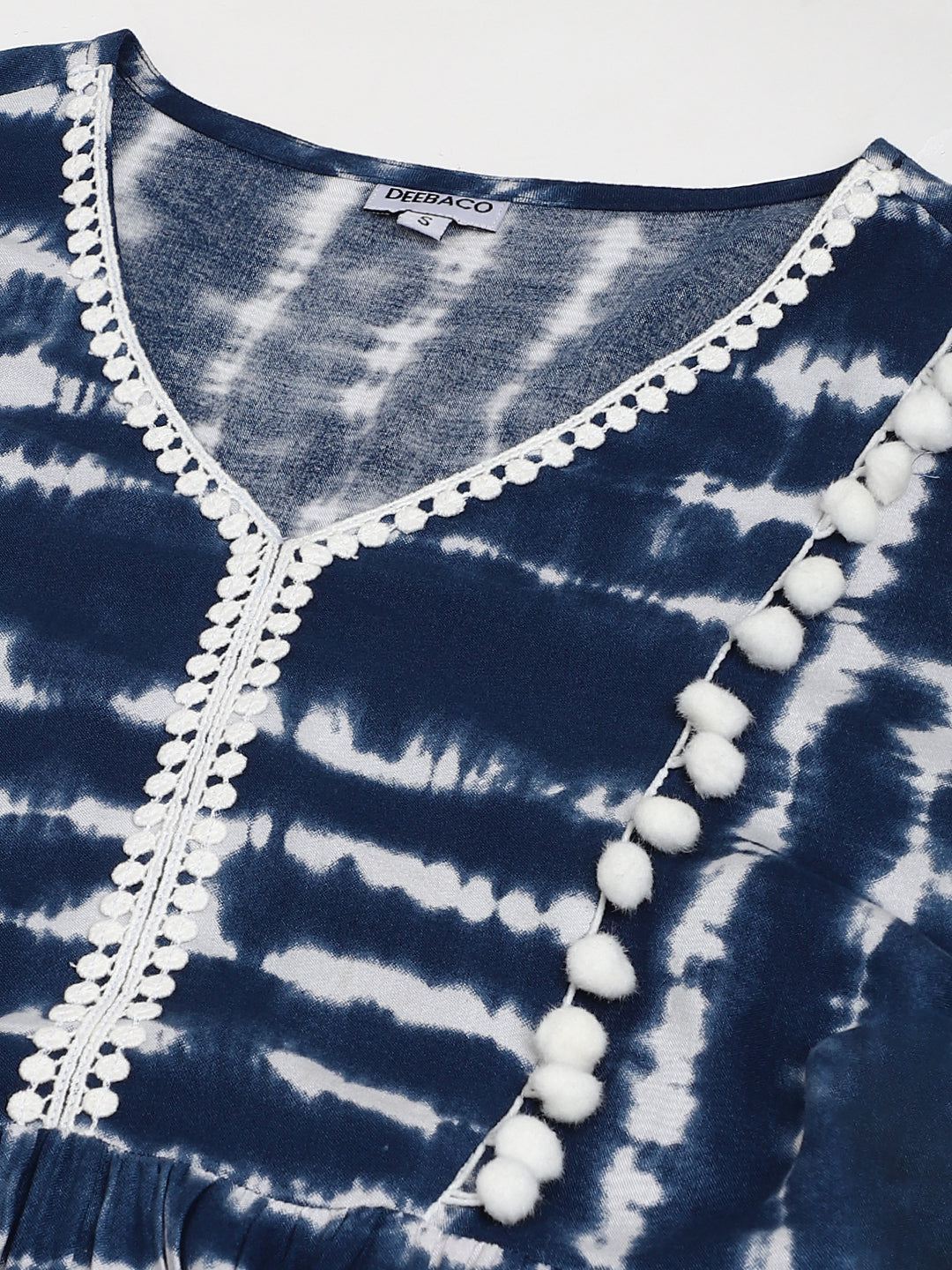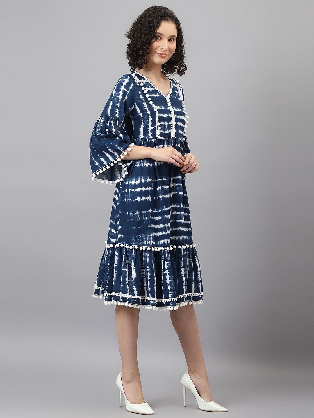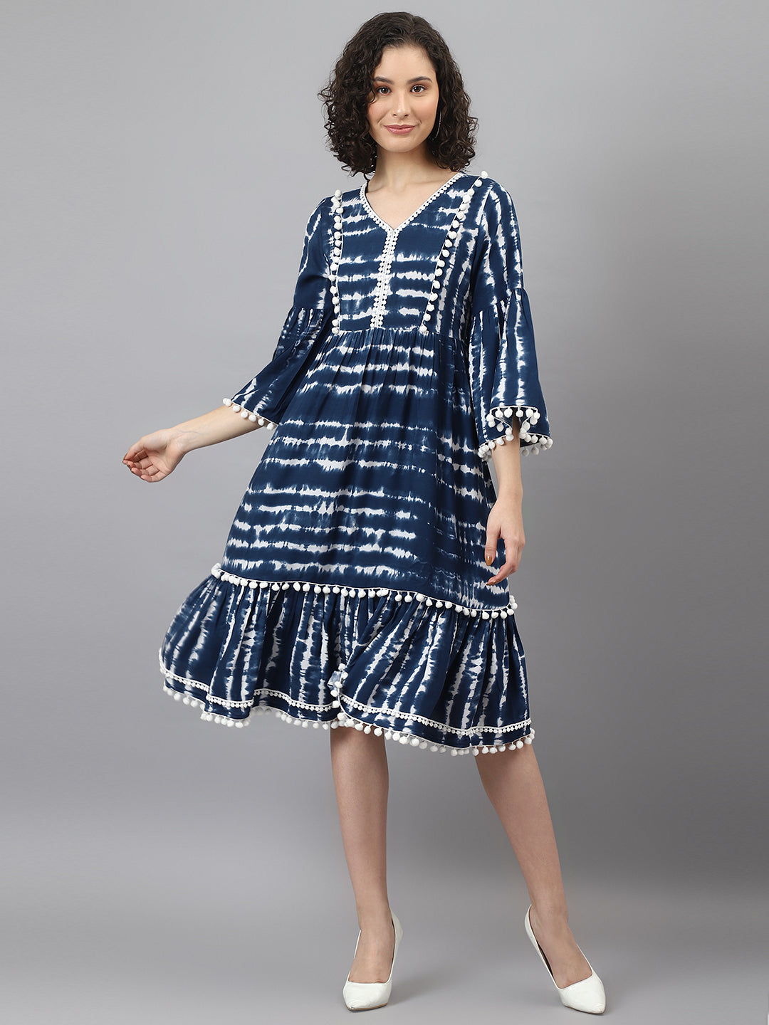 Blue dress supremacy now and forever! The tie and dye technique adds that classy touch to the dress while the pom pom lace and woven lace give it a fashionable spin. The frilly 3/4th sleeves will make your heart sing and the V-neckline will invite you to style it creatively. Pair this tiered dress (back elastic included) with a white crossbody bag and white wedges. The final ensemble will be a perfect fit for semi-formal events such as brunches or a pre-dinner soiree.