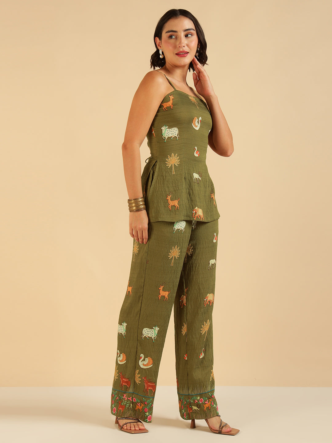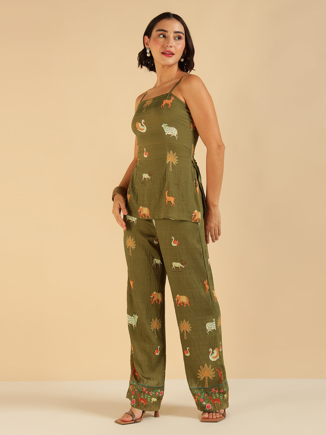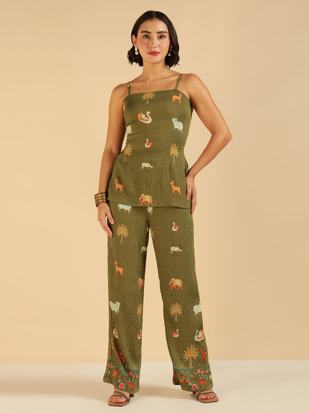 Olive Green Animal Border Printed Top & Pant Women Co-Ord Set