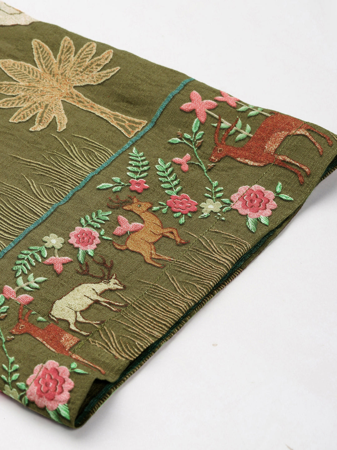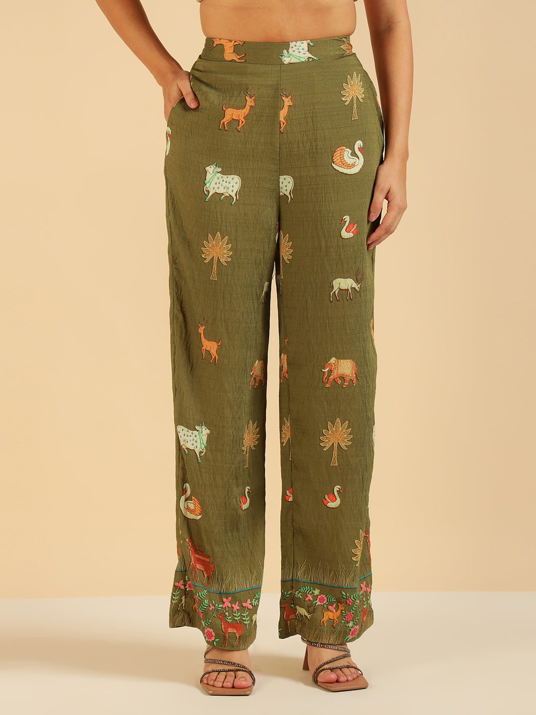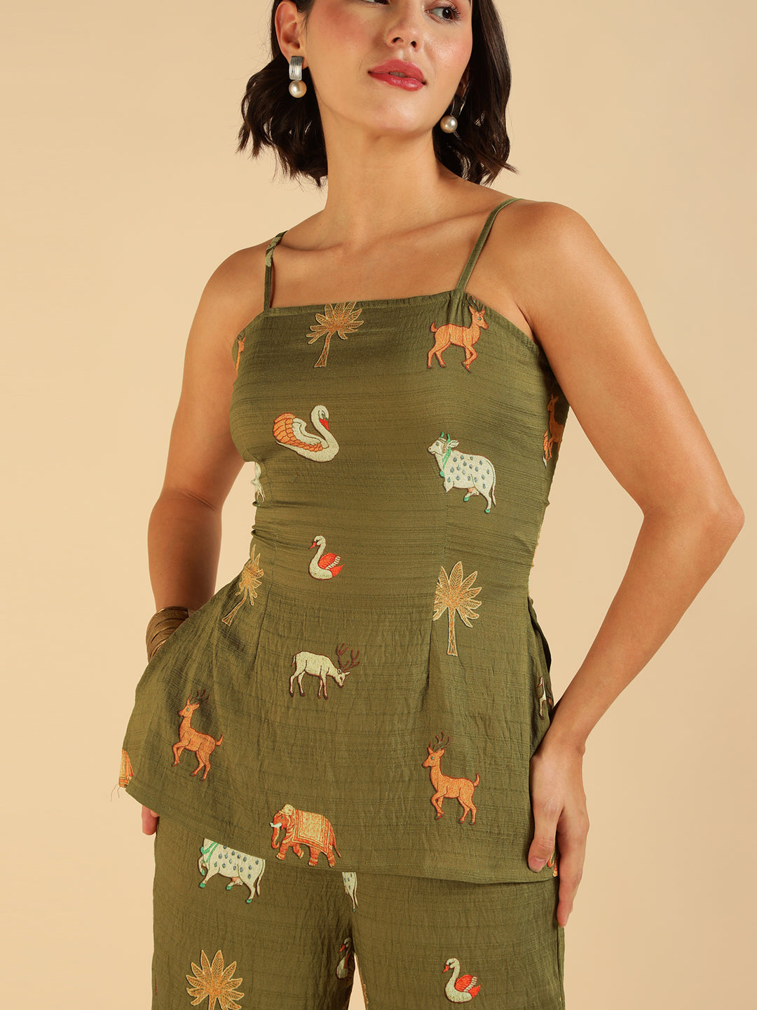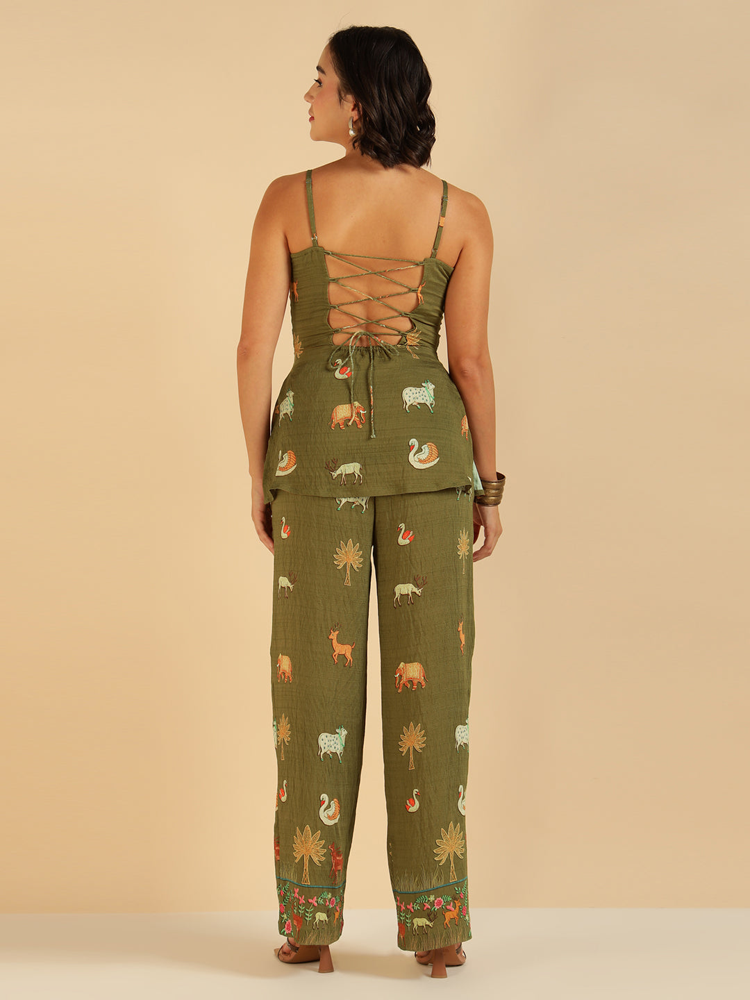 Olive Green Animal Border Printed Top & Pant Women Co-Ord Set