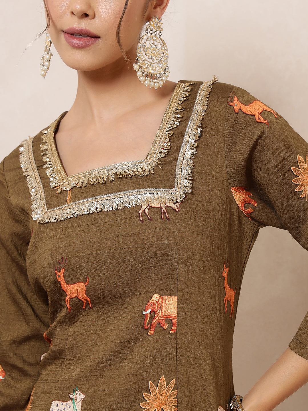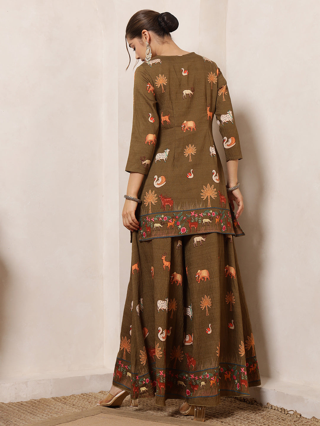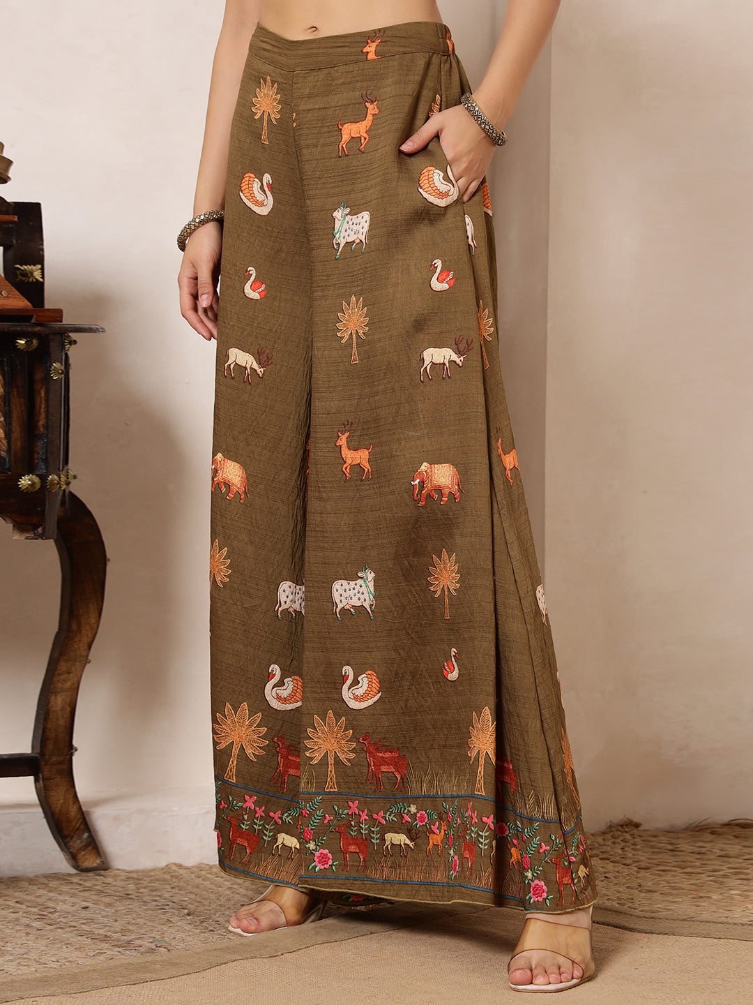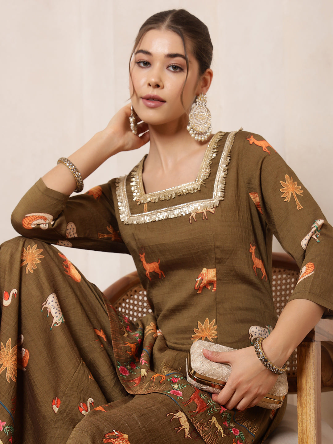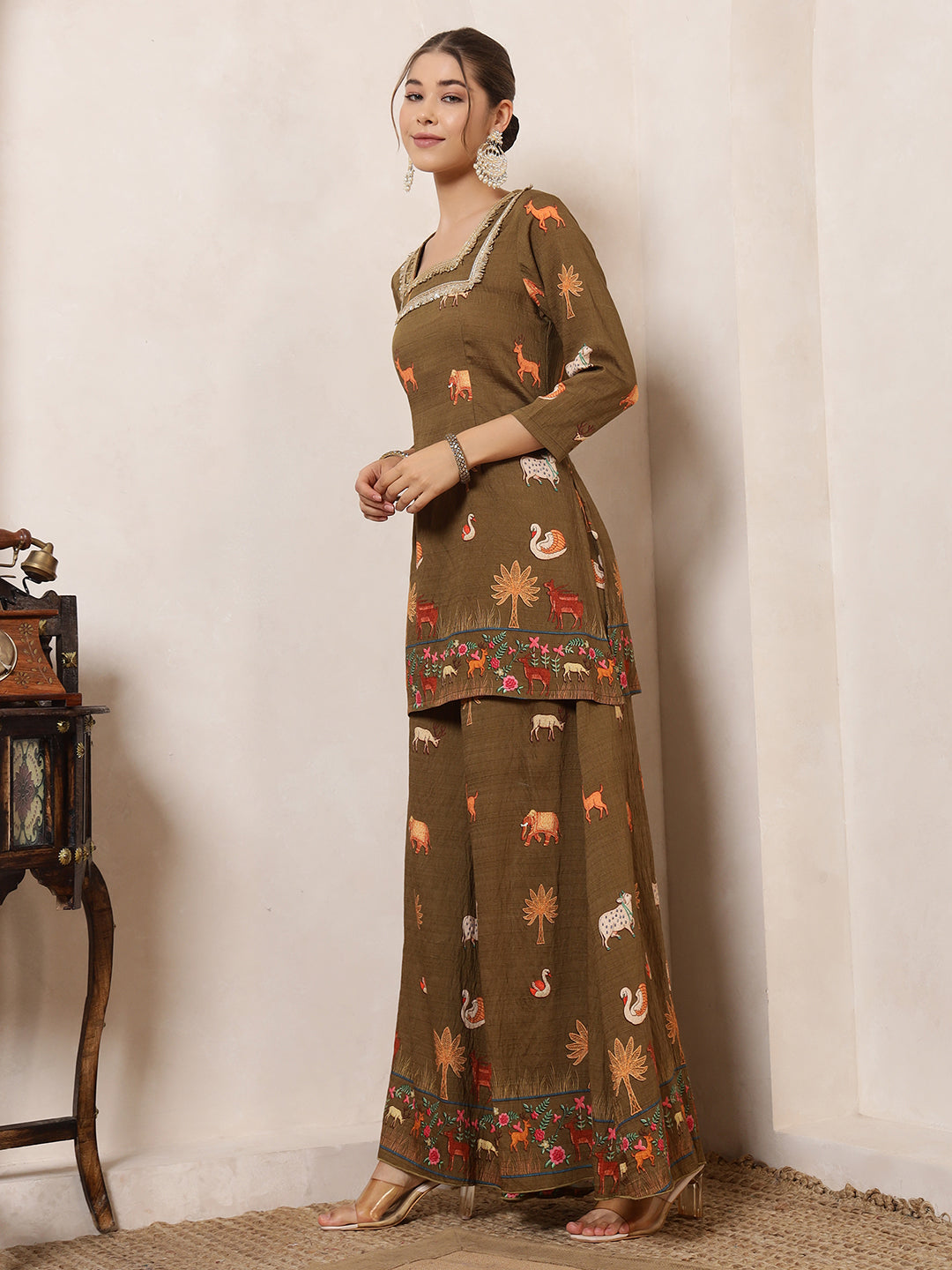 Olive Green Animal Printed Kurti With Palazzo Indo Western Women Co-Ord Set