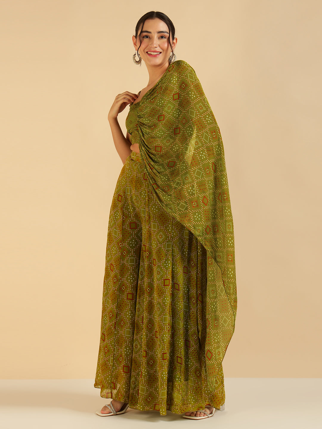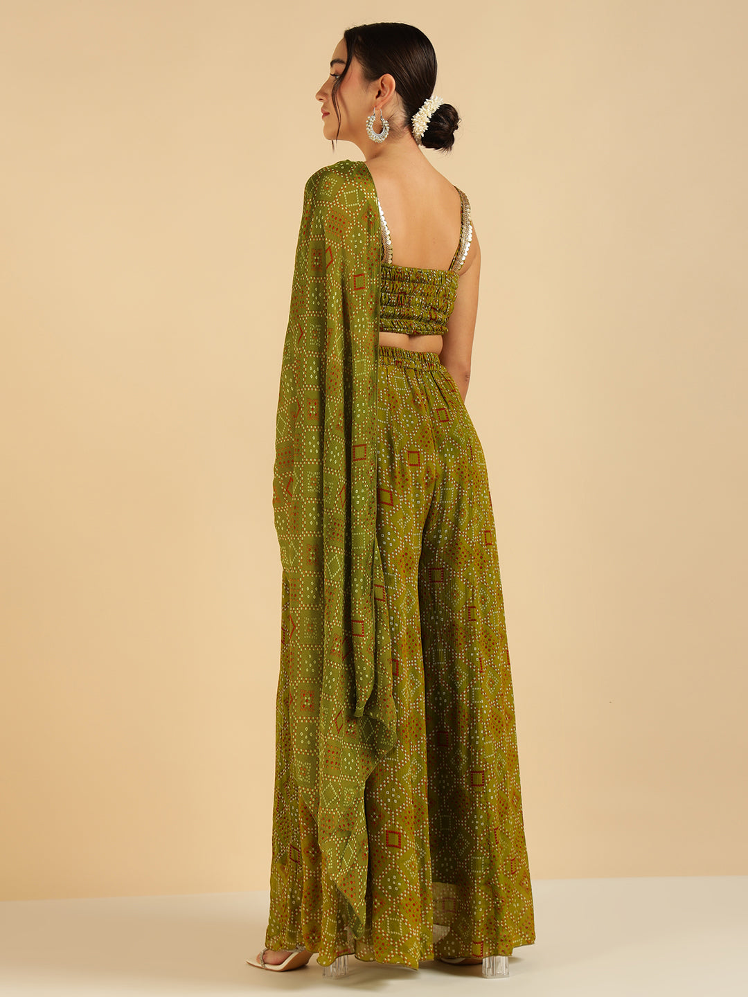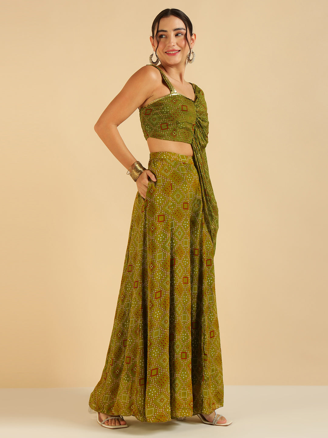 Olive Green Bandhani Printed Crop Top With Sharara Saree Fusion Co-Ord Set