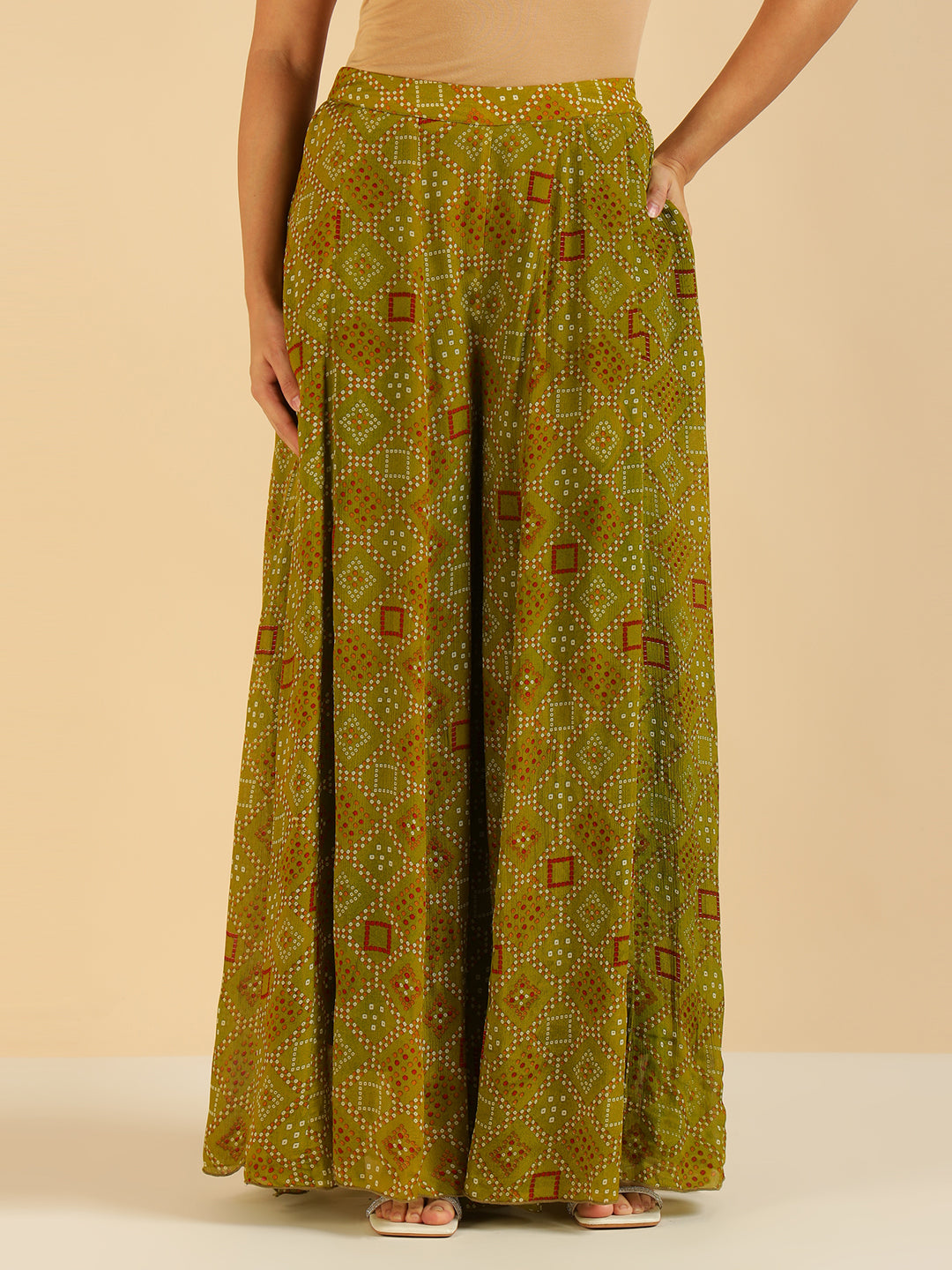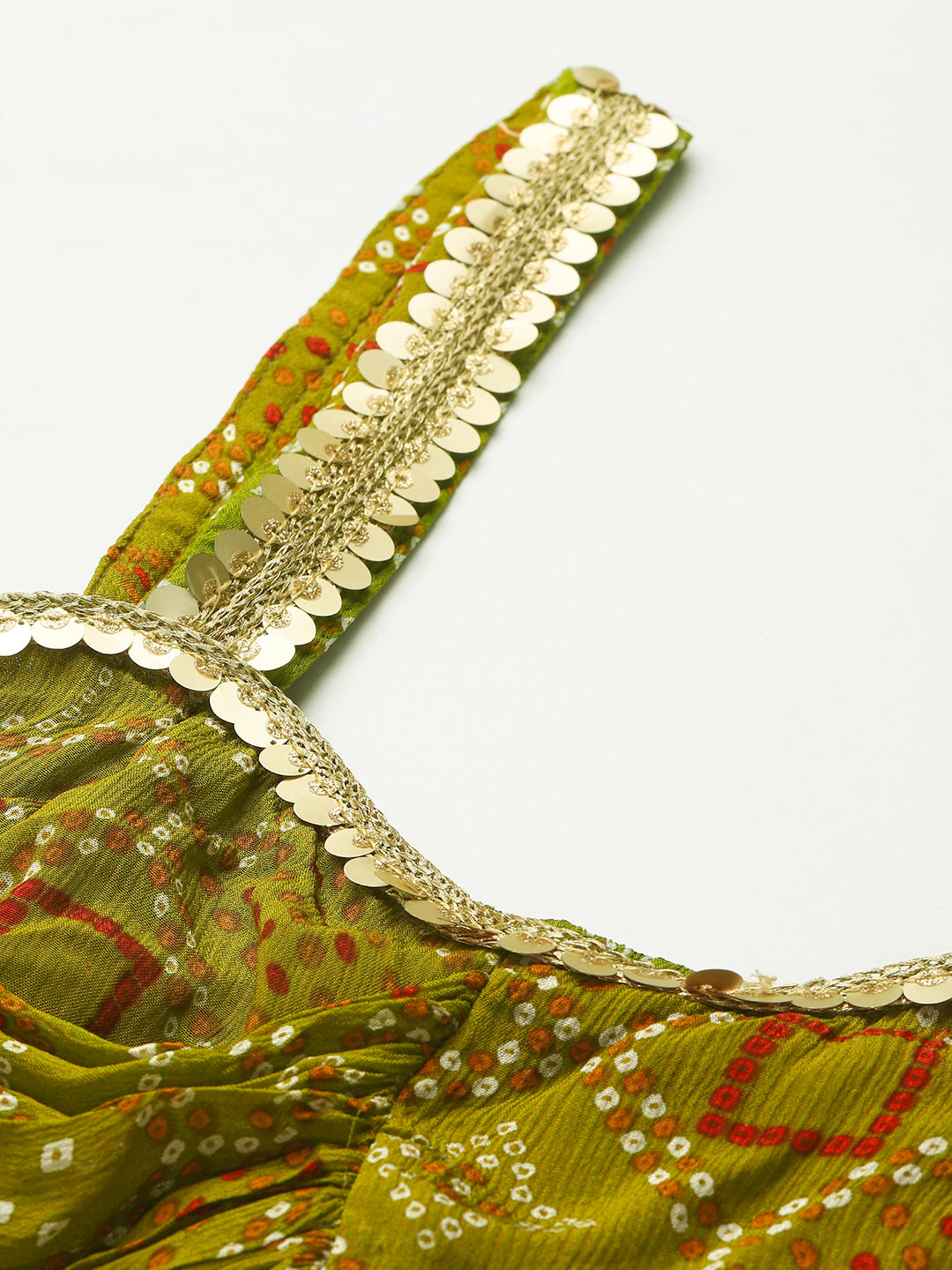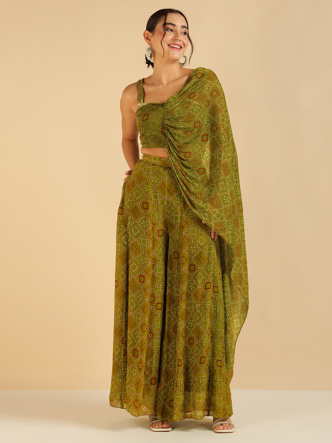 Olive Green Bandhani Printed Crop Top With Sharara Saree Fusion Co-Ord Set