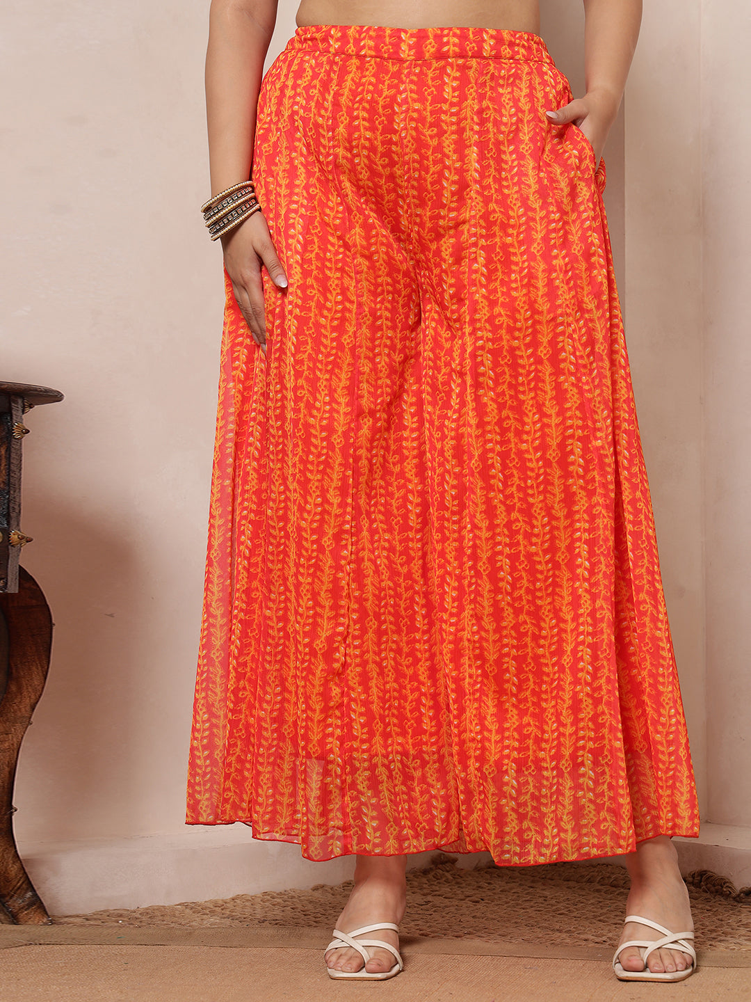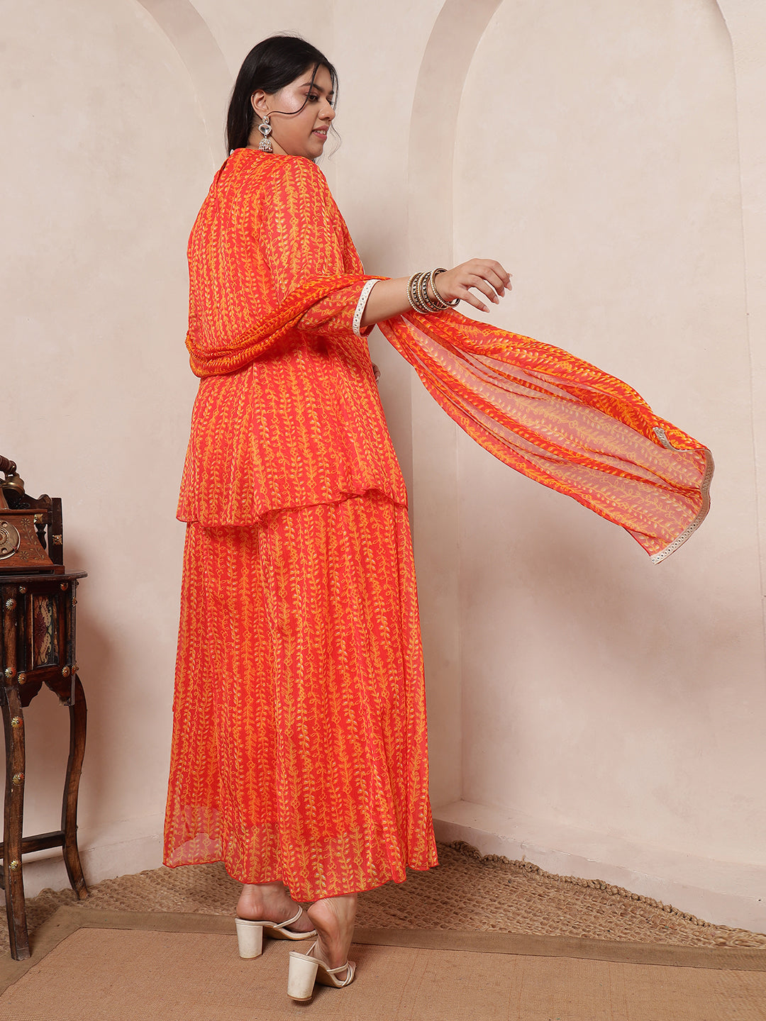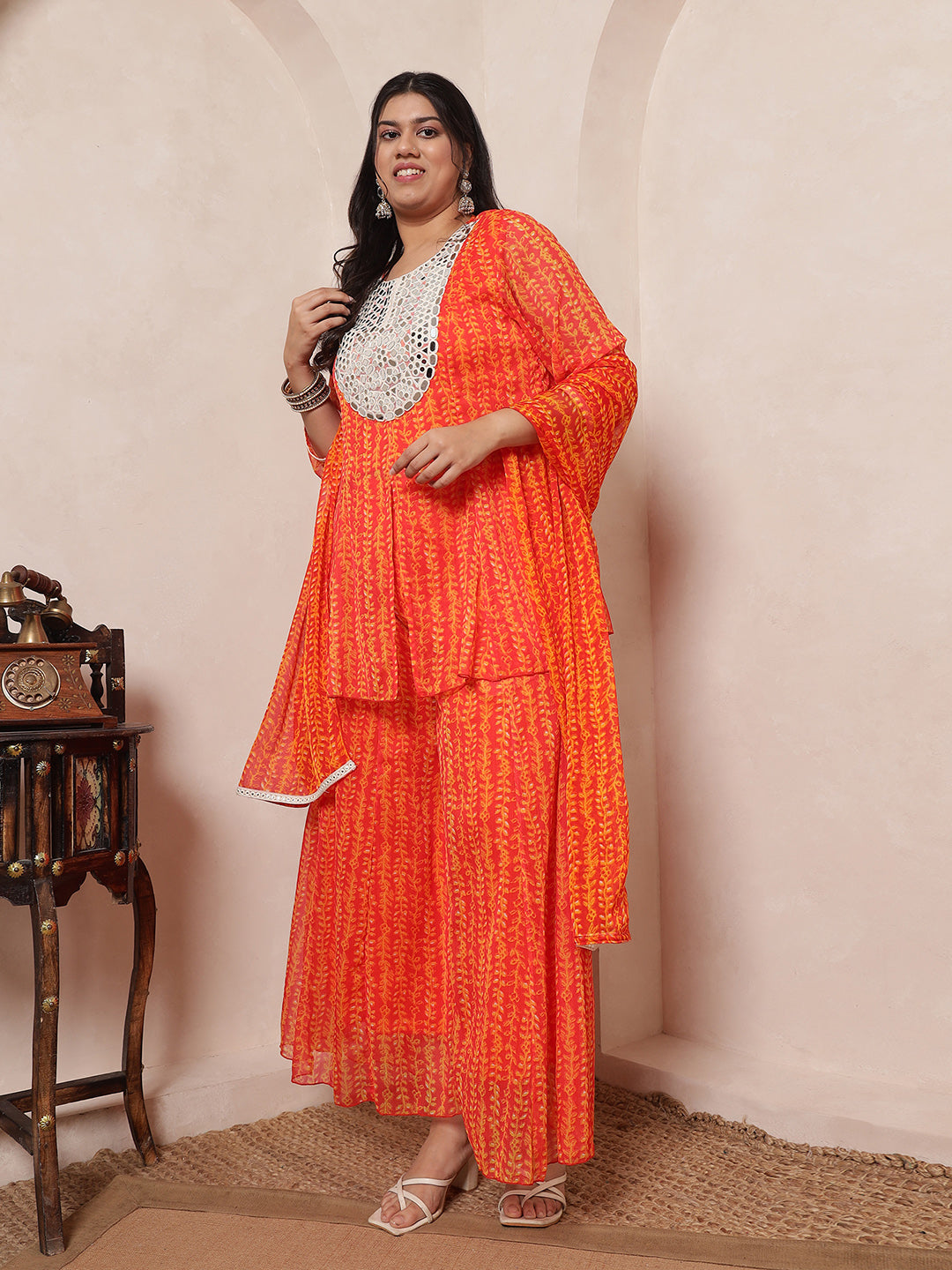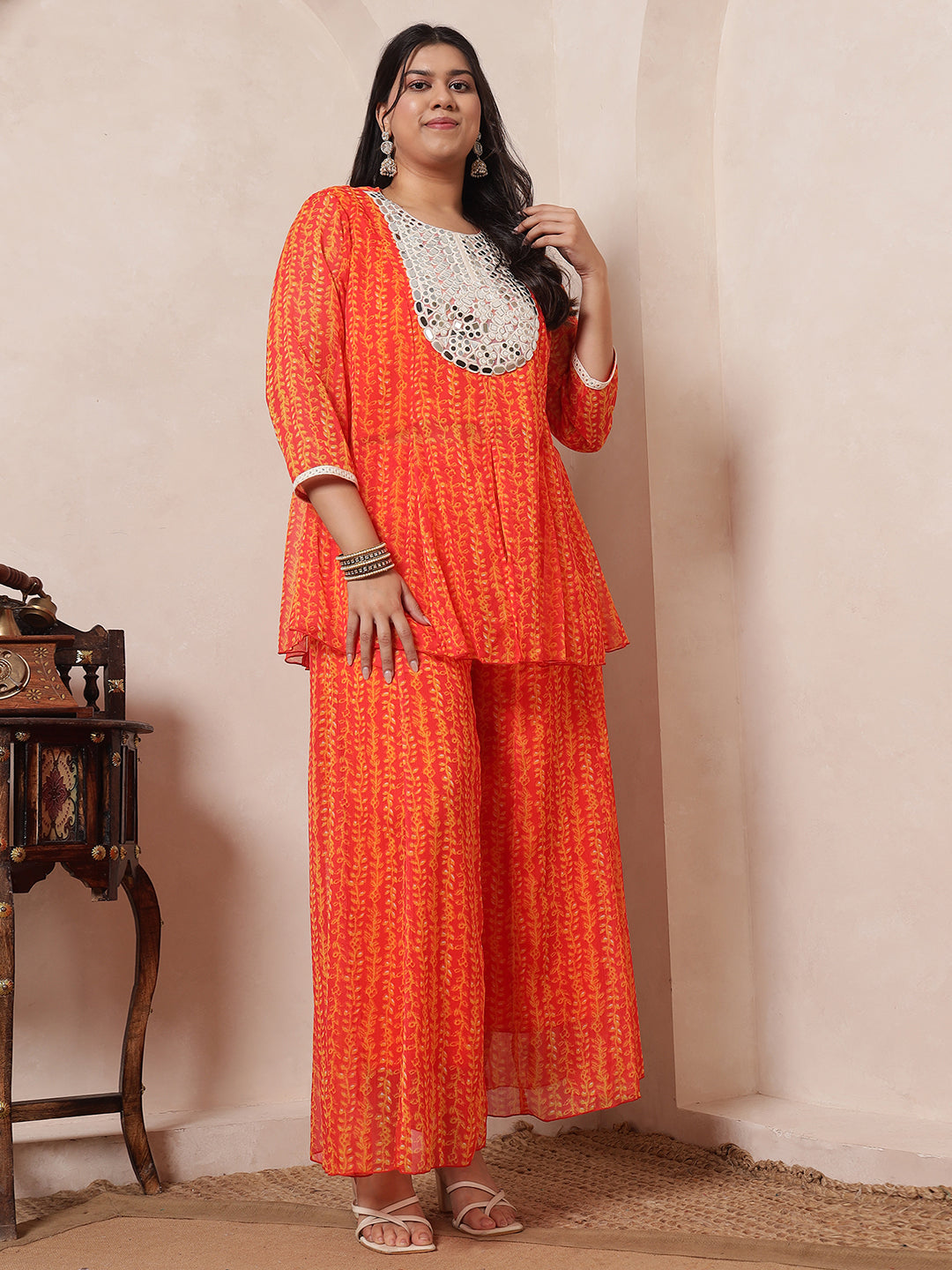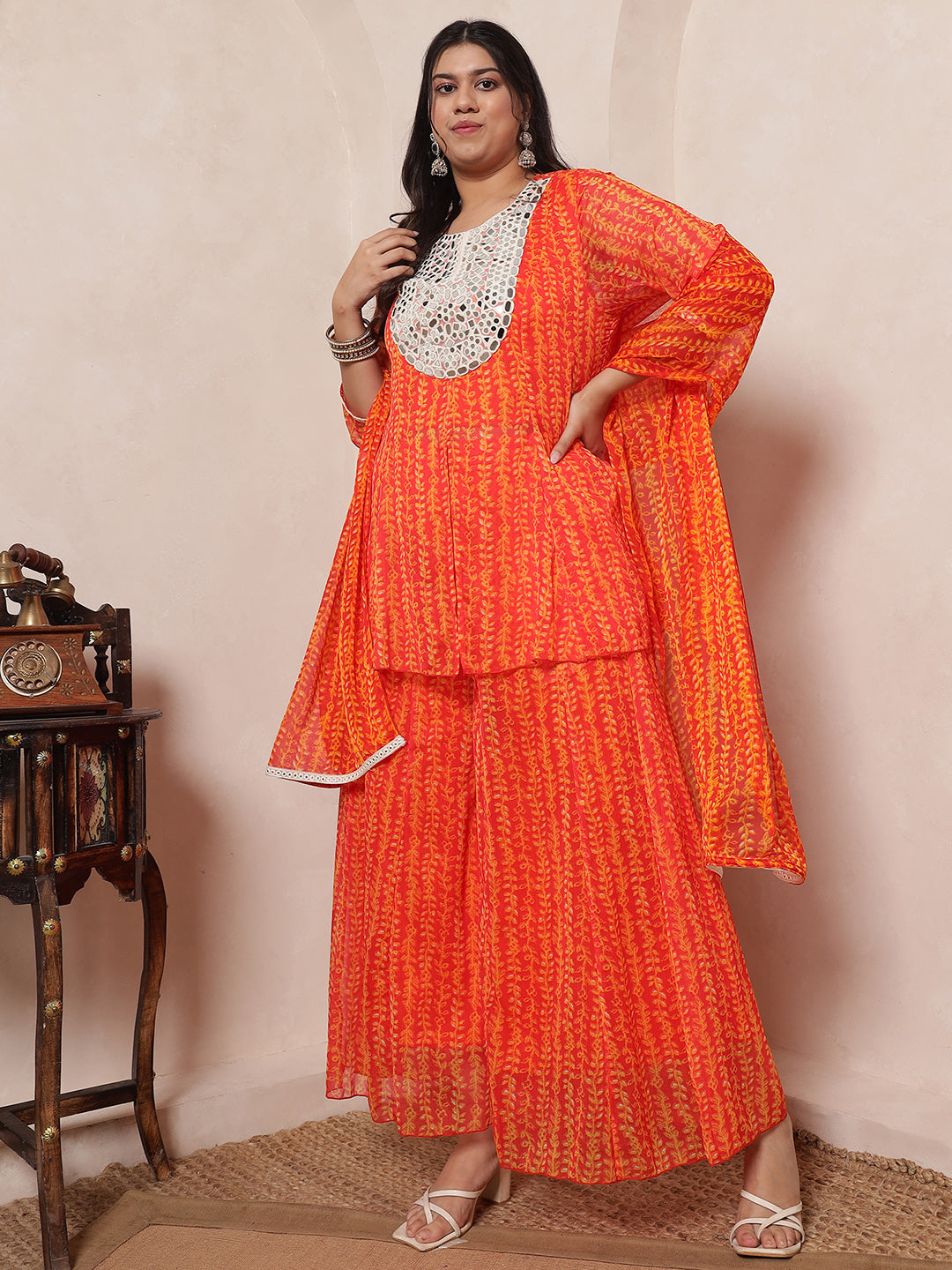 Orange Mirror Embroidered Neck Patch Panel Top With Panel Sharara With Dupatta Indo Western Women's Plus Size Co-Ord Set
