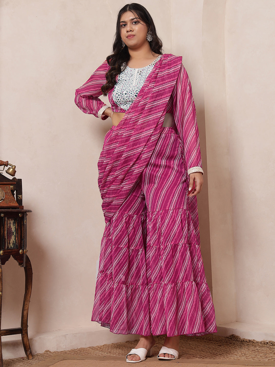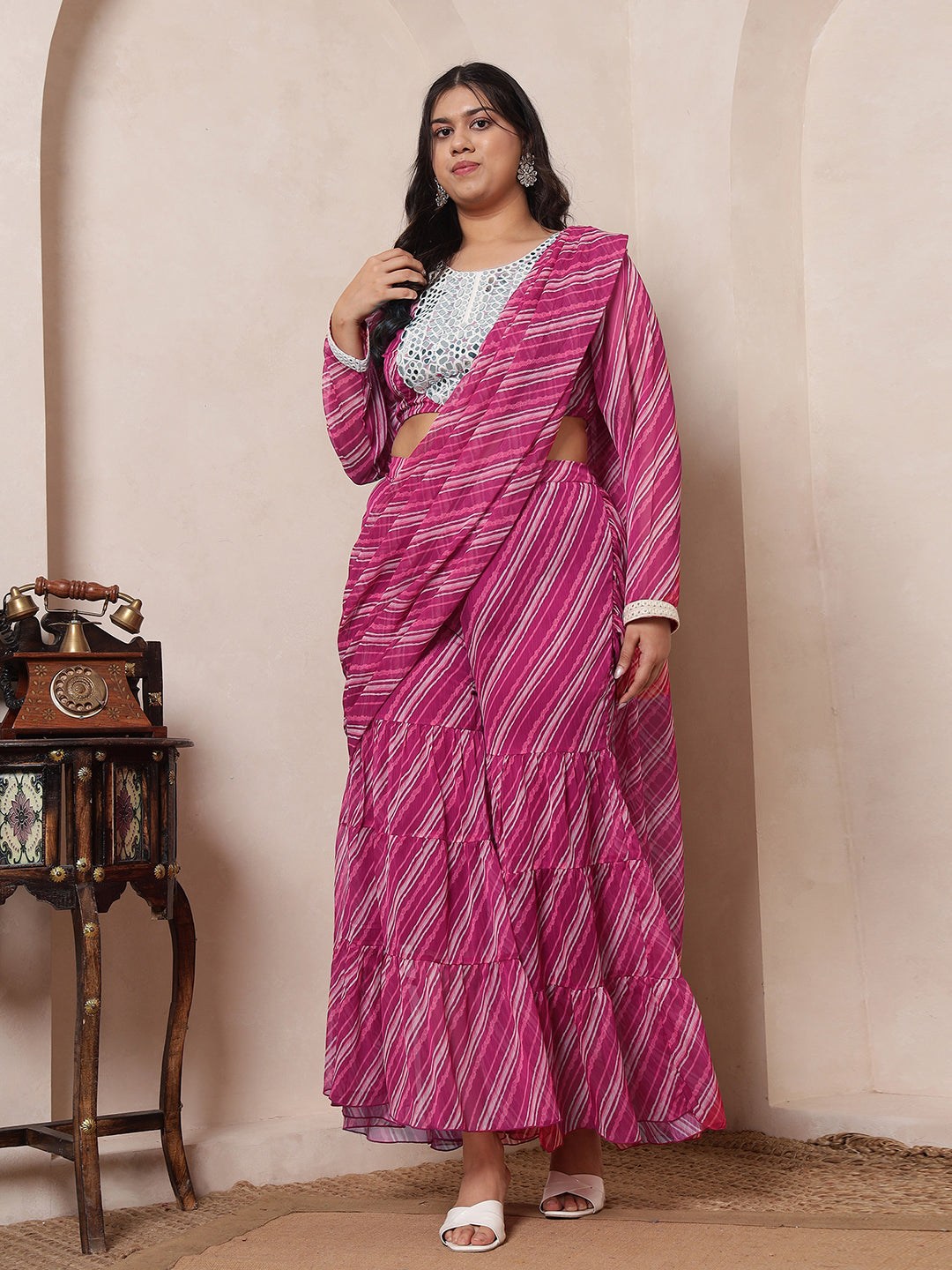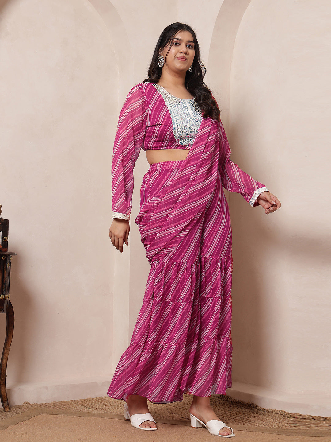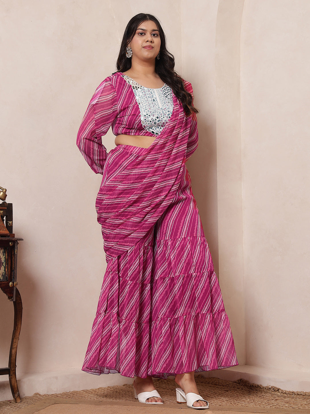 Pink Magenta Laheriya Crop Top With Tiered Sharara Attached Dupatta Women Indo Western Women Co-Ord Set