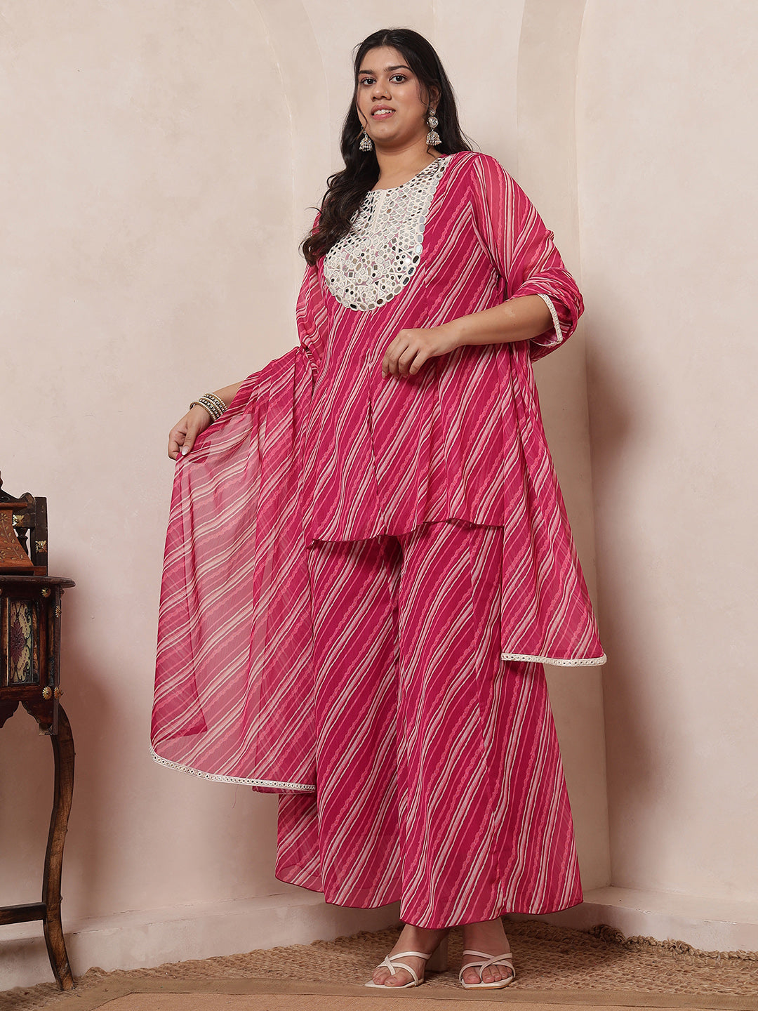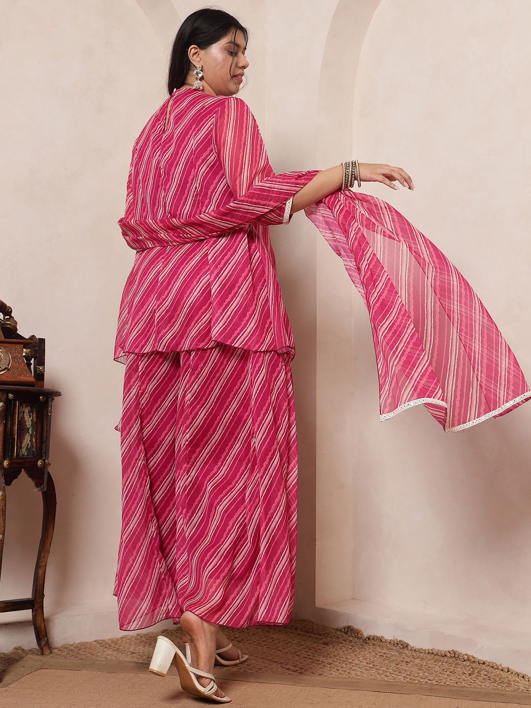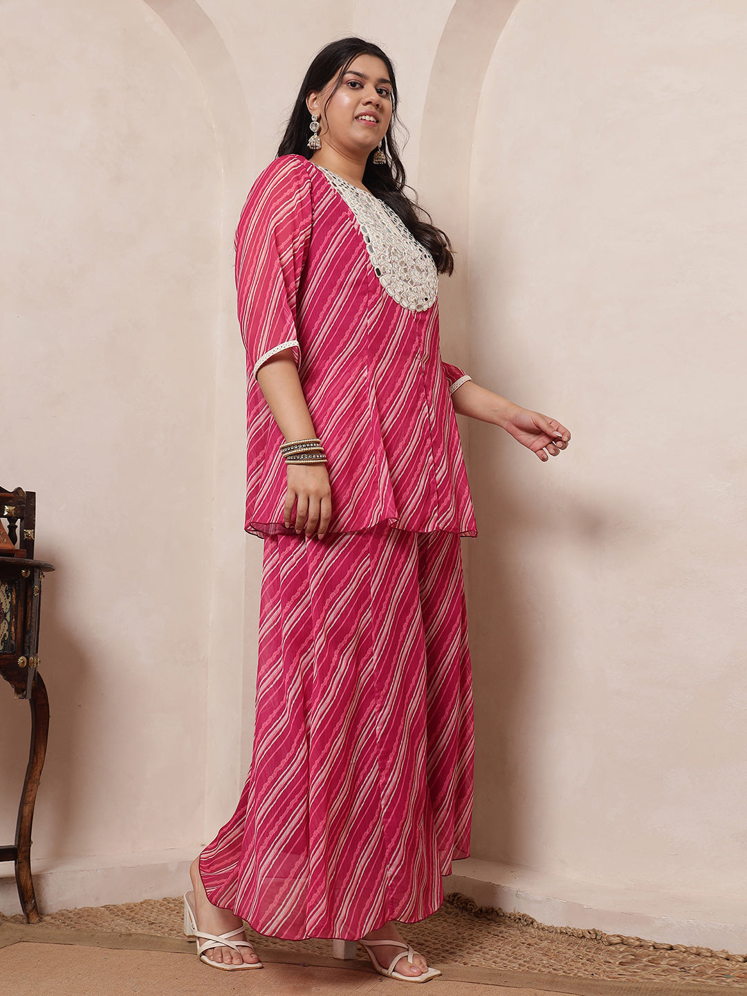 Pink Magenta Laheriya Peplum Embroidered Neck Patch Top With Panel Sharara With Dupatta Women Indo Western Co-Ord Set