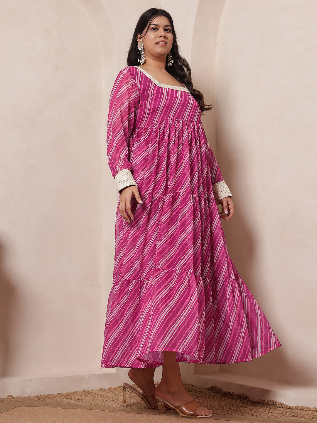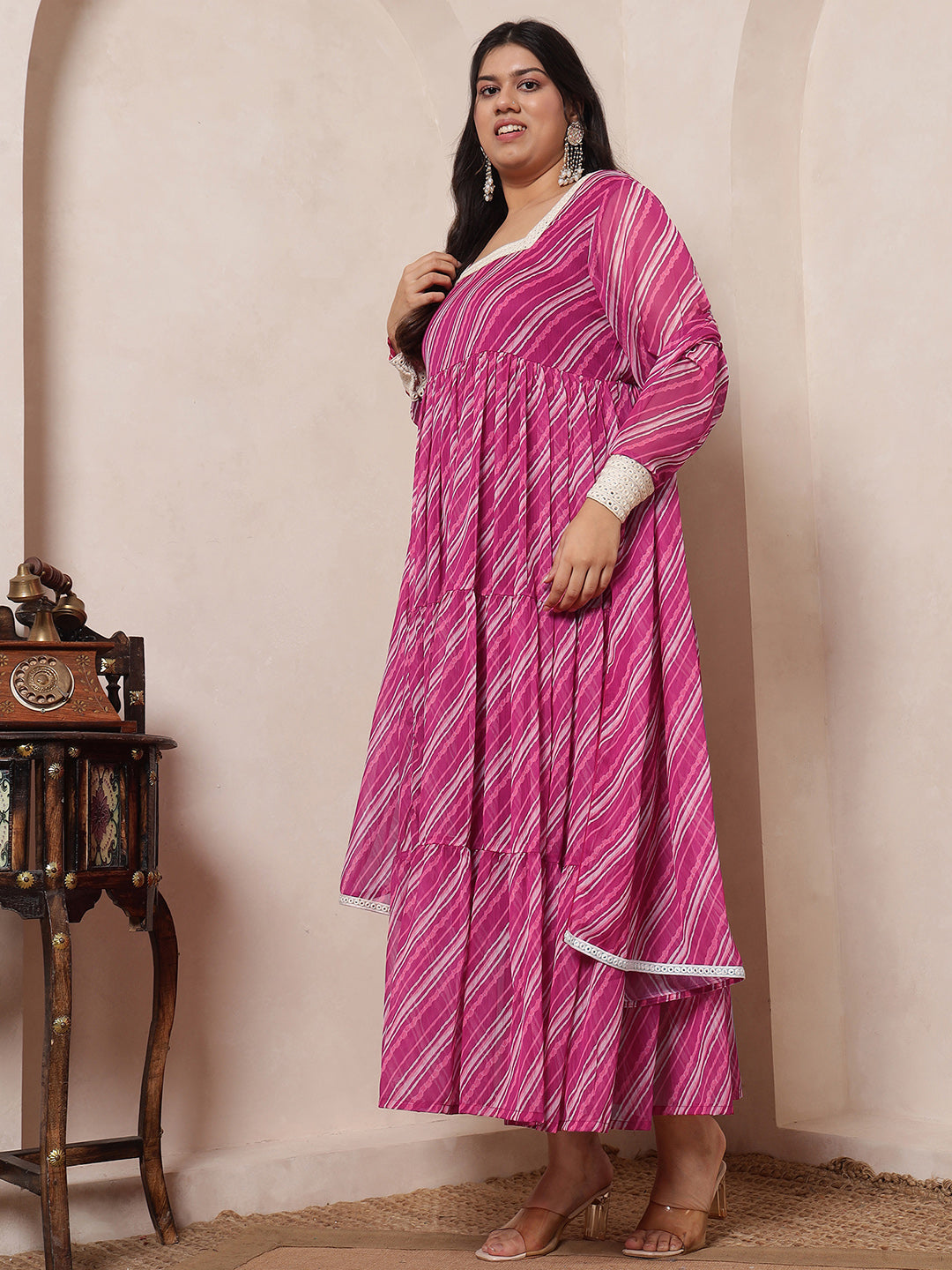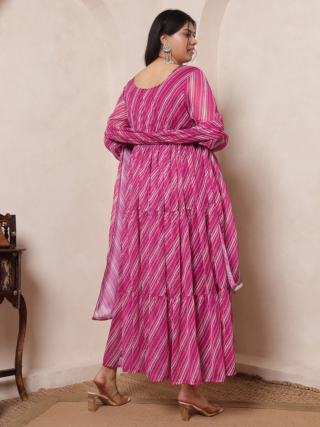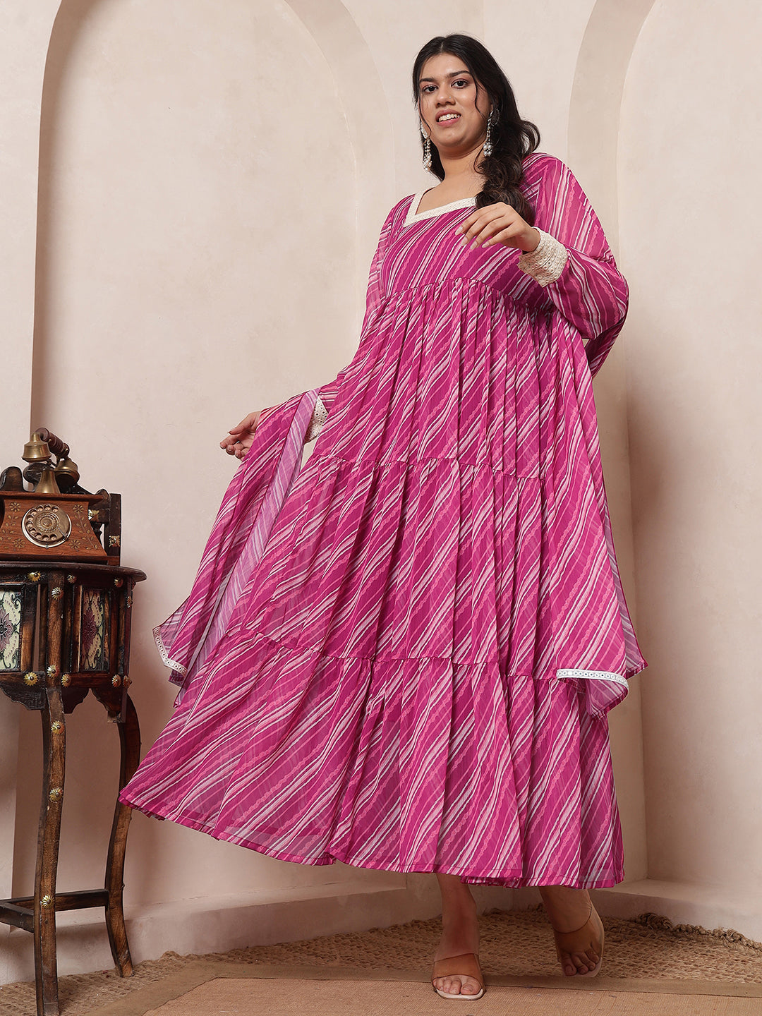 Pink Magenta Laheriya Tiered Ethnic Kurta With Dupatta For Women