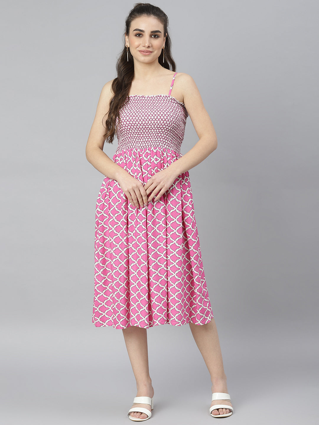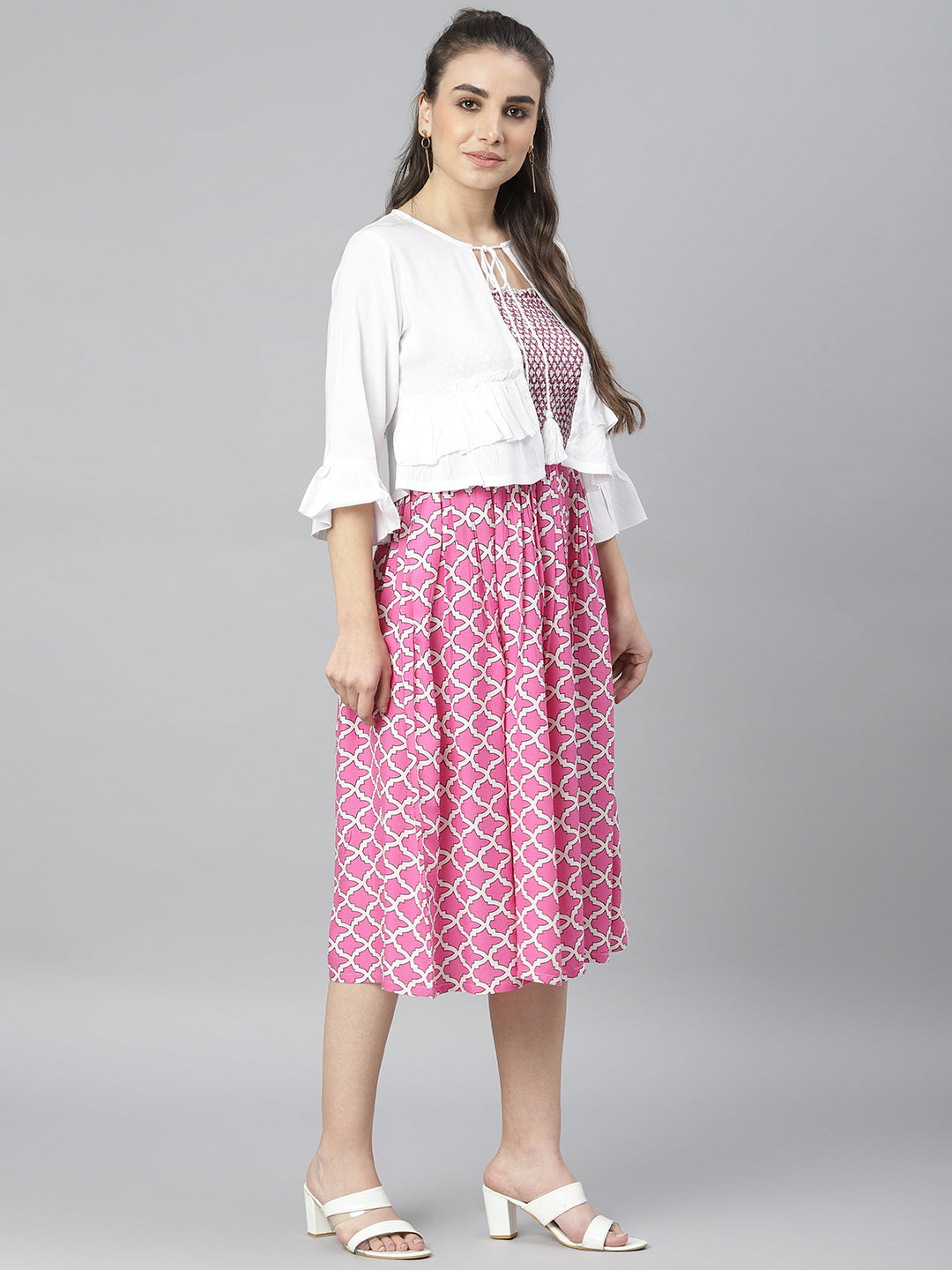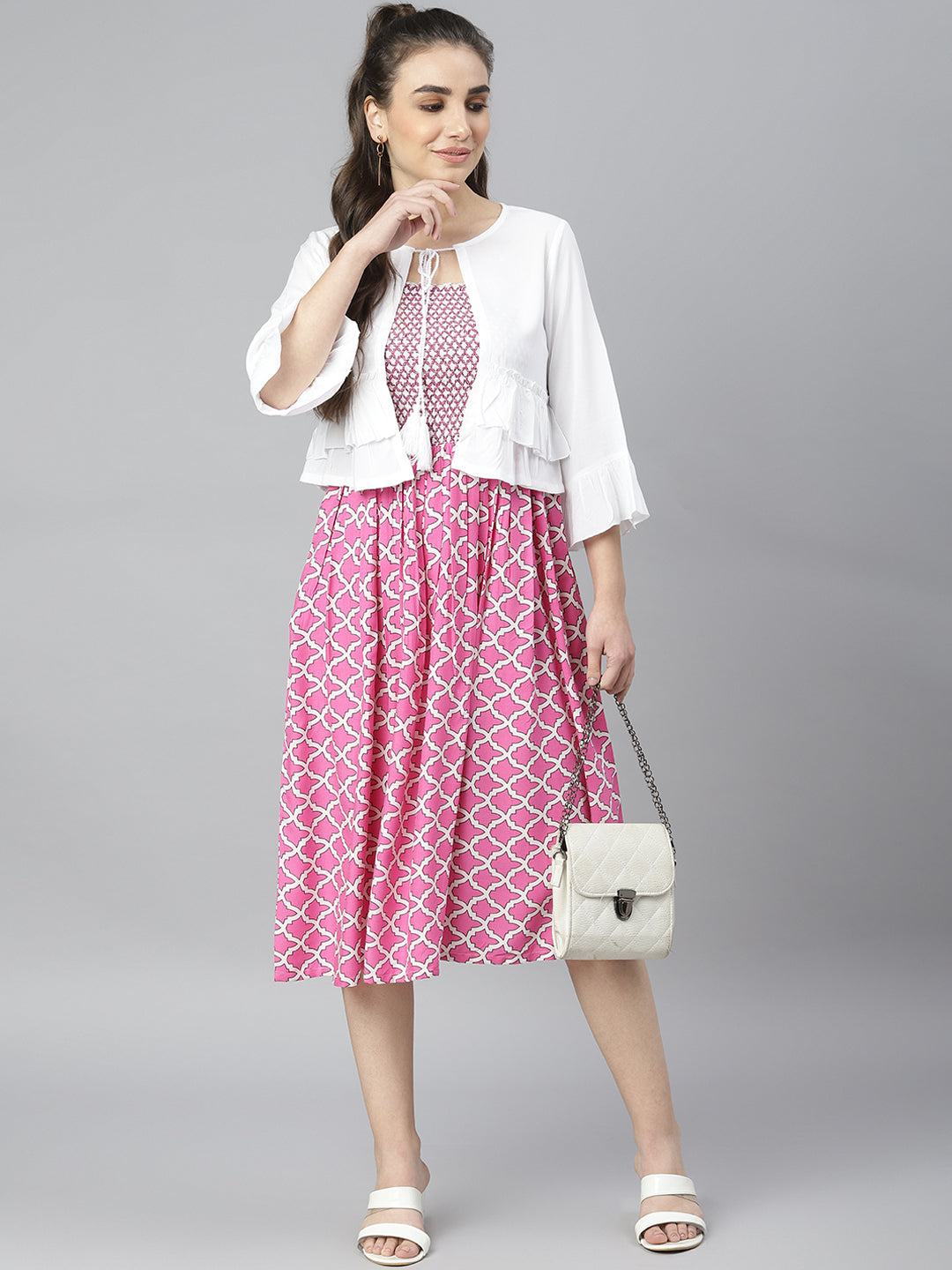 This pink and white dress comes with a beautiful geometric print which gives it a rather feminine appeal. It comes with a white shrug which has frills and a dori tie-up. Fabricated from premium fabric, this dress for women is all about comfort and flared fits. This fit flare dress is perfect for any season. This dress for women comes with straps which is a must have staple for any girl. It also comes with a smocking detail which gives it an extra stretch and perfect fit This women stylish dress has to be your closet essential this season. This dress is versatile and is suitable for any body type. You can style this dress for women with mules, a mini shoulder bag , let your hair and you will be all set to make those heads turn. This cotton dress can be worn for a casual day-out, beach party , your college and so much more. This dress is a must-have design for every girl, buy it now to make a fashion statement.