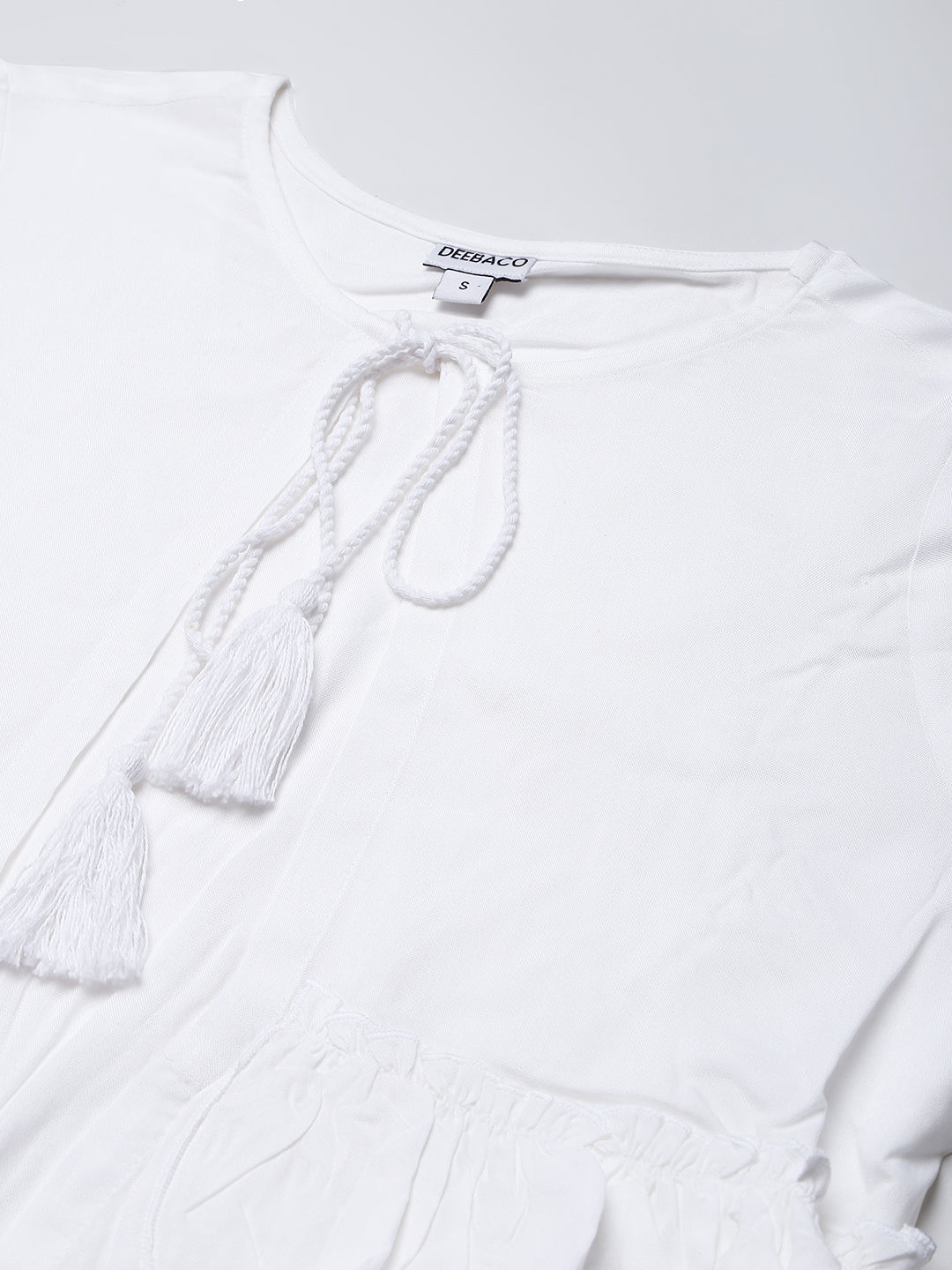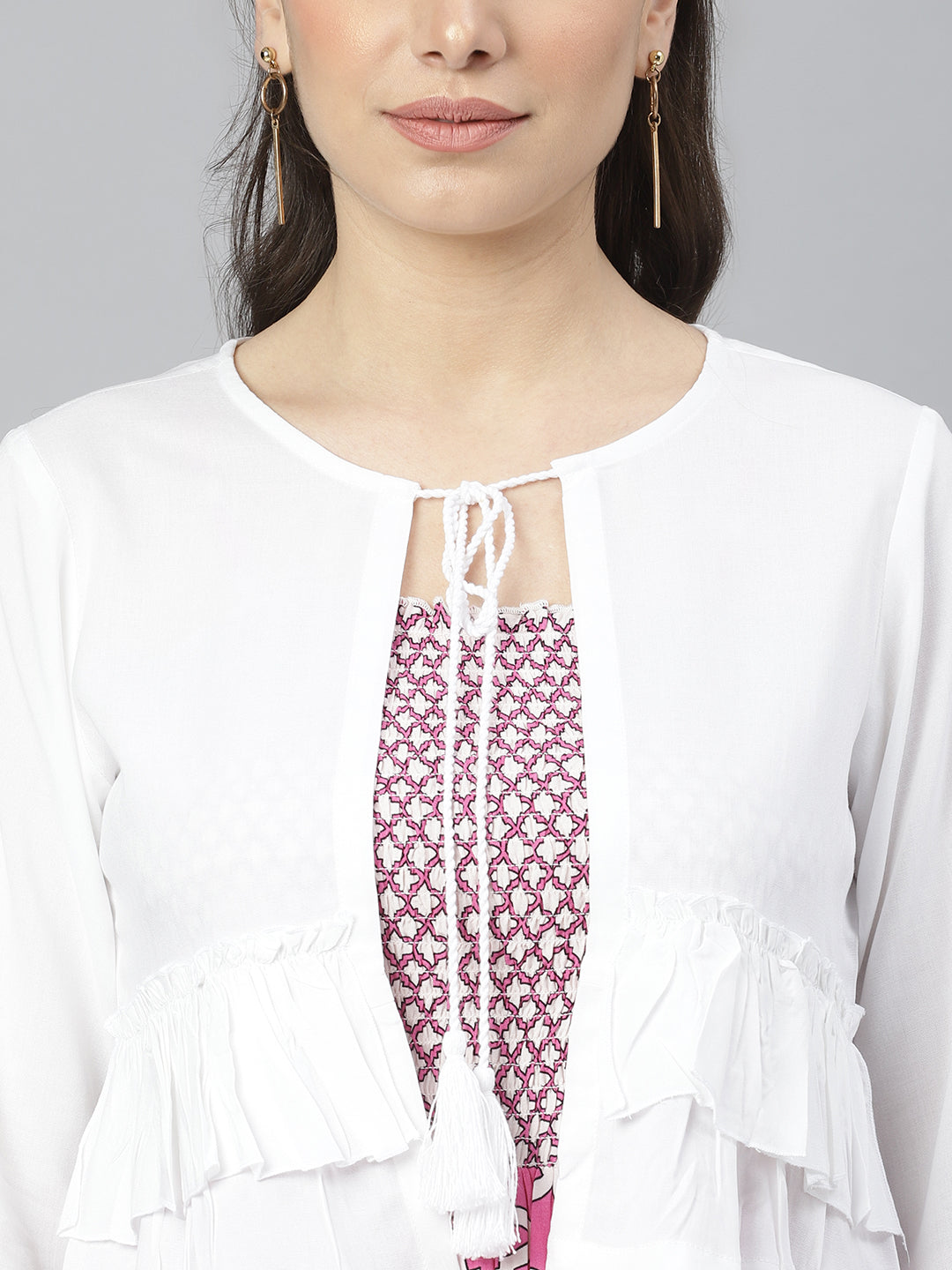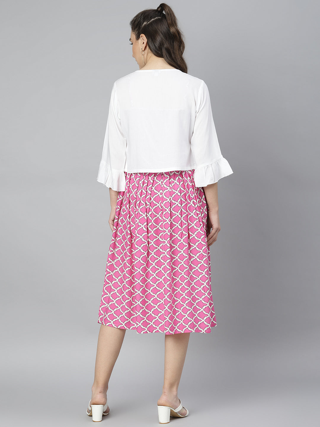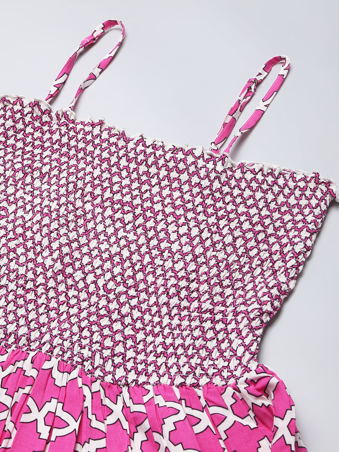 This pink and white dress comes with a beautiful geometric print which gives it a rather feminine appeal. It comes with a white shrug which has frills and a dori tie-up. Fabricated from premium fabric, this dress for women is all about comfort and flared fits. This fit flare dress is perfect for any season. This dress for women comes with straps which is a must have staple for any girl. It also comes with a smocking detail which gives it an extra stretch and perfect fit This women stylish dress has to be your closet essential this season. This dress is versatile and is suitable for any body type. You can style this dress for women with mules, a mini shoulder bag , let your hair and you will be all set to make those heads turn. This cotton dress can be worn for a casual day-out, beach party , your college and so much more. This dress is a must-have design for every girl, buy it now to make a fashion statement.