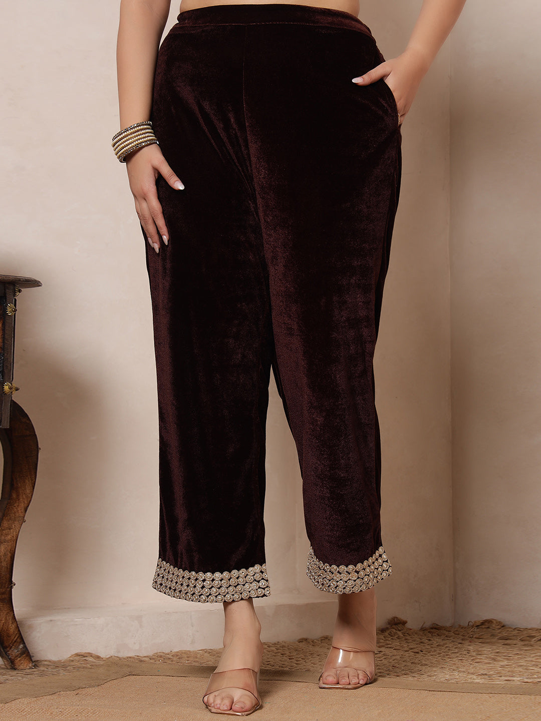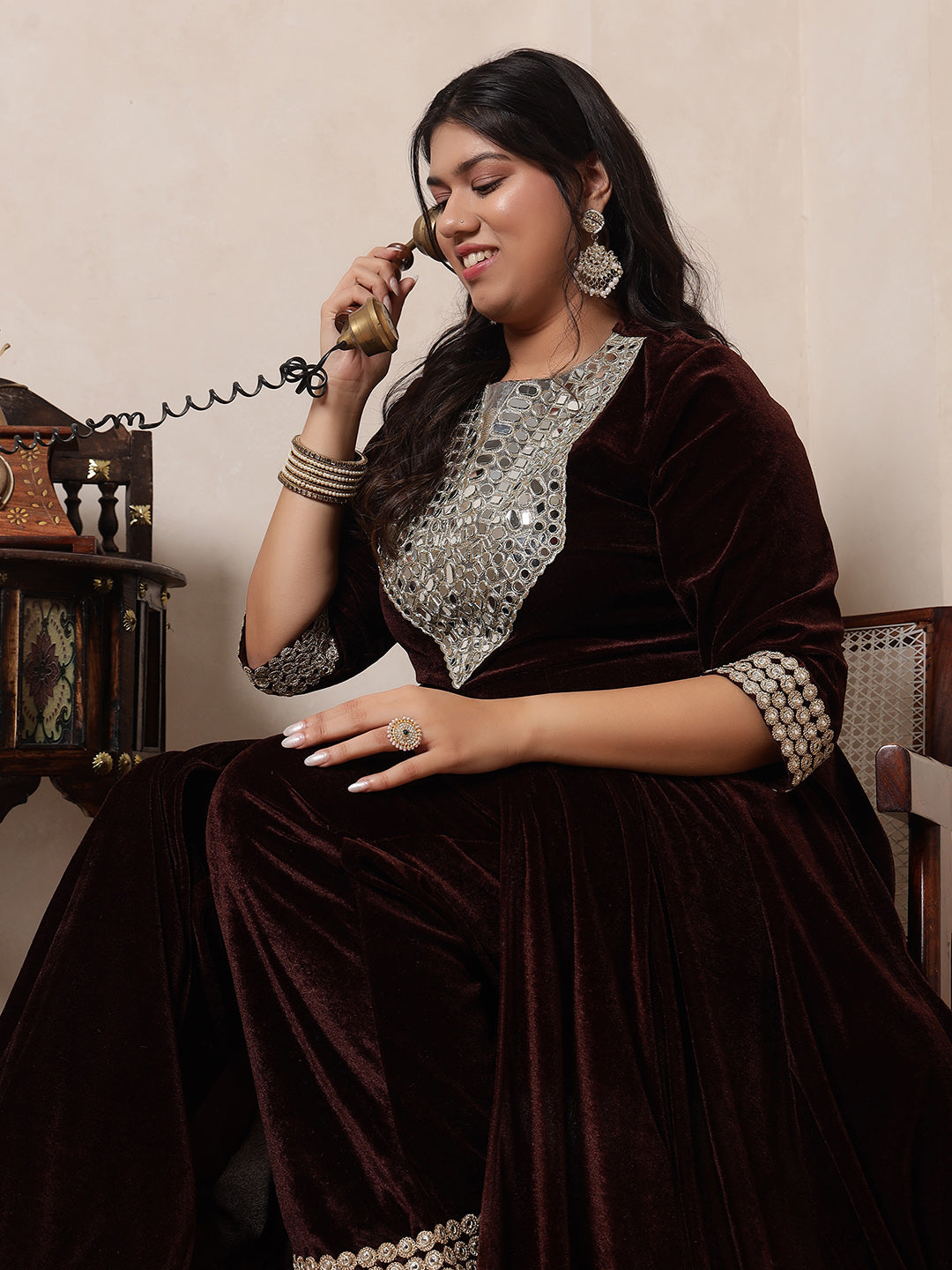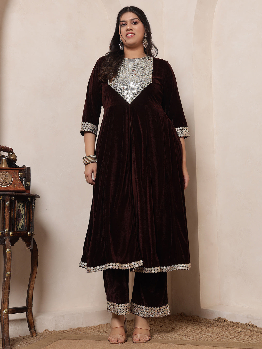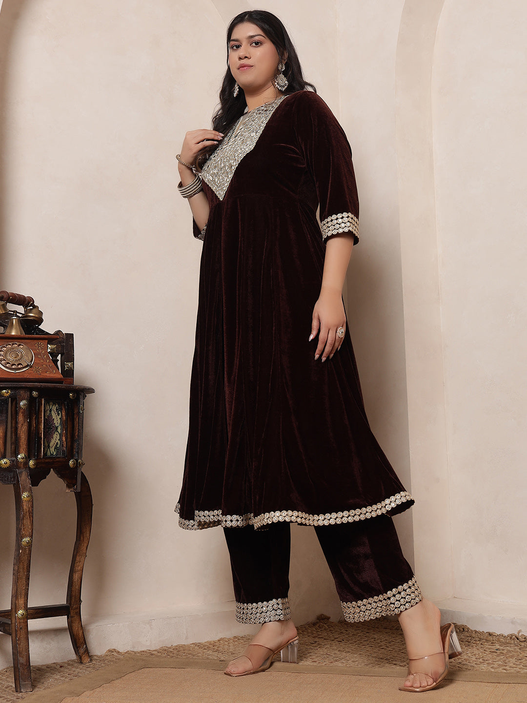 Velvet Brown Anarkali Tunic With Embroidered Neck Patch Tunic With Palazzo Women Indo Western Co-Ord Set