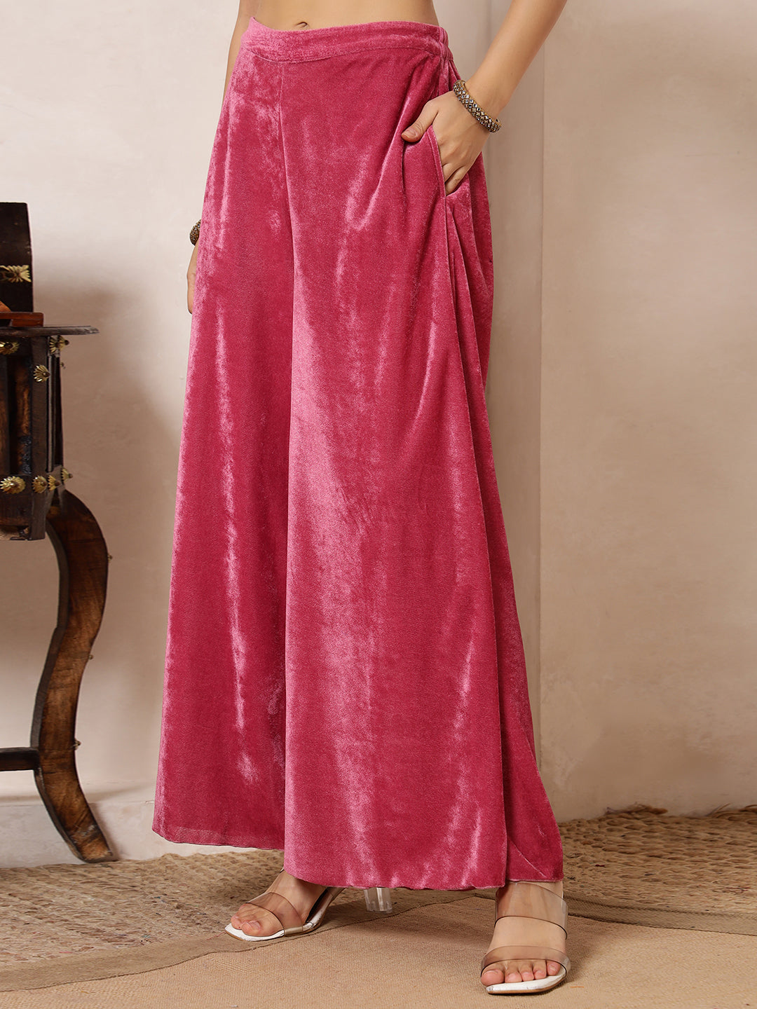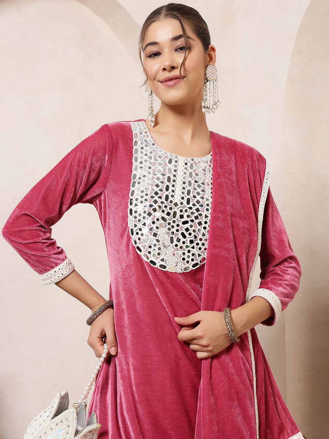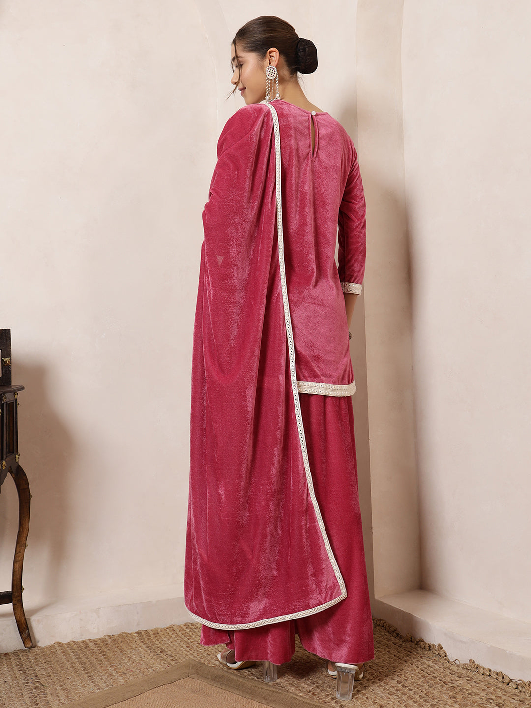Velvet Pink Kurti Embroidered Neck Patch Sharara With Dupatta Indo Western Women Co-Ord Set