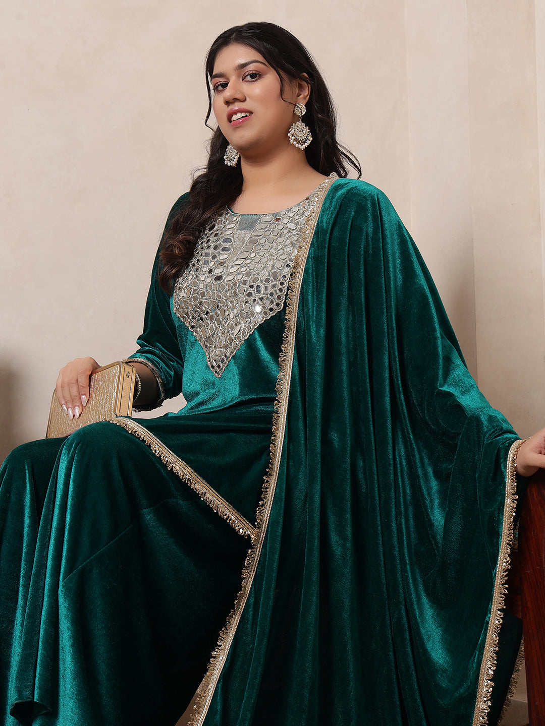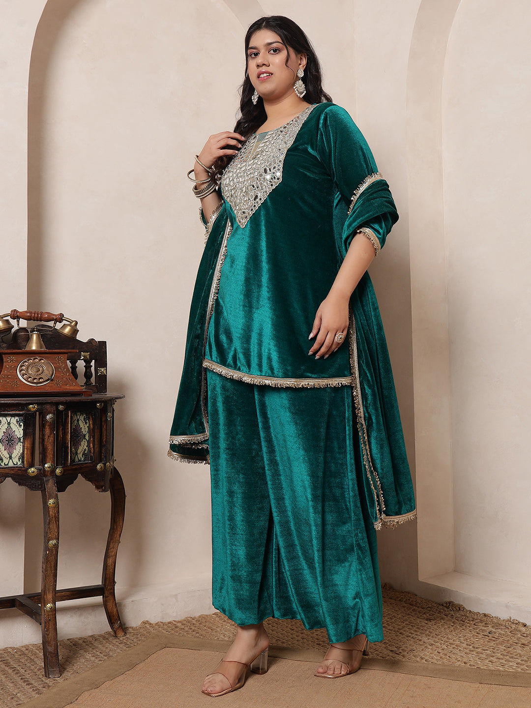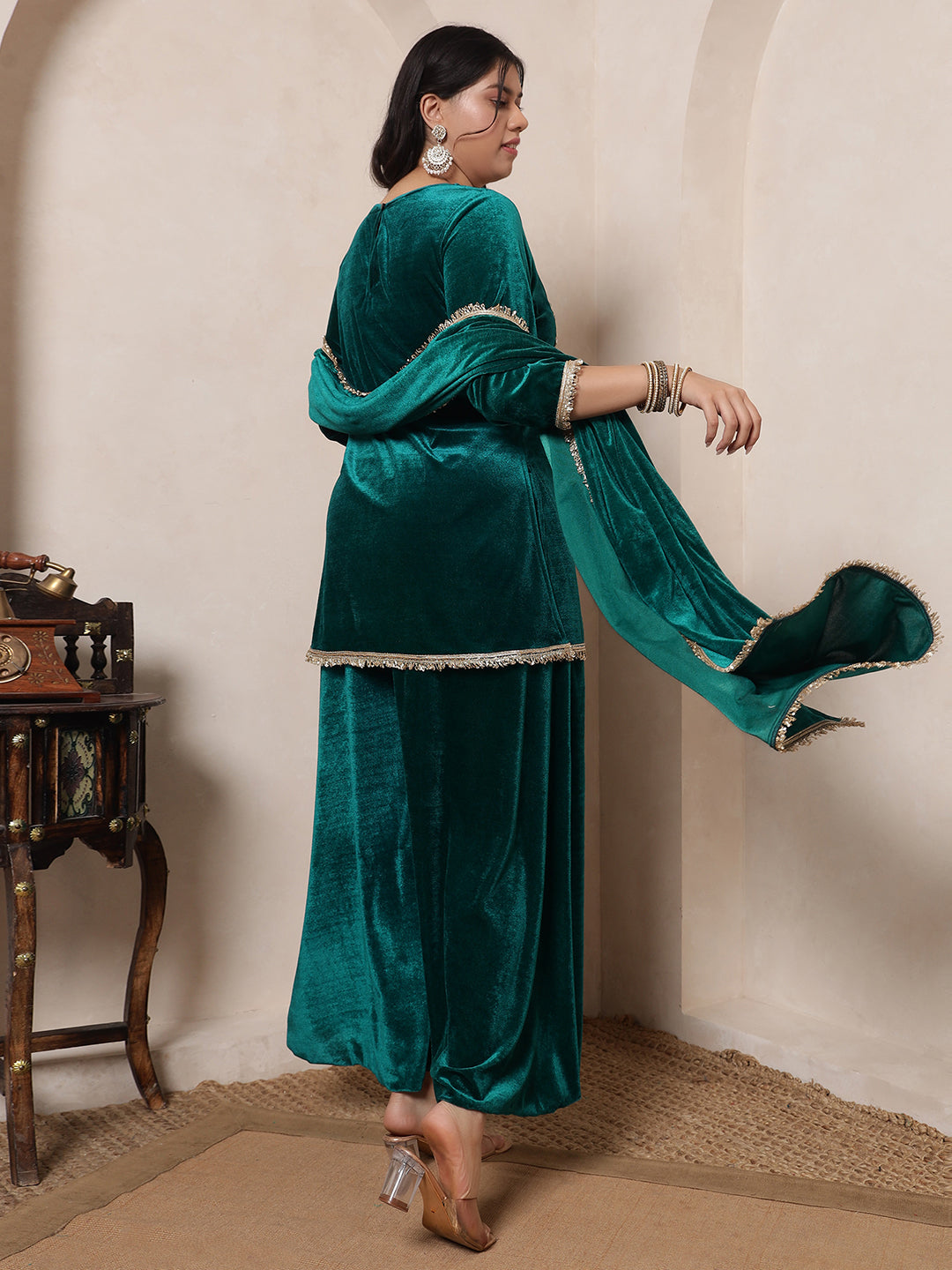 Velvet Rama Green Kurti Embroidered Neck Patch Sharara With Dupatta Women Indo Western Women Co-Ord Set