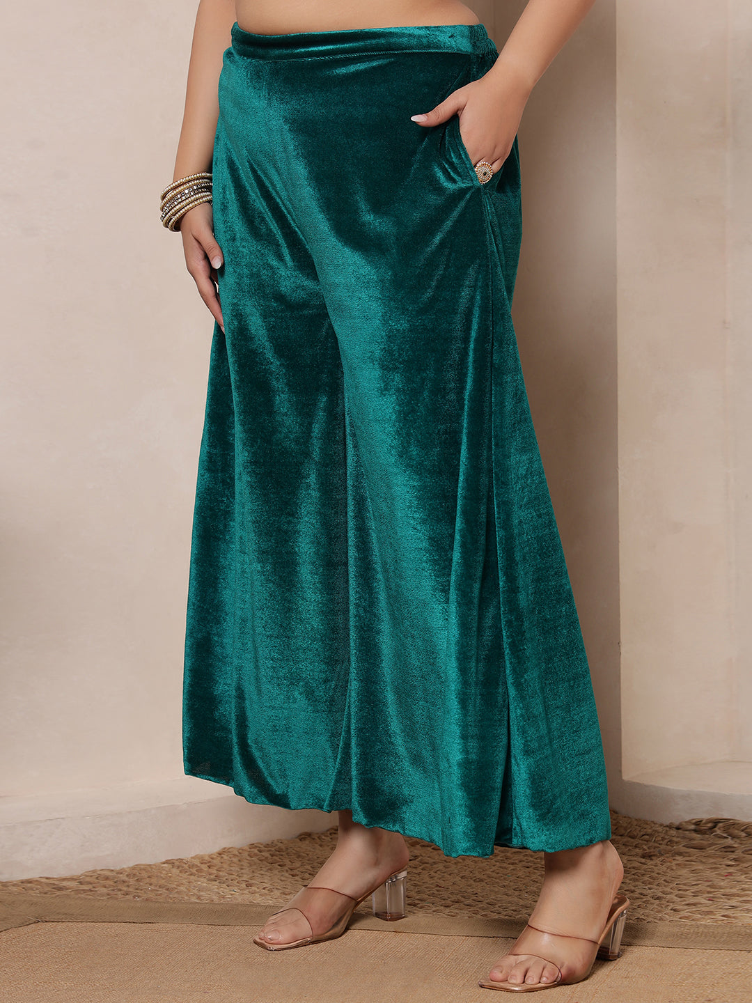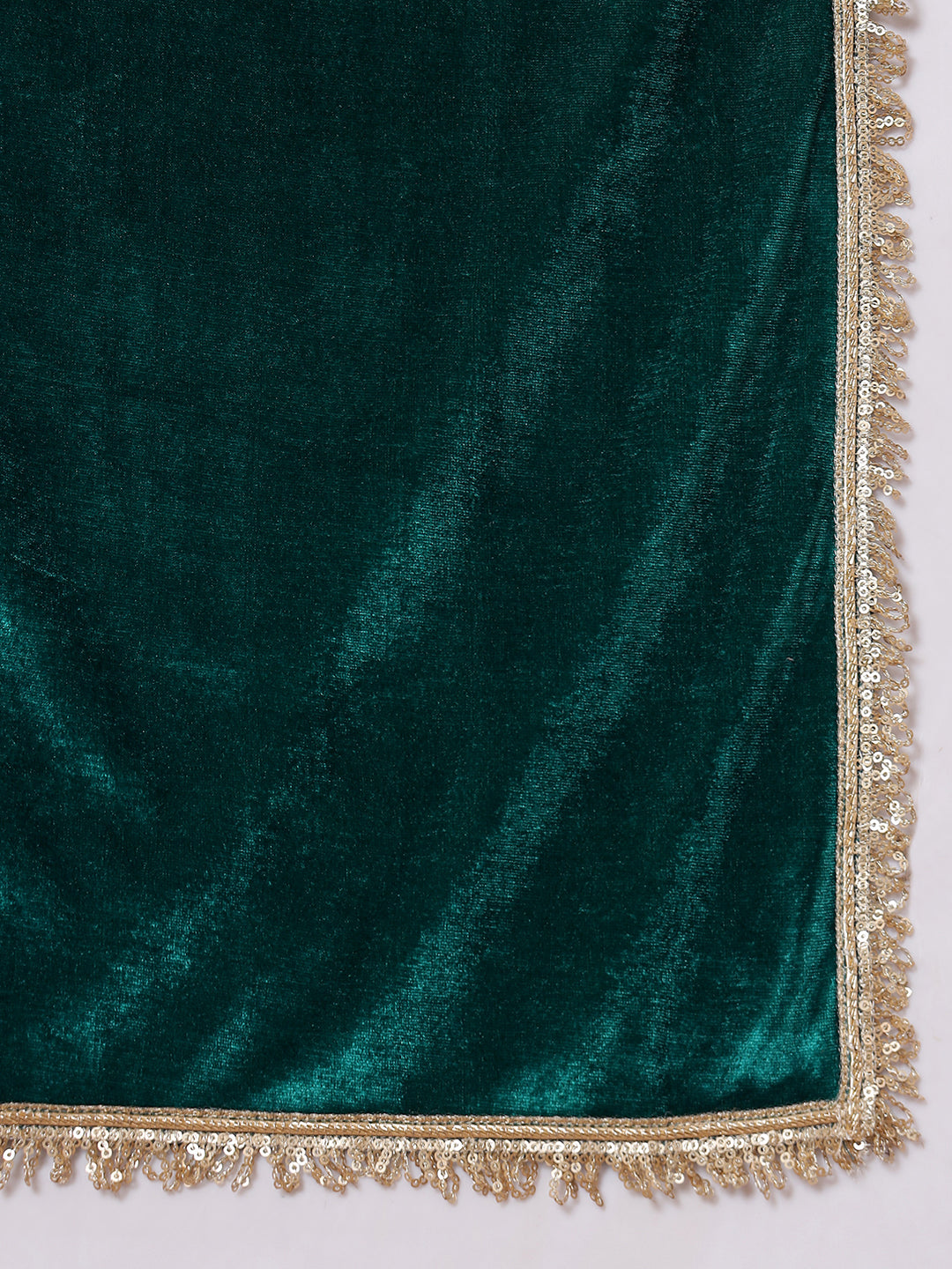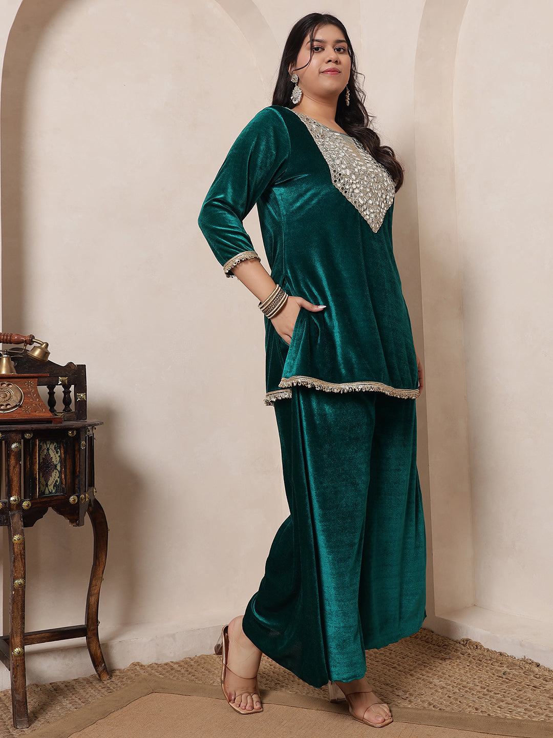 Velvet Rama Green Kurti Embroidered Neck Patch Sharara With Dupatta Women Indo Western Women Co-Ord Set